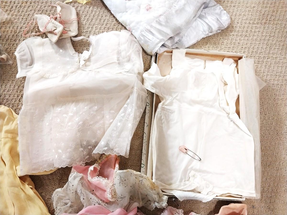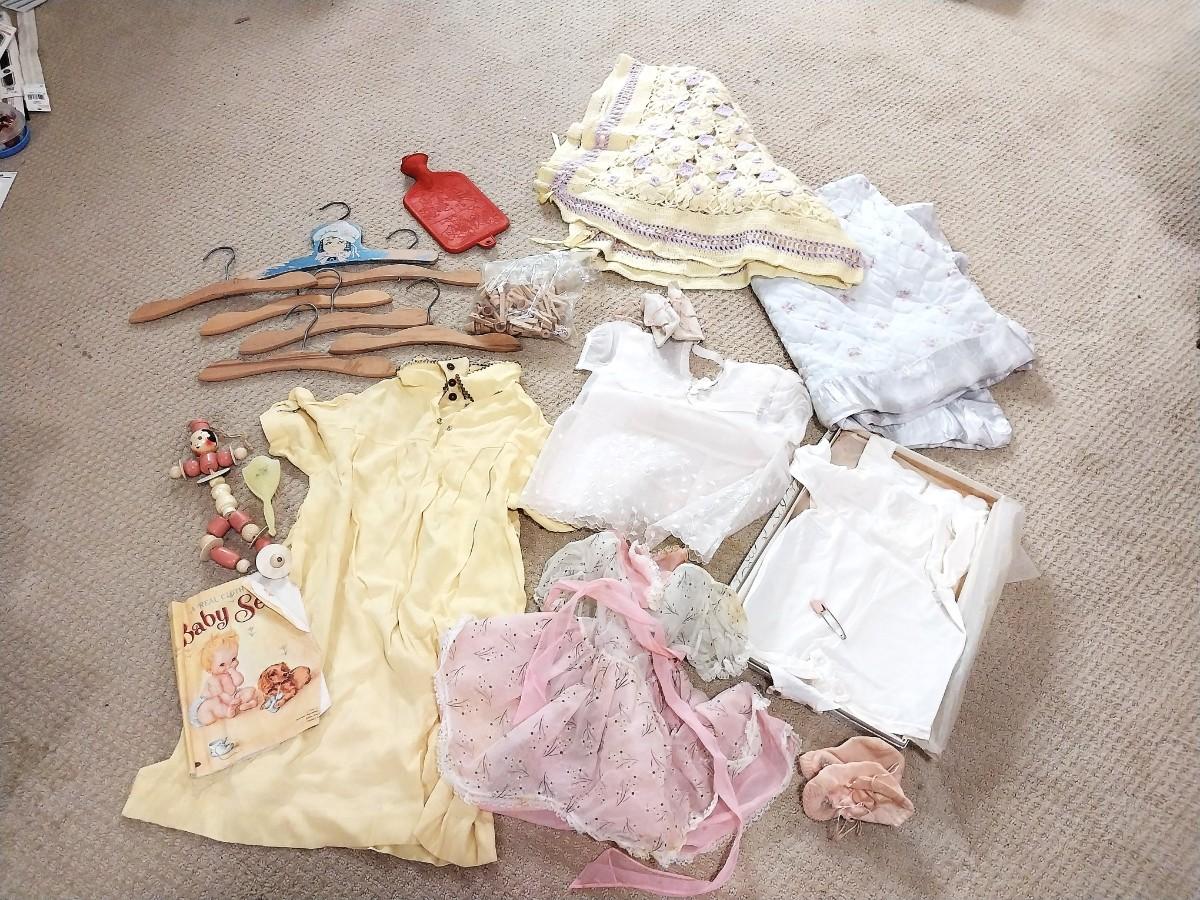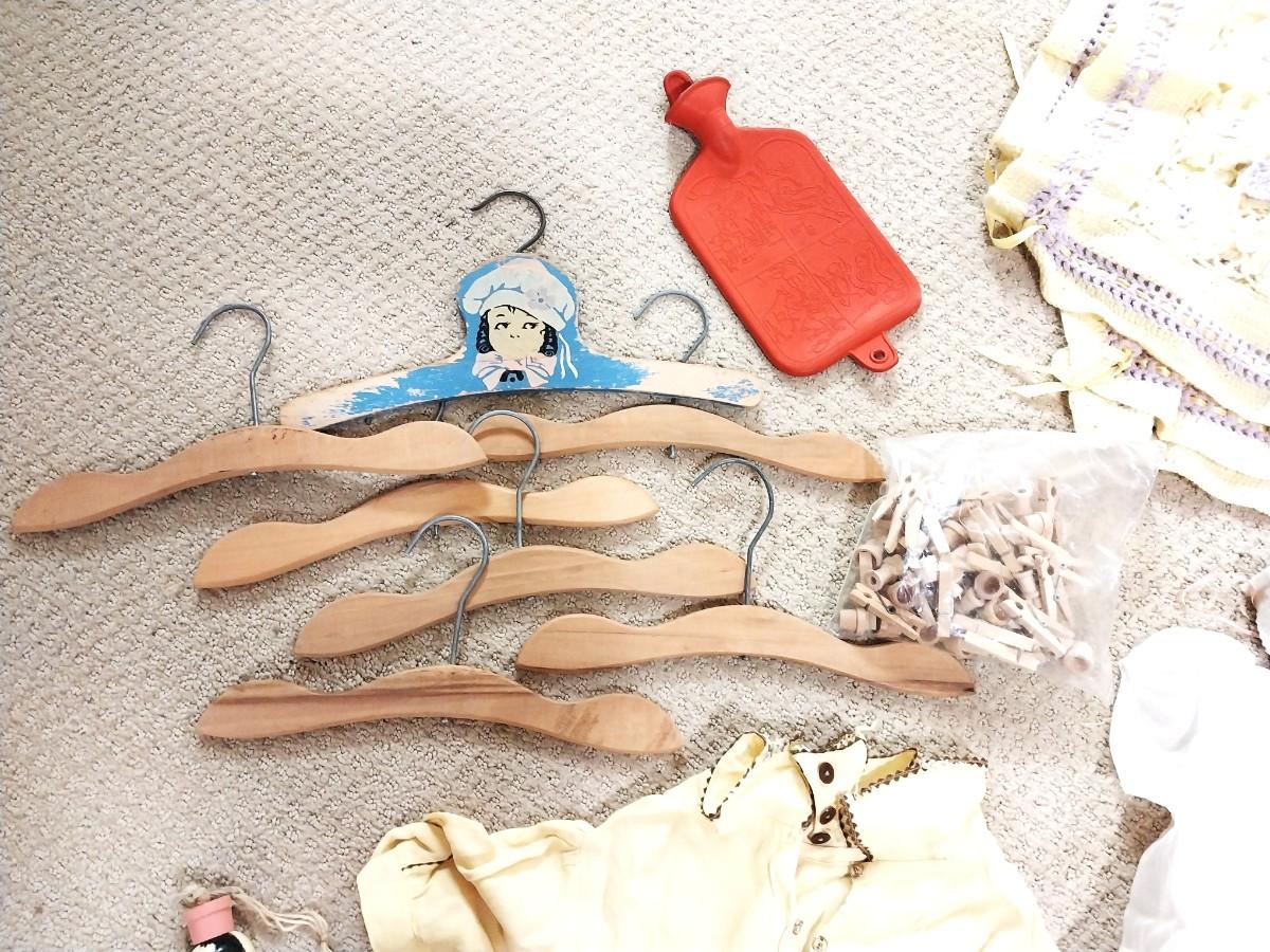 VINTAGE CHILD OUTFITS-HOT WATER BOTTLE-WOODEN CHILD HANGERS AND MORE