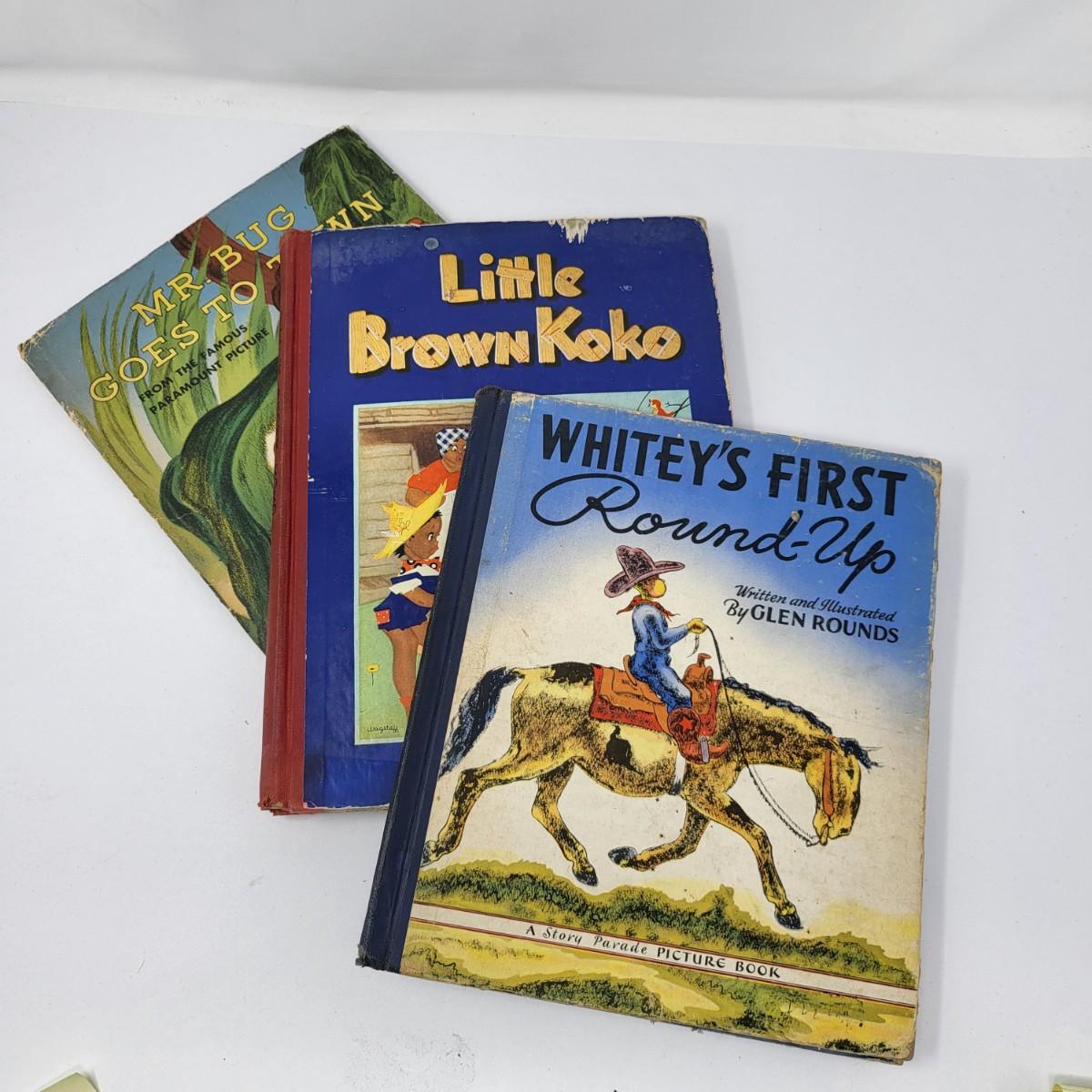 Three vintage childrens's story books: Whitey's First Round-Up (1942), Little Brown Koko (1940), and Mr. Bug Goes To Town (1941). View all photos for condition.