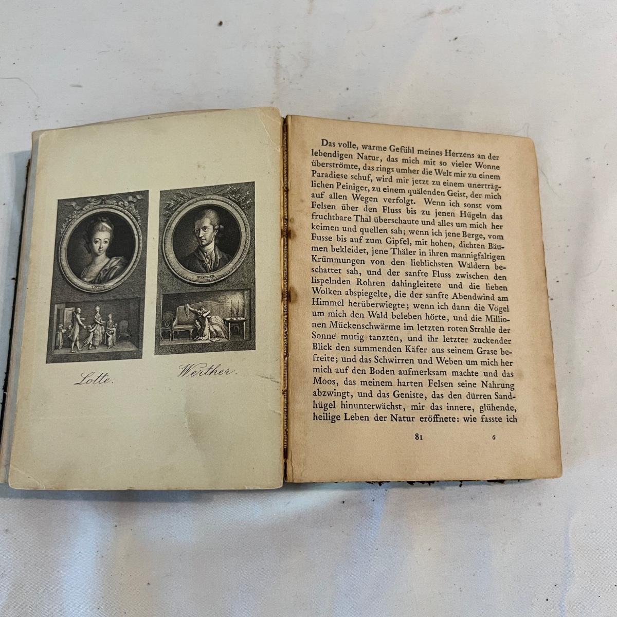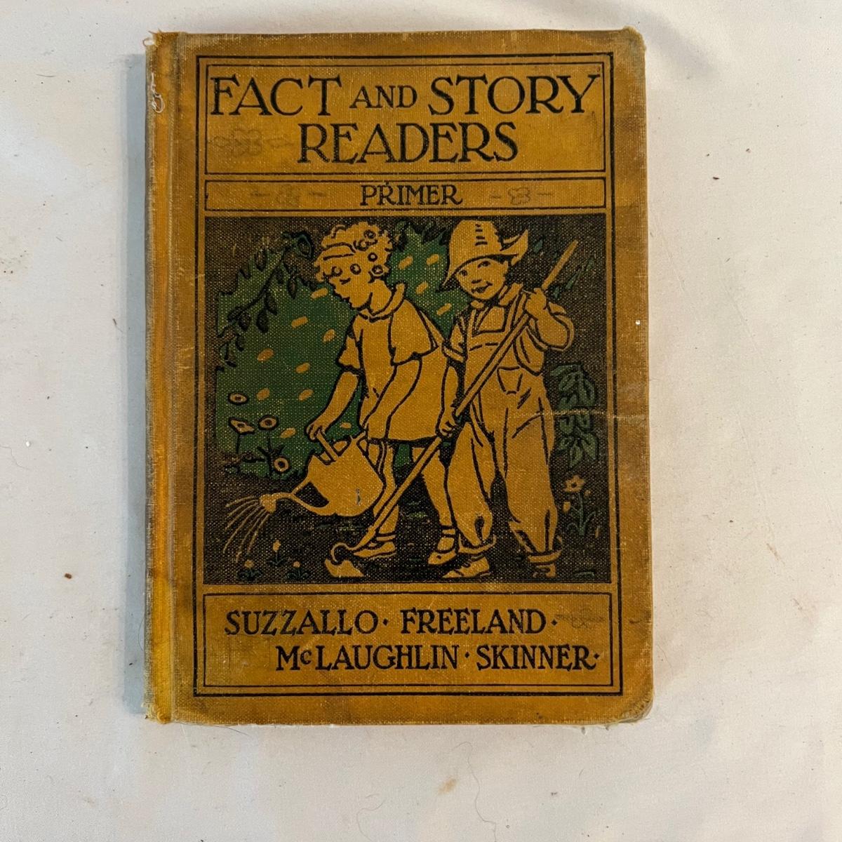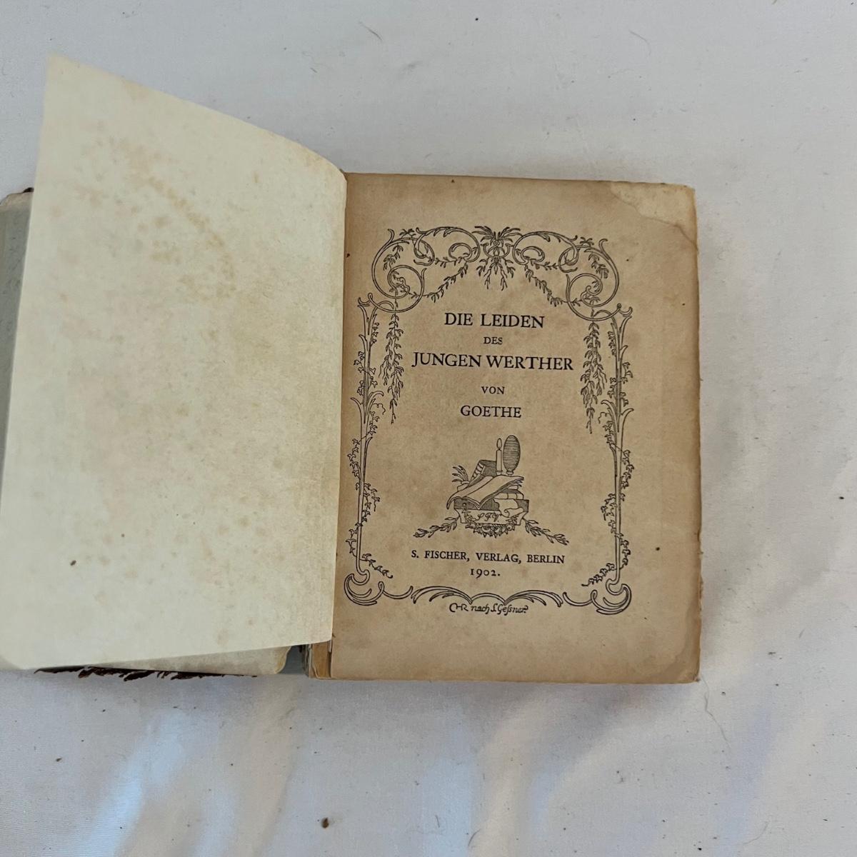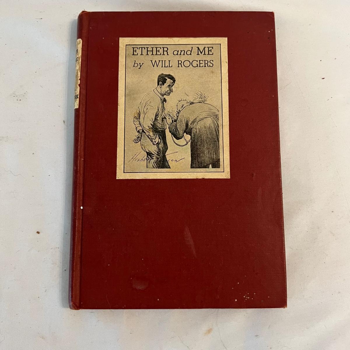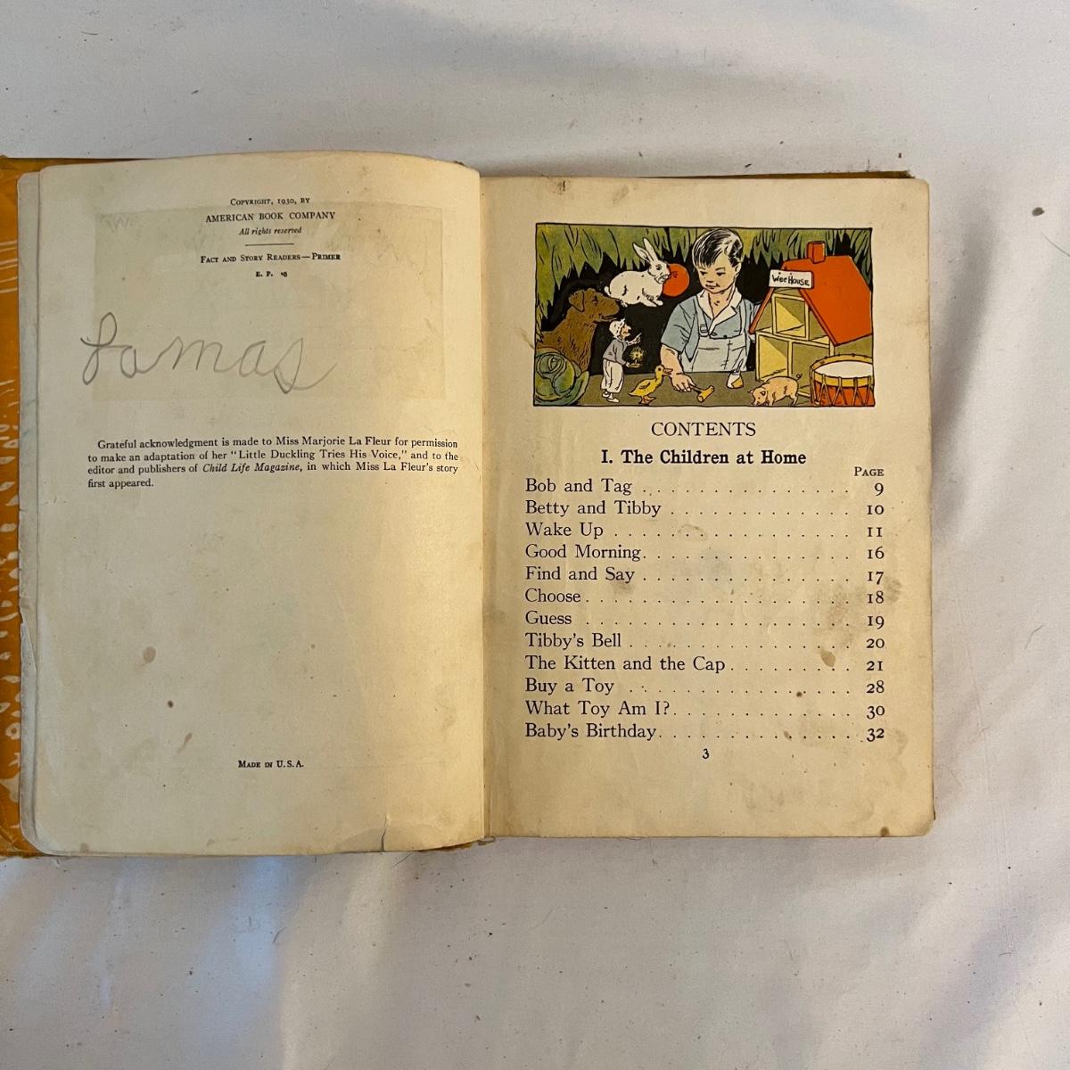 A collection of five books, printed from 1902-1930’s. Facts and Story Readers Primer (copyright 1930), Die Leiden does Jungen Werther Von Goethe (translation The Sorrows of Young Werther by Goethe) with a collection of old stamps inside, Child Library Reader (copyright 1925), Bob and Judy (copyright 1936), and Ether and Me by Will Rogers (copyright 1929).