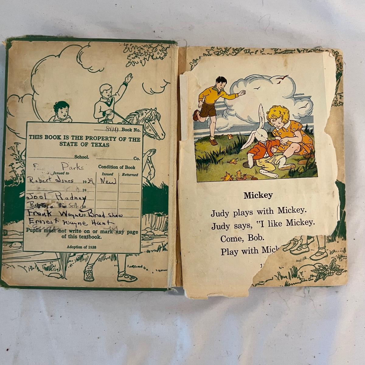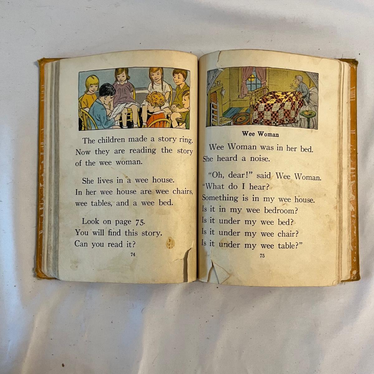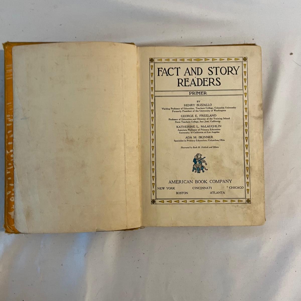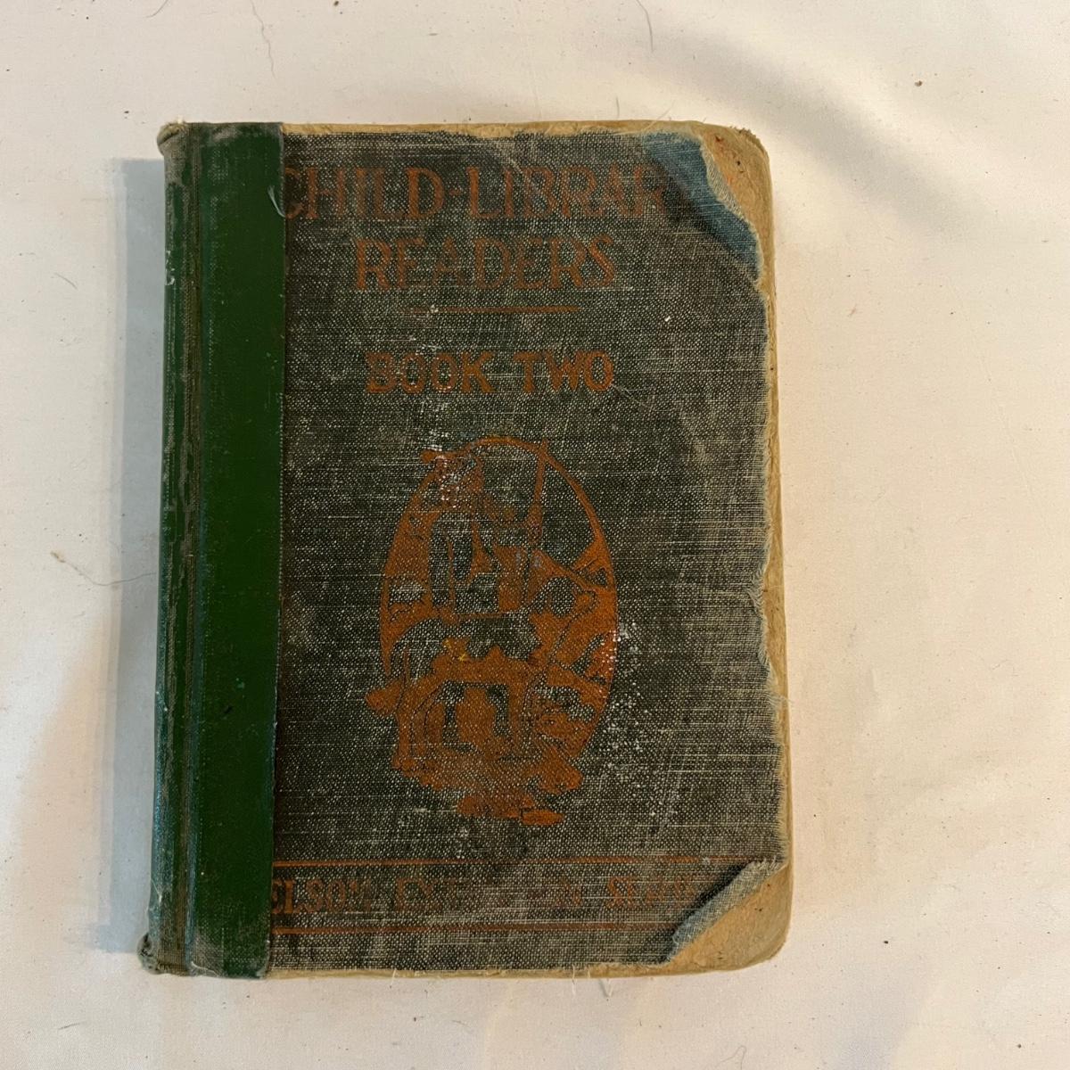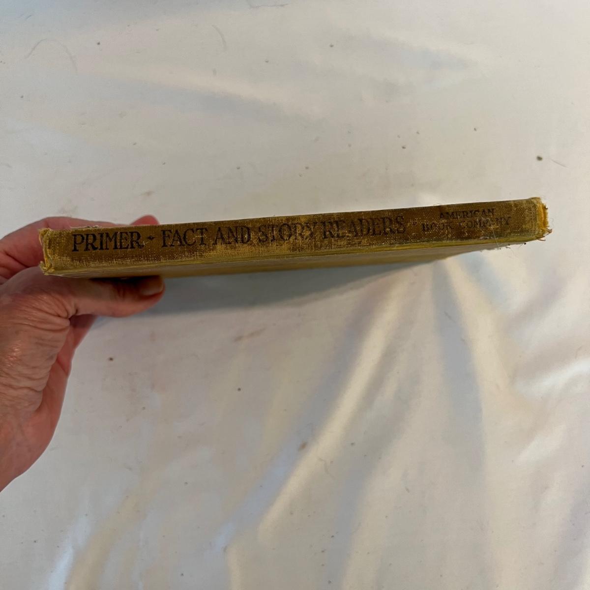 A collection of five books, printed from 1902-1930’s. Facts and Story Readers Primer (copyright 1930), Die Leiden does Jungen Werther Von Goethe (translation The Sorrows of Young Werther by Goethe) with a collection of old stamps inside, Child Library Reader (copyright 1925), Bob and Judy (copyright 1936), and Ether and Me by Will Rogers (copyright 1929).