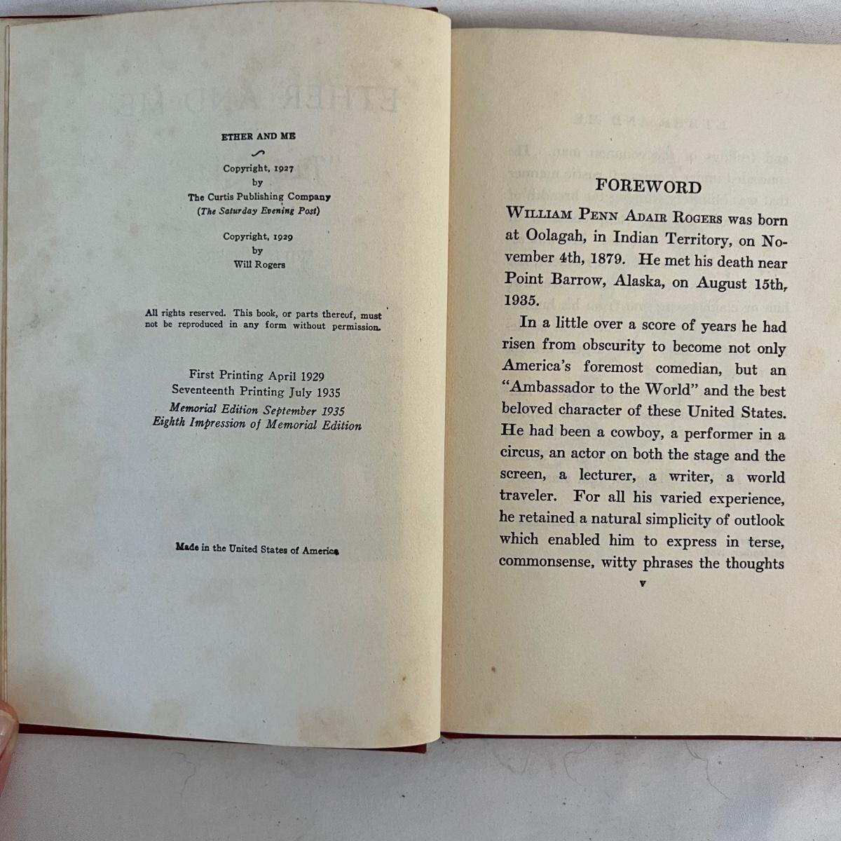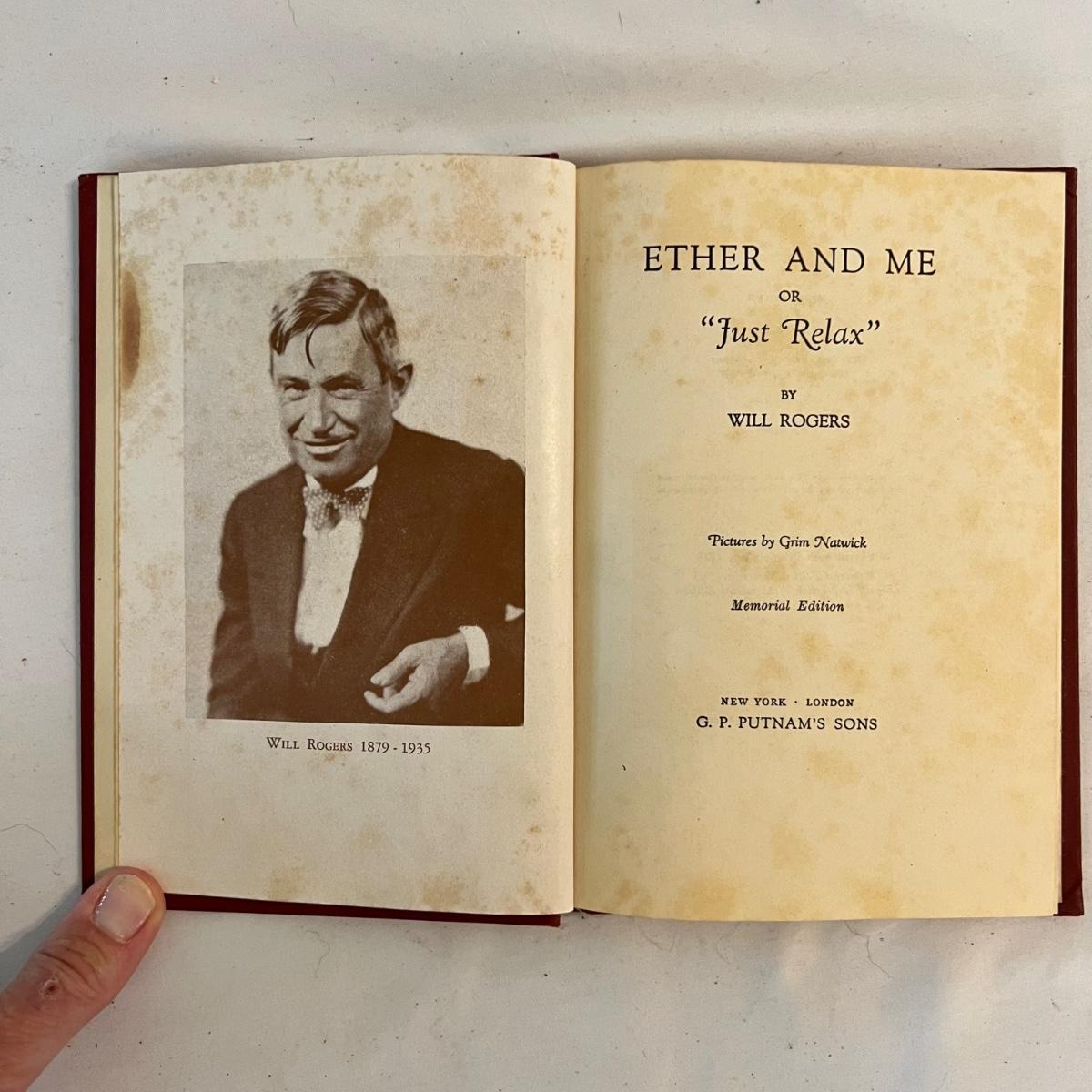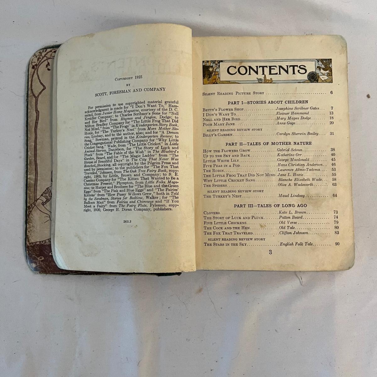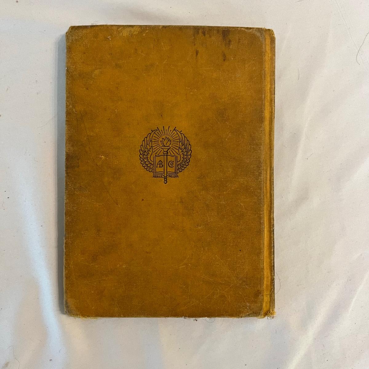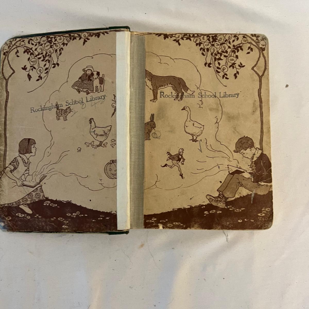 A collection of five books, printed from 1902-1930’s. Facts and Story Readers Primer (copyright 1930), Die Leiden does Jungen Werther Von Goethe (translation The Sorrows of Young Werther by Goethe) with a collection of old stamps inside, Child Library Reader (copyright 1925), Bob and Judy (copyright 1936), and Ether and Me by Will Rogers (copyright 1929).