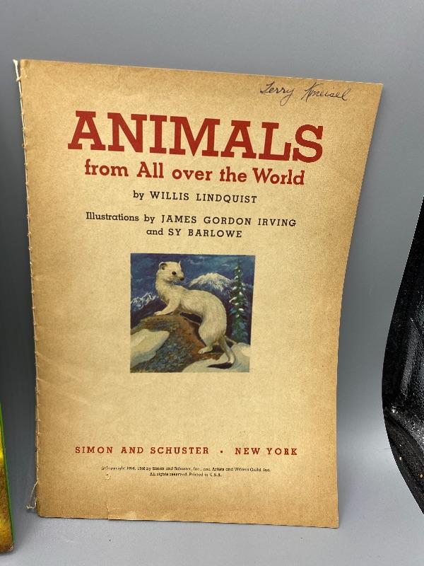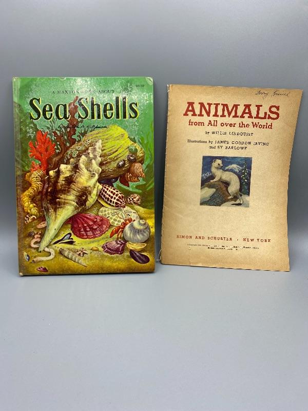 Pair of vintage children's books. Animals from All over the World is a paper book, has colored and b&w illustrations, and dated 1956. The pages are torn at the lower spine. The other book is A Maxton Book about Sea Shells. Hardback book, has colored and B&W illustrations, dated 1954. Both have a previous owner name written on it.