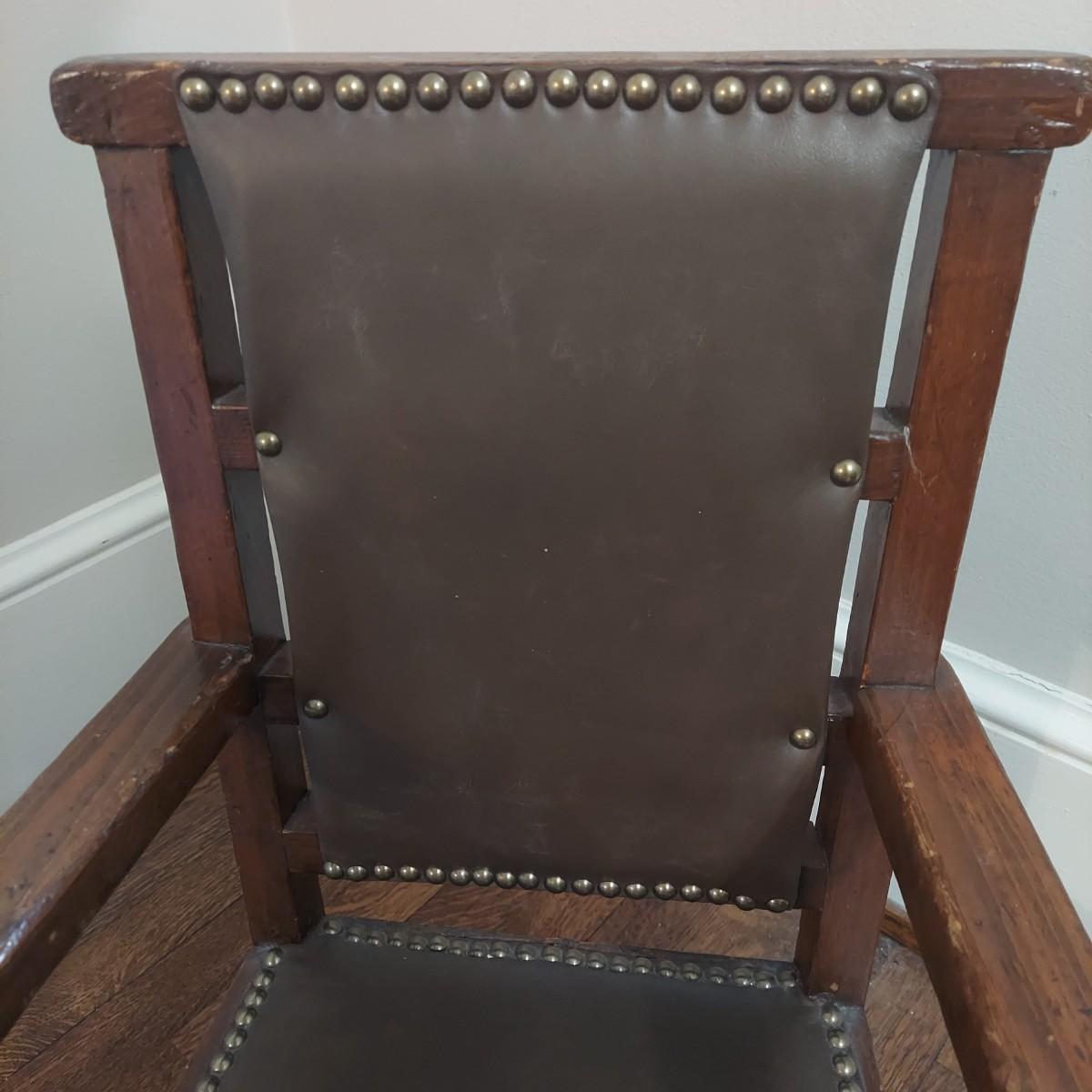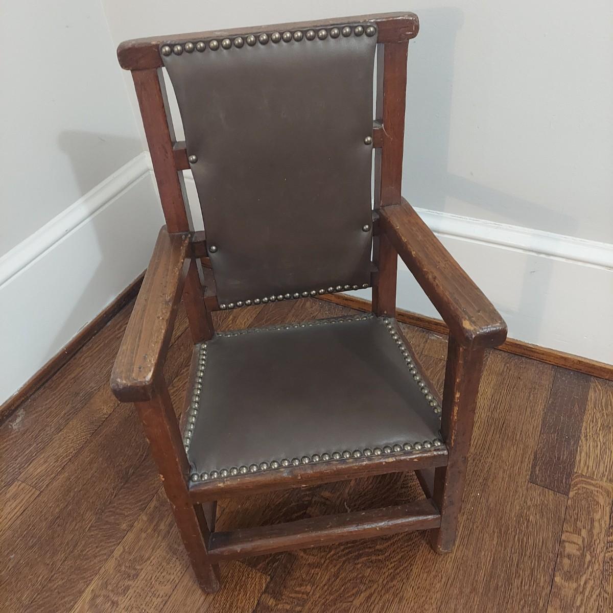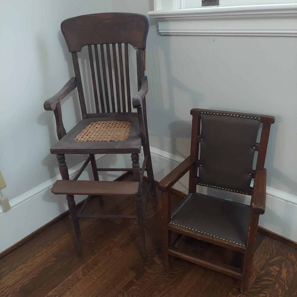Two wooden children's chairs that appear to be vintage. The highchair is a bit wobbly. It measures 15” x 16” x 40"H w/ a cane seat that is 23"H. The Little chair with leather and nail head trim measures 15.5” x 13” x 25"H w/ a 9” seat height. Chairs are for decorative use only. Please see photos for details. Local Pickup Only