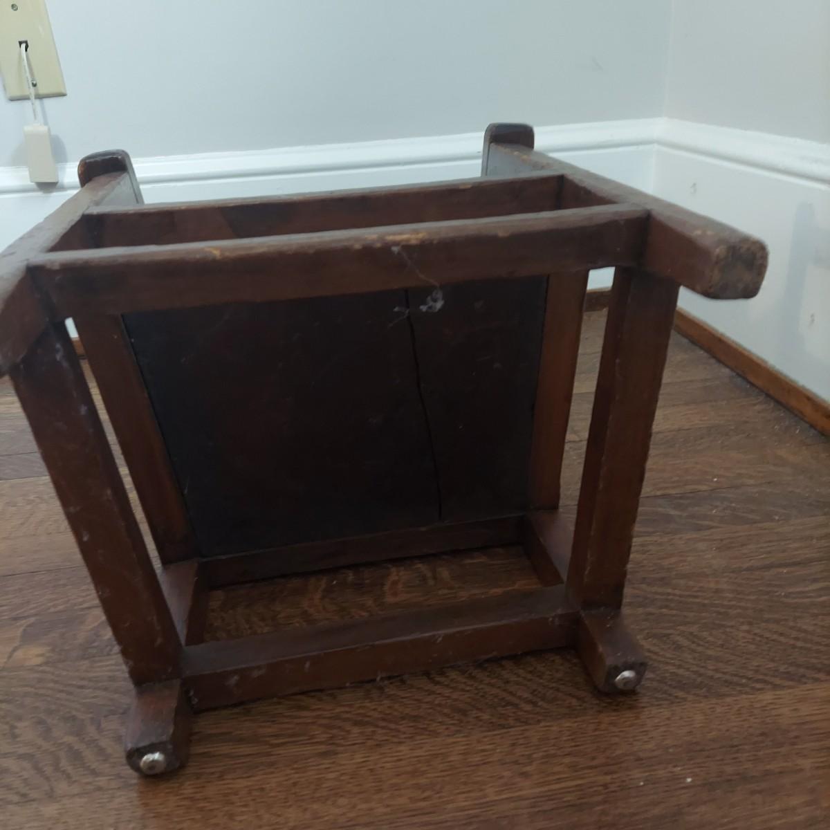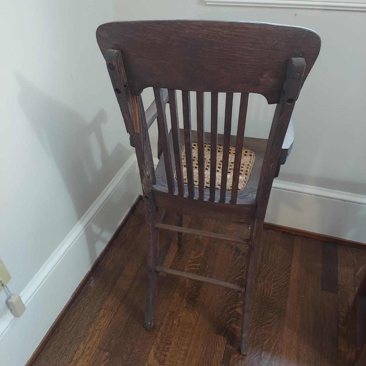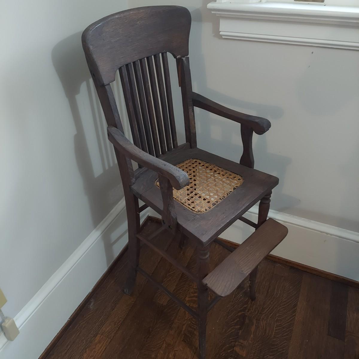 Two wooden children's chairs that appear to be vintage. The highchair is a bit wobbly. It measures 15” x 16” x 40"H w/ a cane seat that is 23"H. The Little chair with leather and nail head trim measures 15.5” x 13” x 25"H w/ a 9” seat height. Chairs are for decorative use only. Please see photos for details. Local Pickup Only