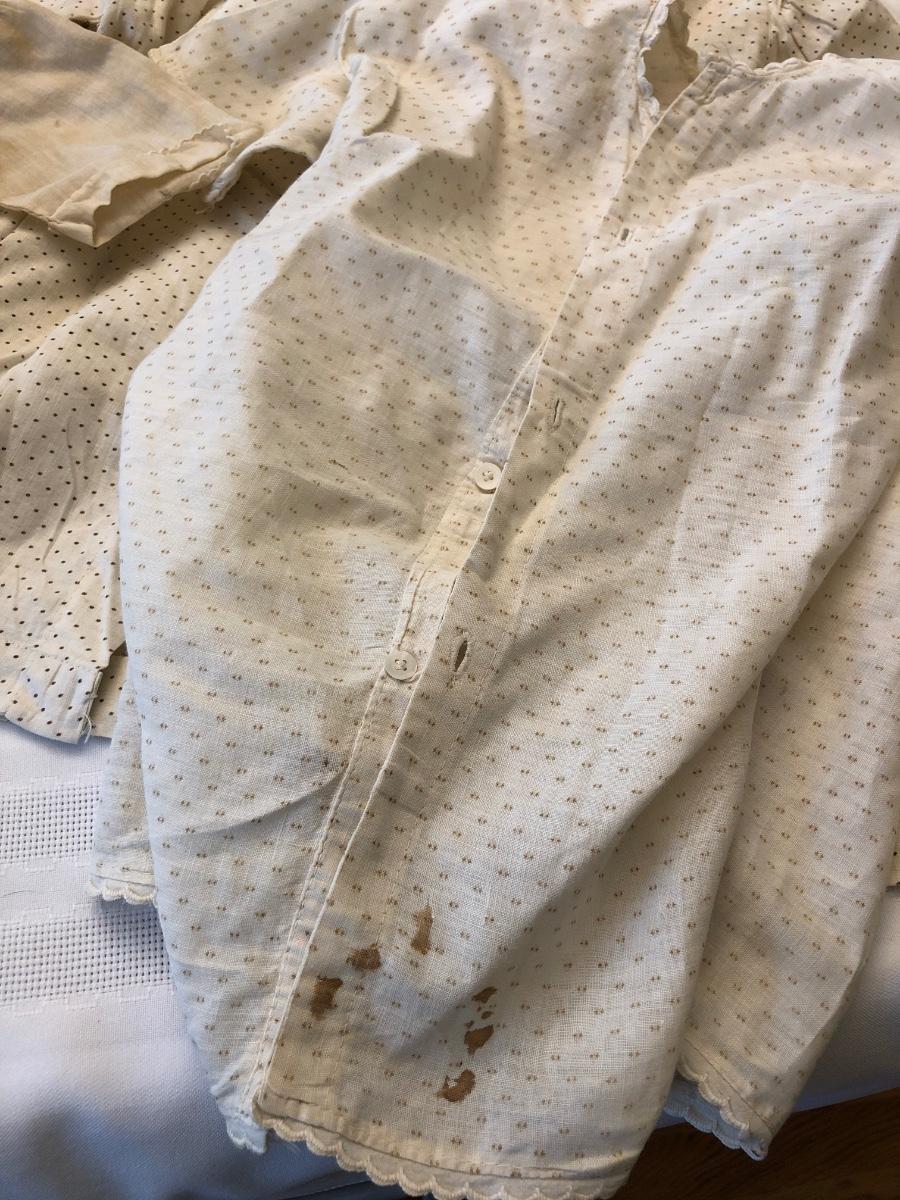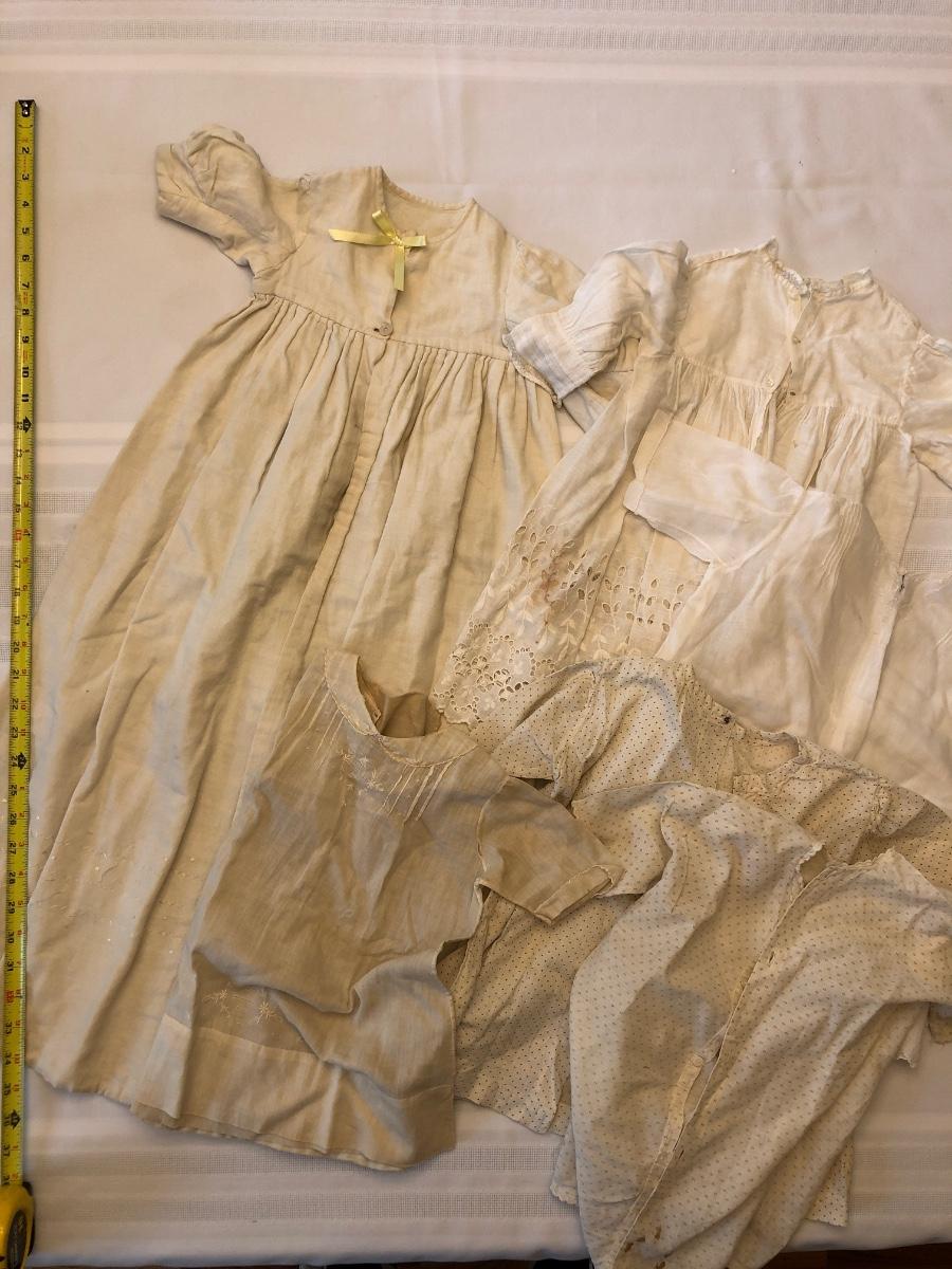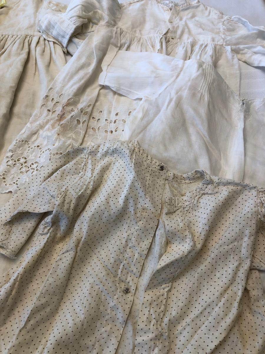 Six pieces. Christening dress and pinafores. Shows some age, ware and some staining in spots.