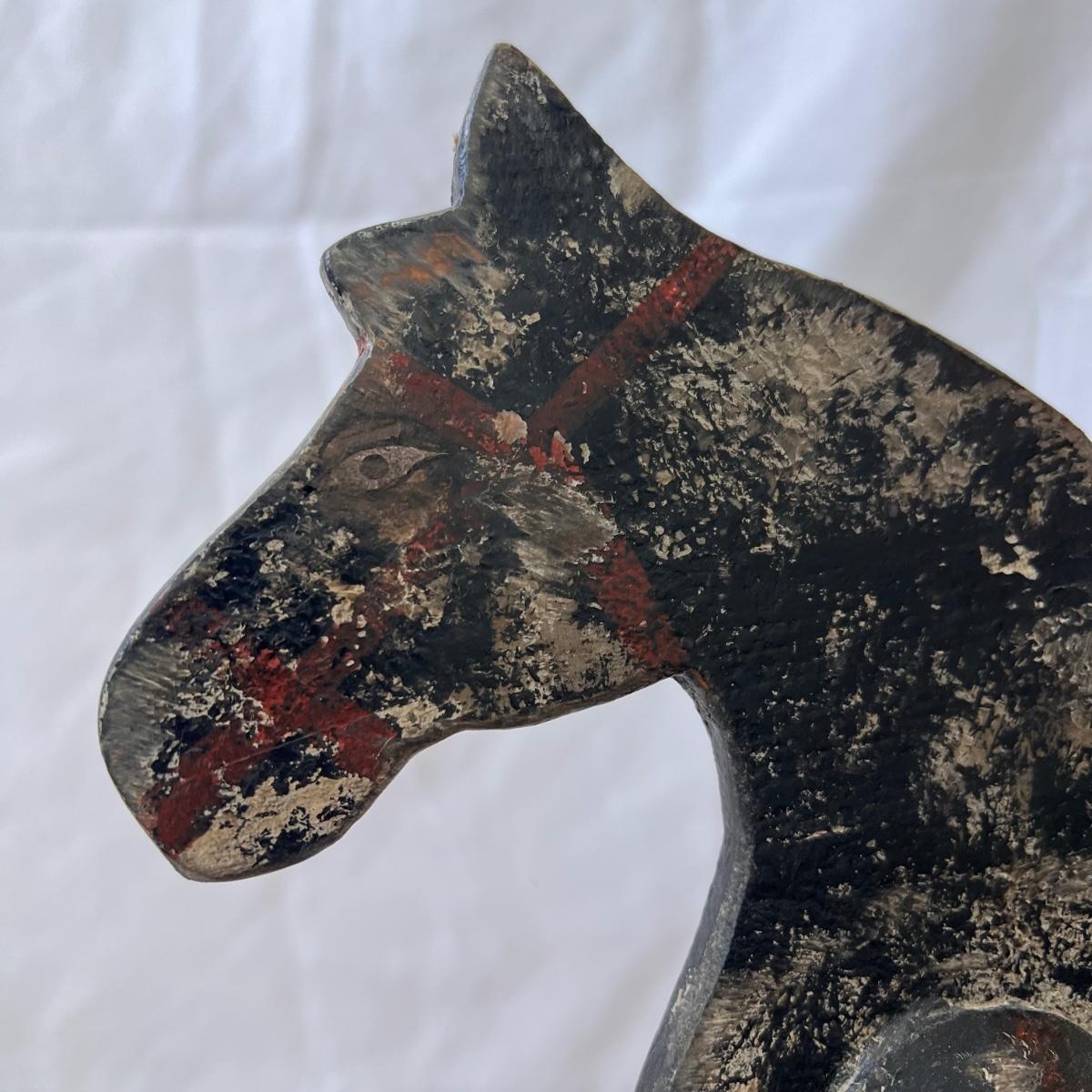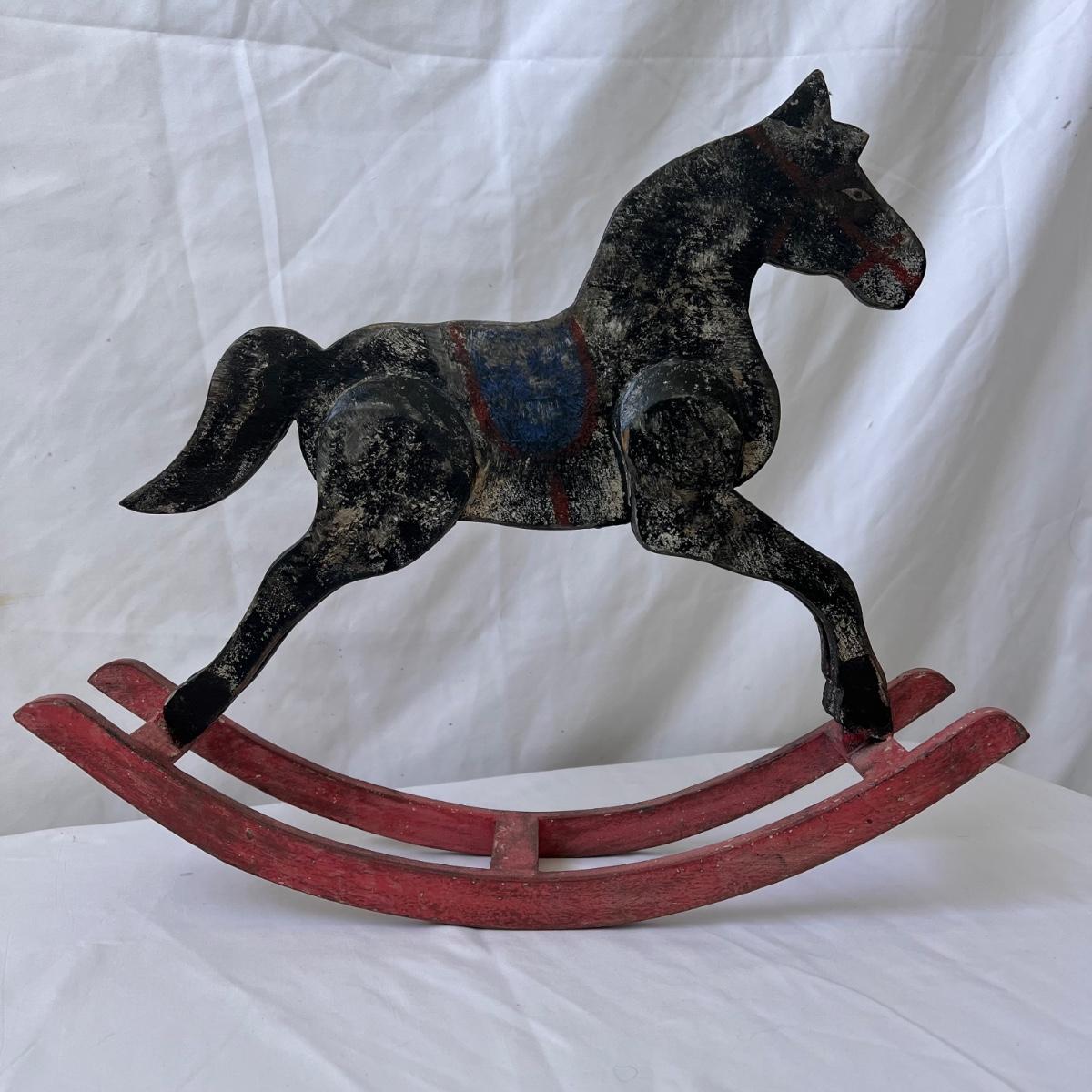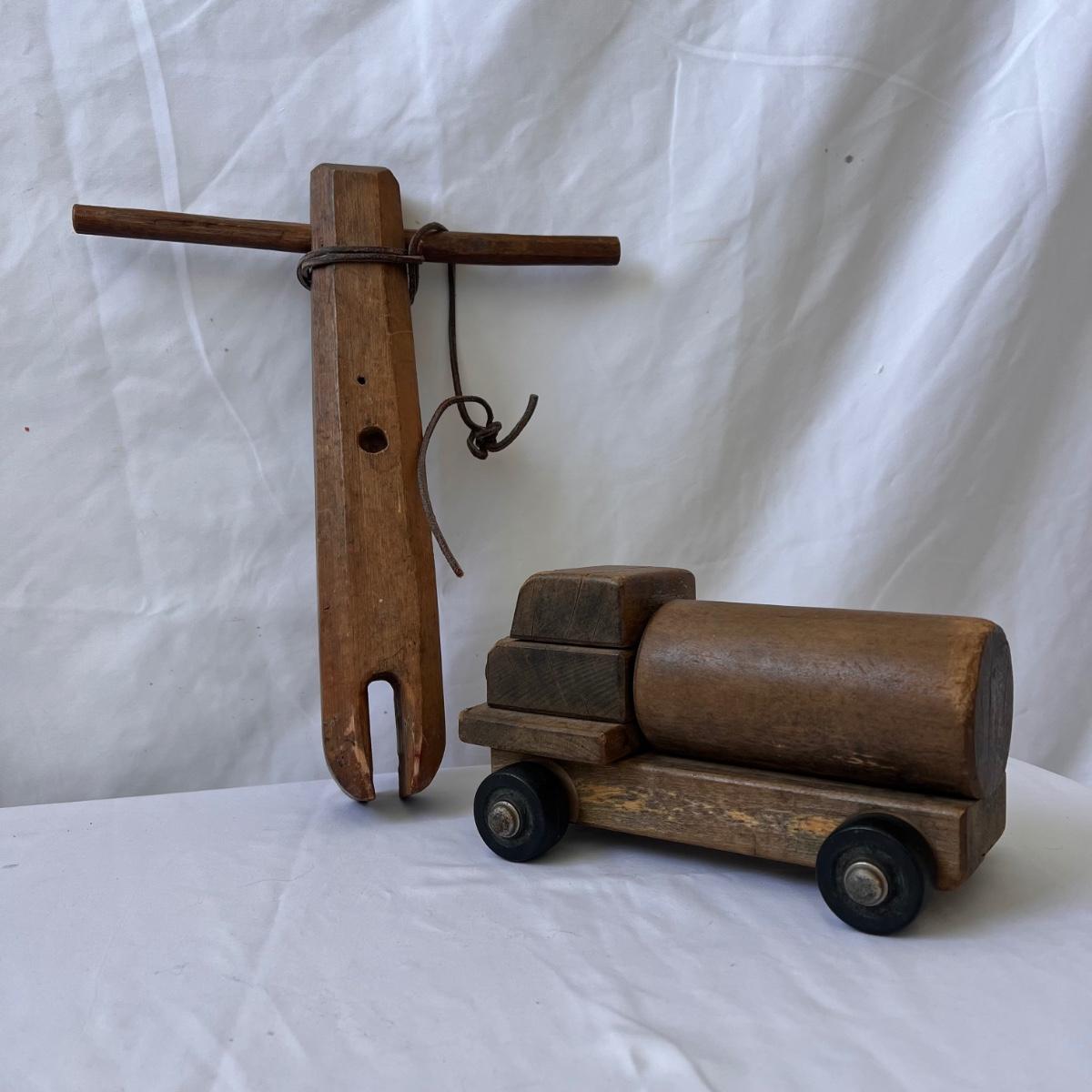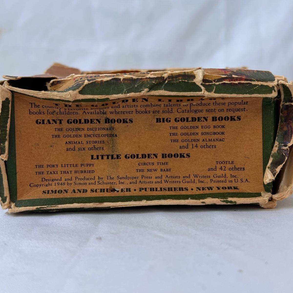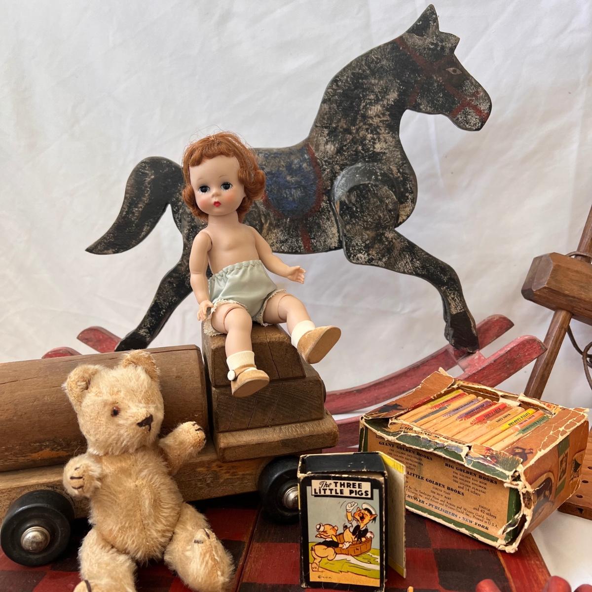 This lot of vintage children’s items includes several wooden pieces including a rocking horse, a double-sided game board, checkers pieces, a Milton Bradley Company peg board, a puzzle with painted pieces, a wooden hand-carved tool and a truck. Also included in the lot are a Simon and Schuster “Tiny Animal Stories” book collection, The Three Little Pigs card game by Russell MFG. Company, one plastic doll by Madame Alexander, one teddy bear with one eye missing (see picture included), and a cast iron helicopter. The wooden horse is the largest item, measuring 17.5” x 4” x 15”H. Shipping available.