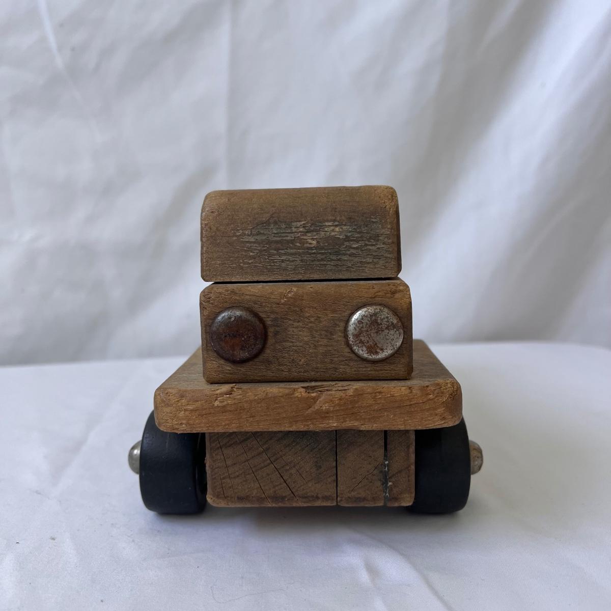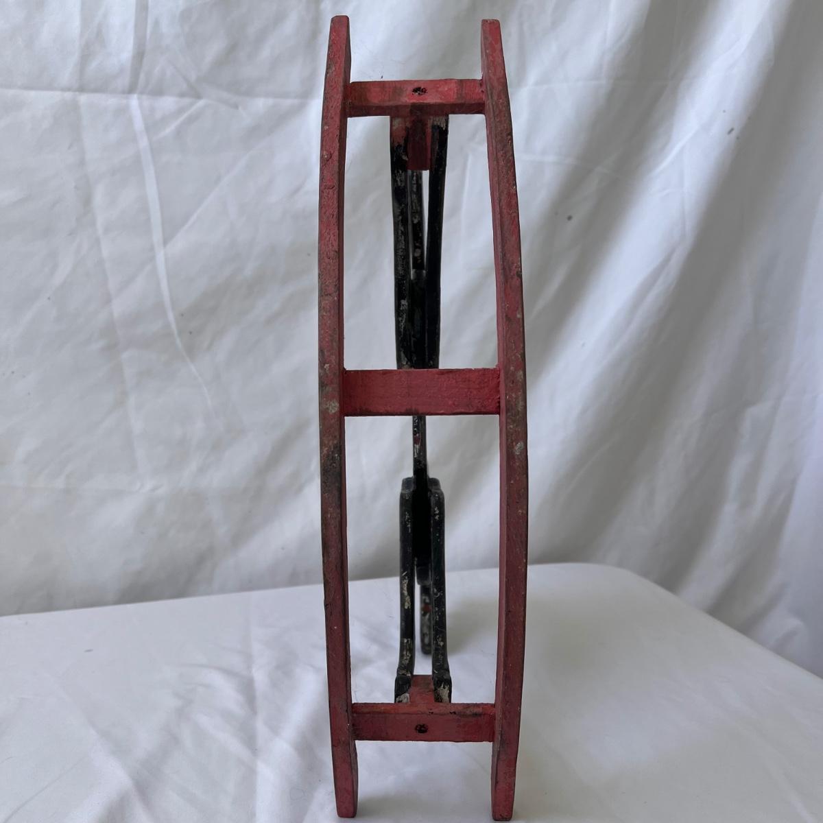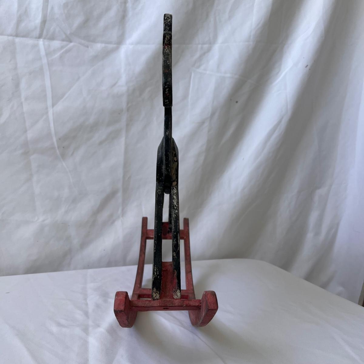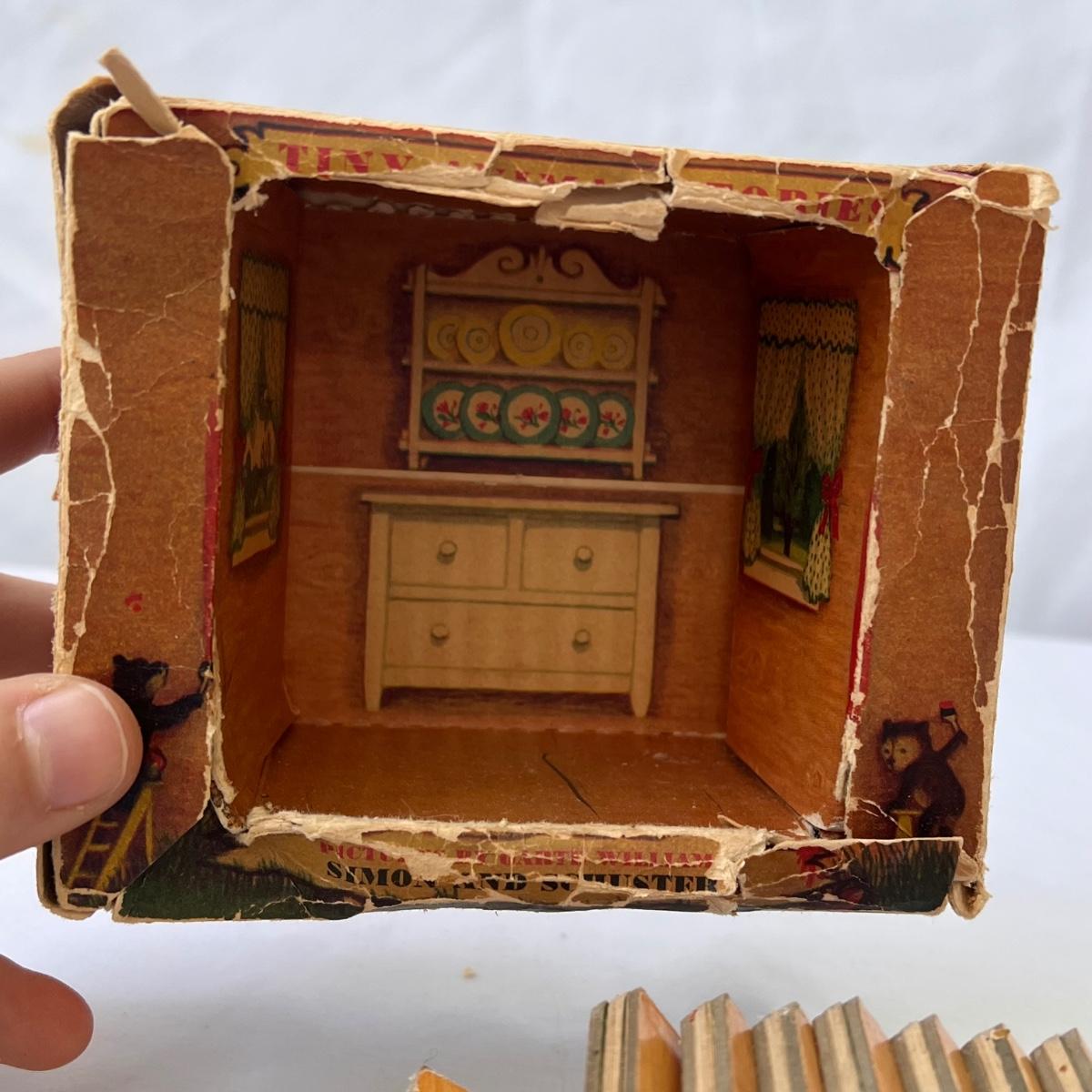 This lot of vintage children’s items includes several wooden pieces including a rocking horse, a double-sided game board, checkers pieces, a Milton Bradley Company peg board, a puzzle with painted pieces, a wooden hand-carved tool and a truck. Also included in the lot are a Simon and Schuster “Tiny Animal Stories” book collection, The Three Little Pigs card game by Russell MFG. Company, one plastic doll by Madame Alexander, one teddy bear with one eye missing (see picture included), and a cast iron helicopter. The wooden horse is the largest item, measuring 17.5” x 4” x 15”H. Shipping available.