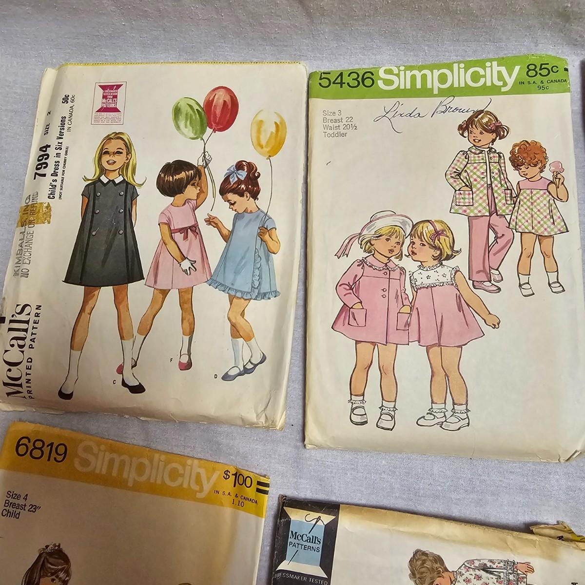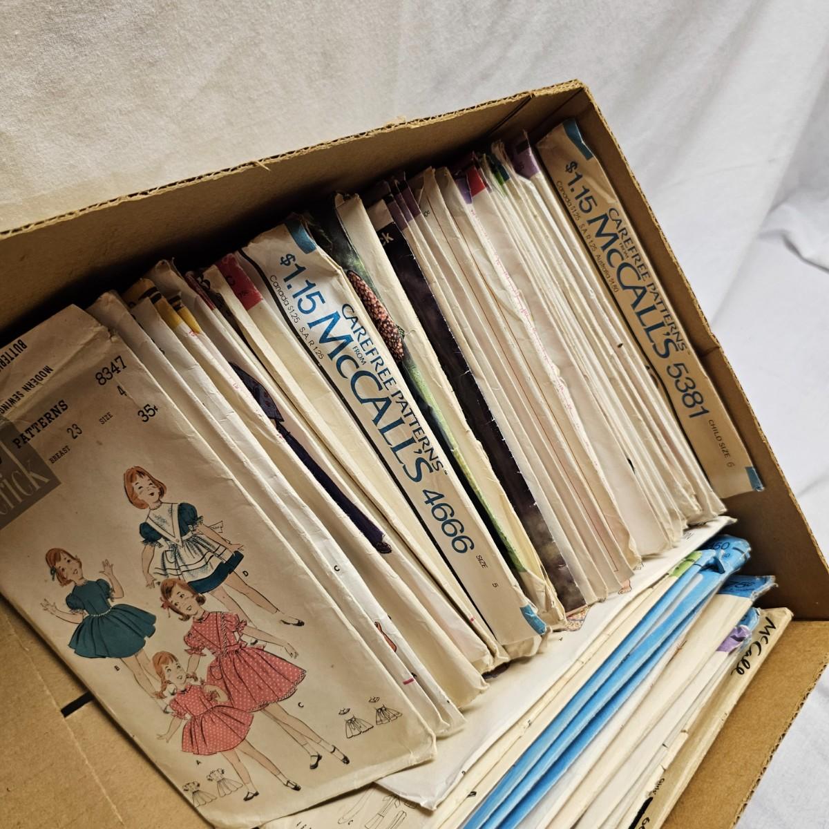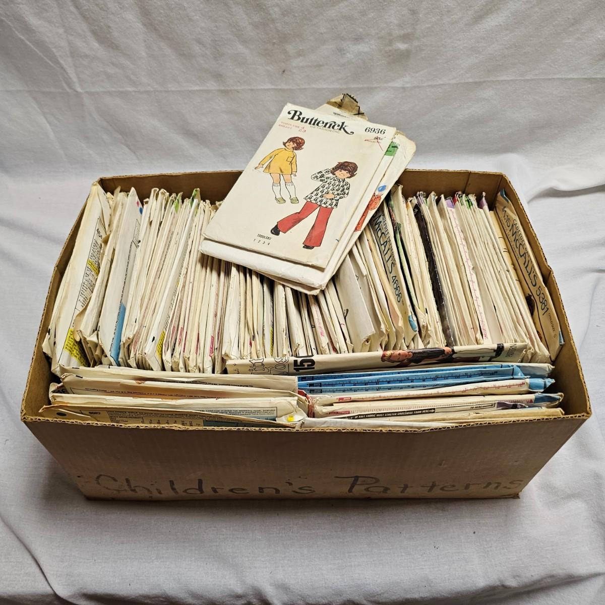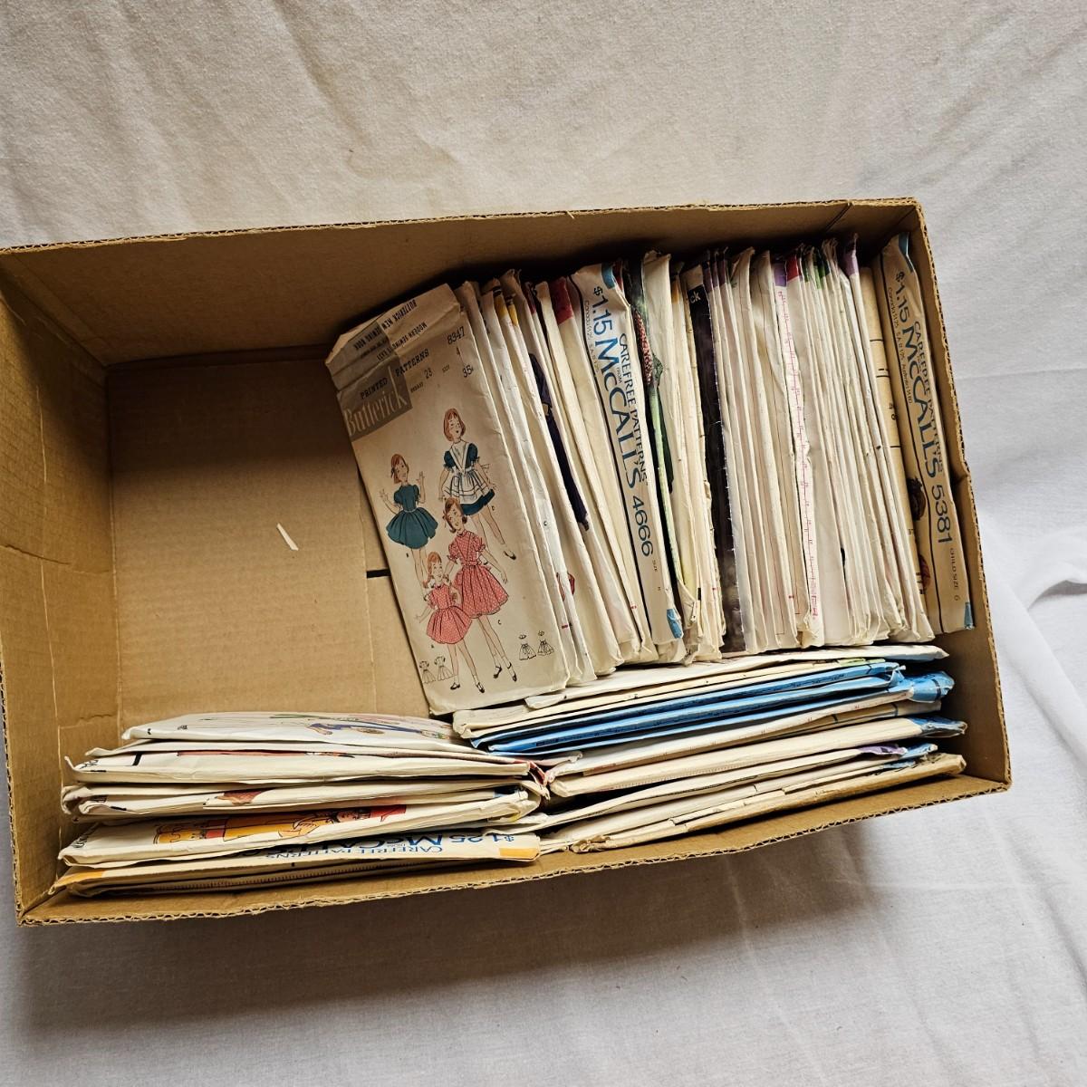 An entire box of sewing patterns specifically for young girls. Ages toddler to four and up by producers such as McCalls, Simplicity, Butterick, others. Approximately 100 or more patterns to fill a copy paper box. Not all patterns shown. See photos for details. Shipping available.