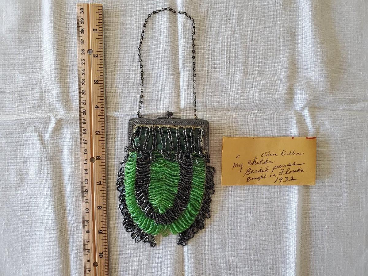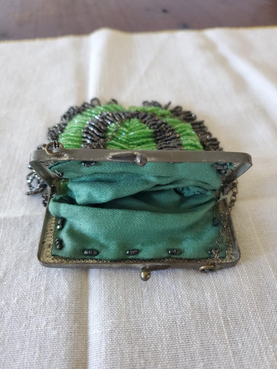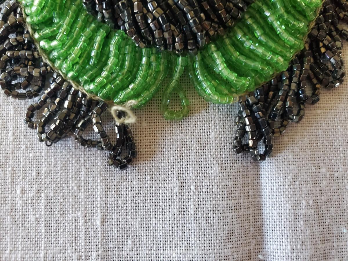 Black and green, with metal clasp and chain. Bottom of beading is missing but still works fine.