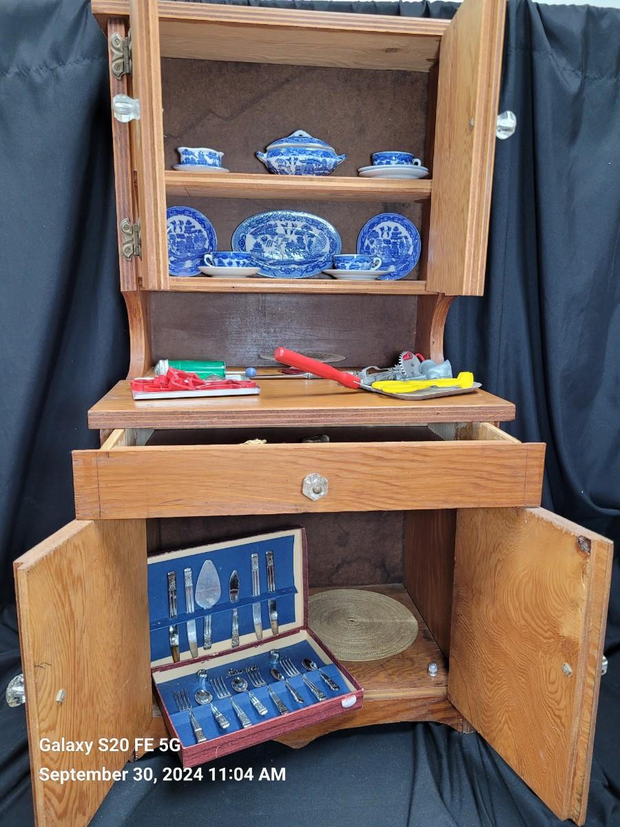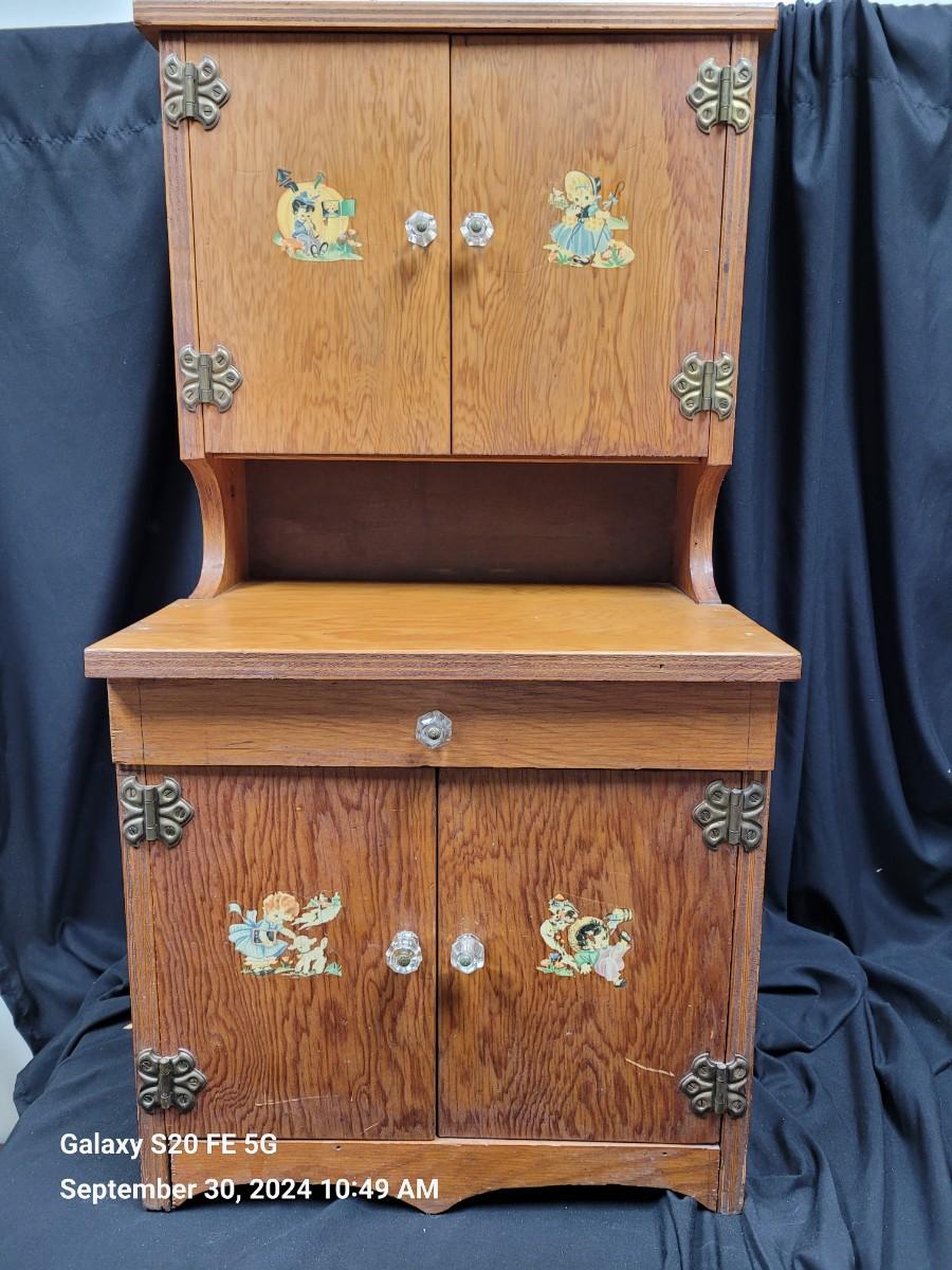 The cabinet is 12 inches deep, 34 inches tall, and 18 inches wide. Glass knobs 4 doors, 1 drawer