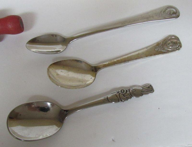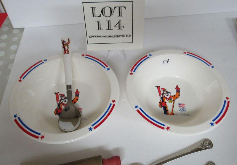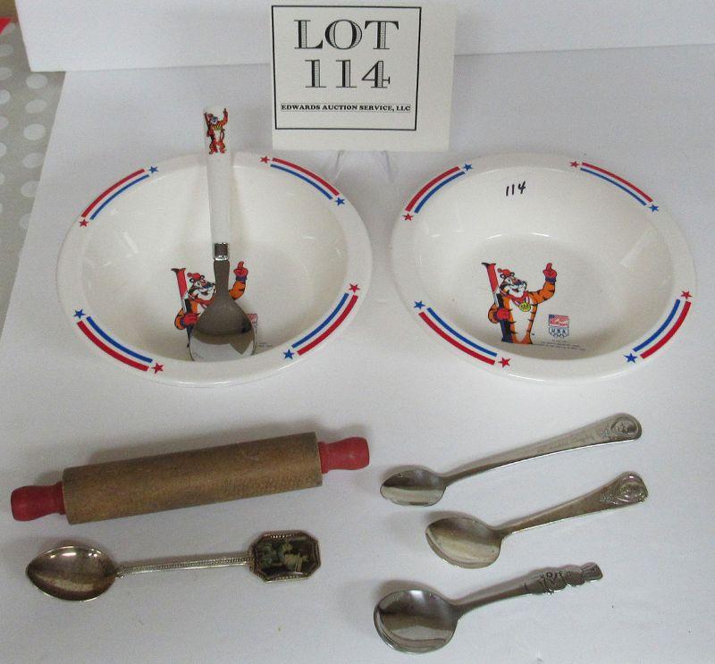 Vintage Child's Lot, 2 Tony Tiger Bowls, 1 Tony Tiger Spoon, 2 Gerber Spoons, 1 Peter Rabbit Spoon, More