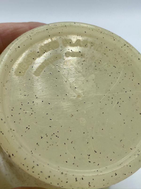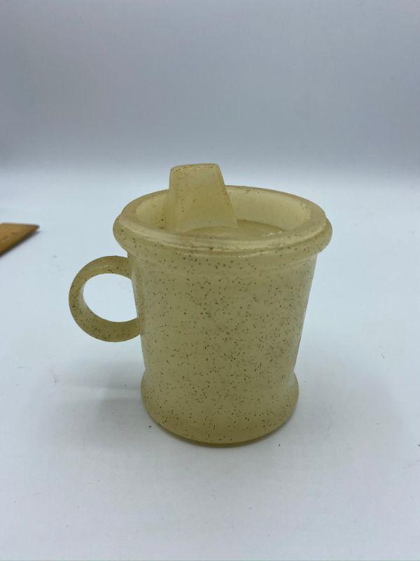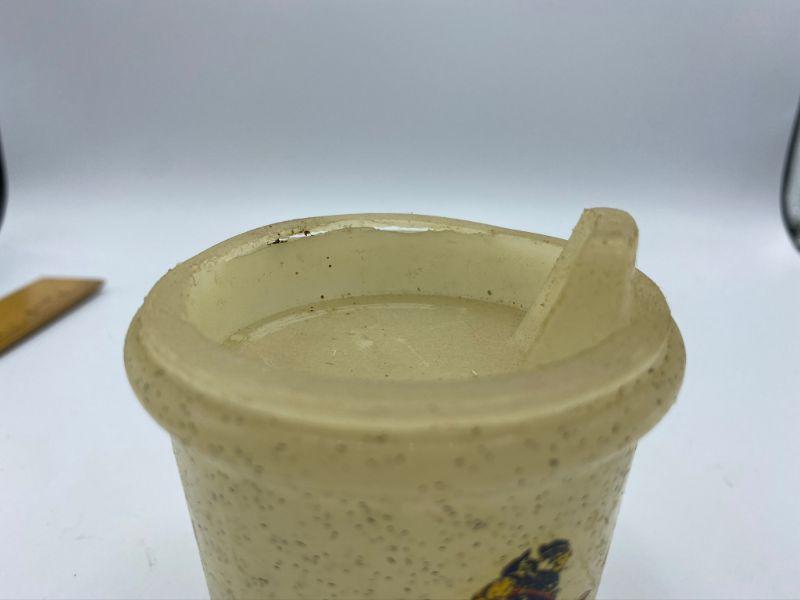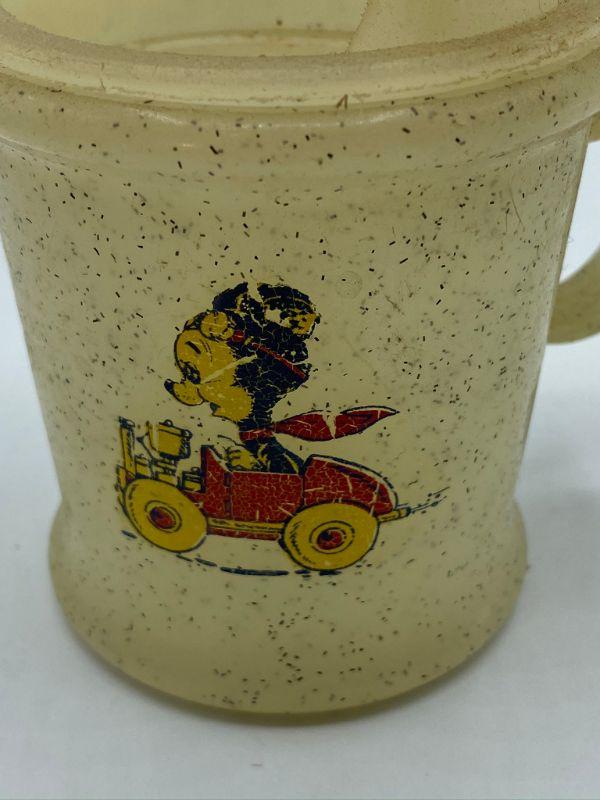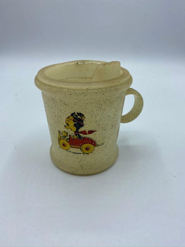 Vintage child's sippy cup. Has a character in a little car on it. Speckled plastic. single loop handle. The lid has a crack around the edge, lid is on tight, did not want to remove the lid causing more damage. Made by Westland Plastics.