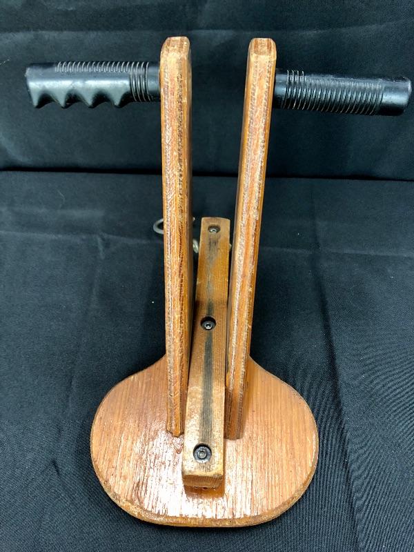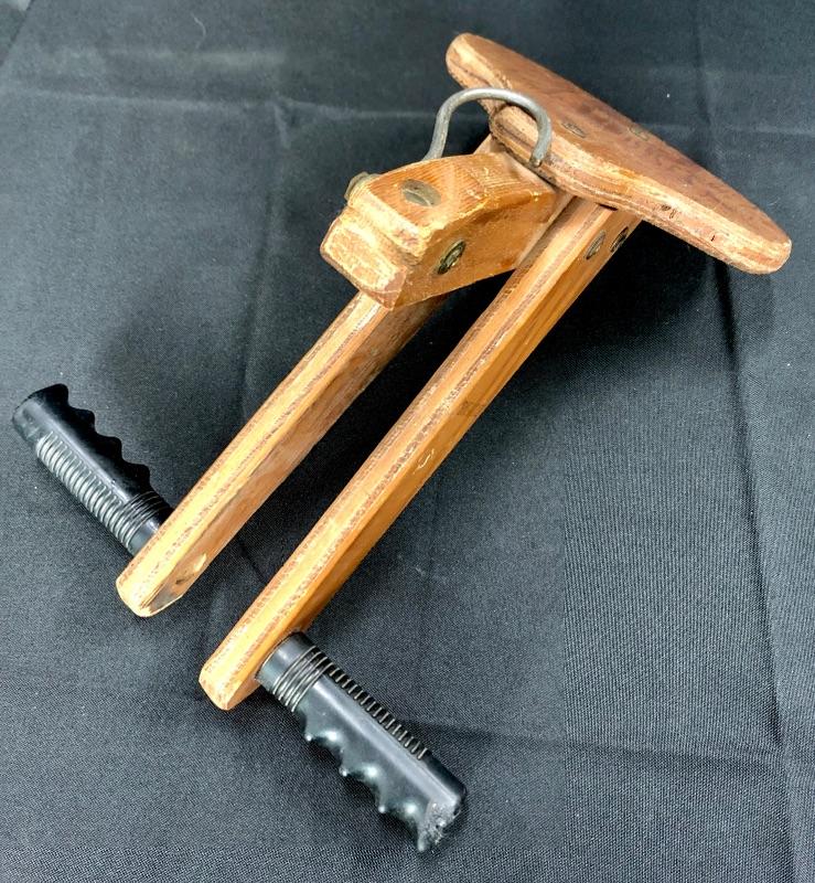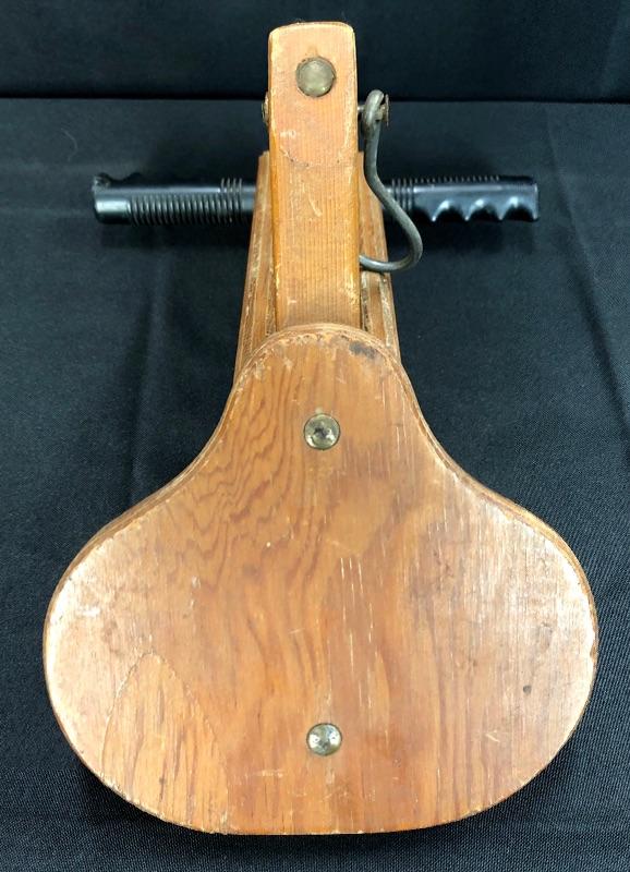 Interesting vintage wood childs seat for a bike. Made to be added to a bike. Has foot pegs. I believe it sits on the bar in front of the rider, making a bike for two. Hook would help hold in place by going around the post where handle bars are.