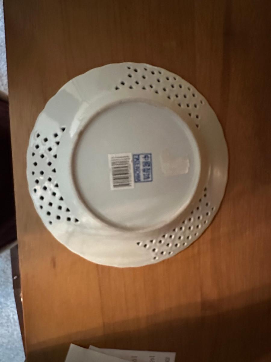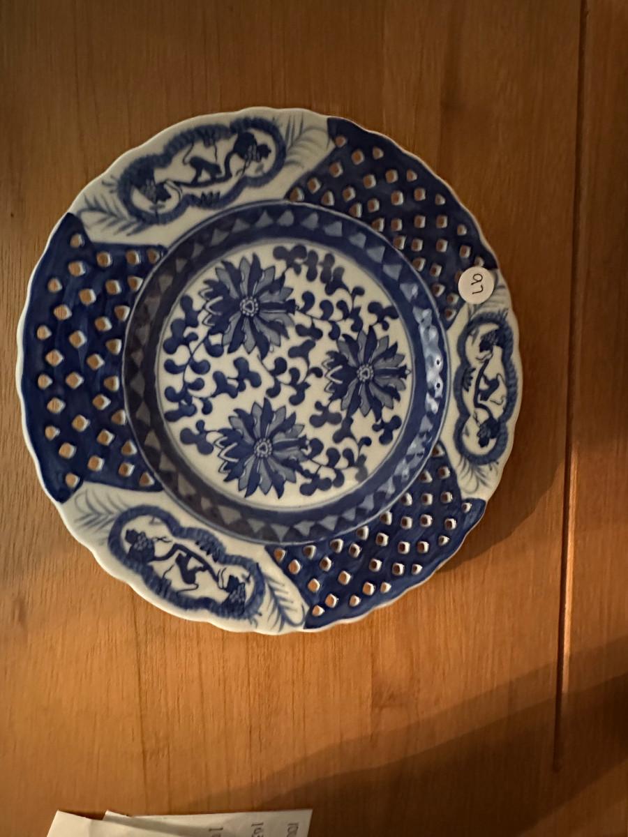 vintage China blue white porcelain plate, openwork border w/ tiny monkeys chinoiserie