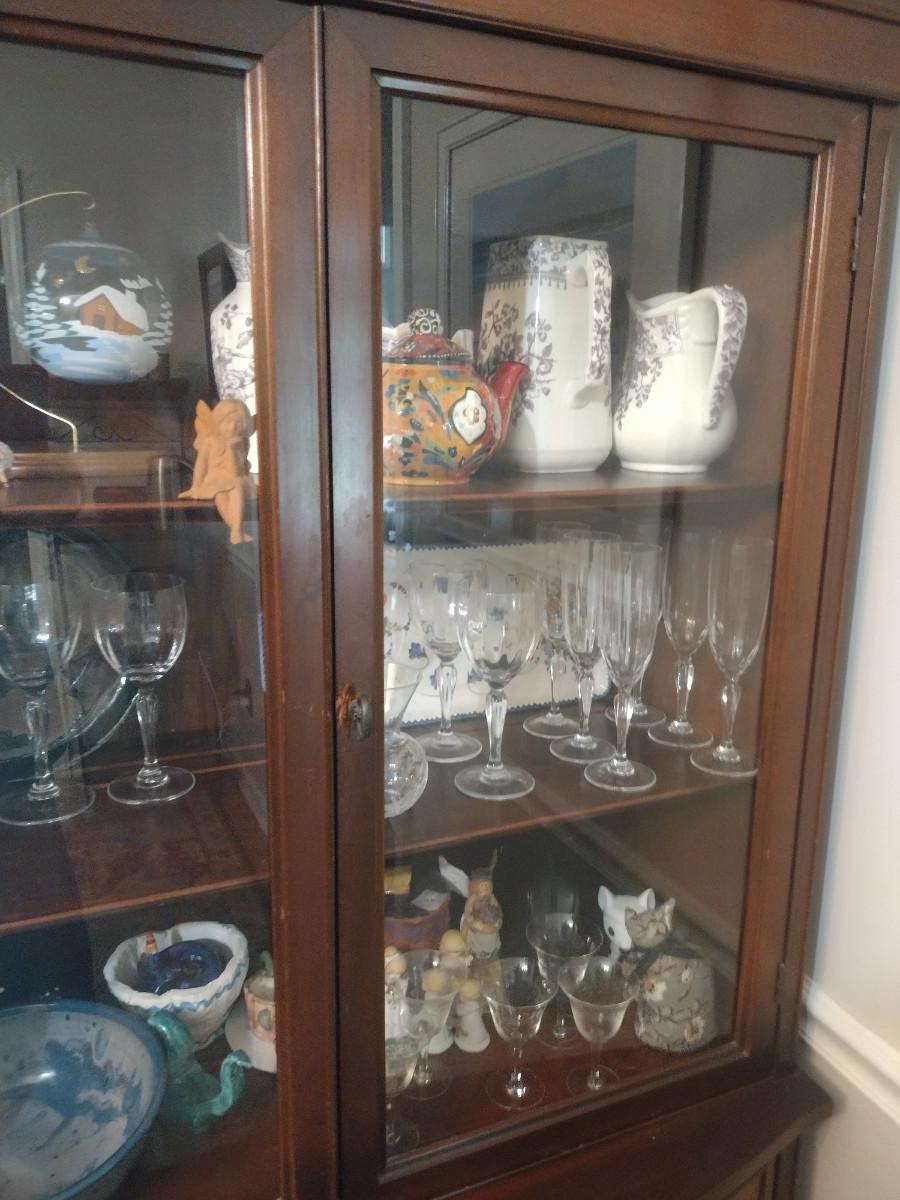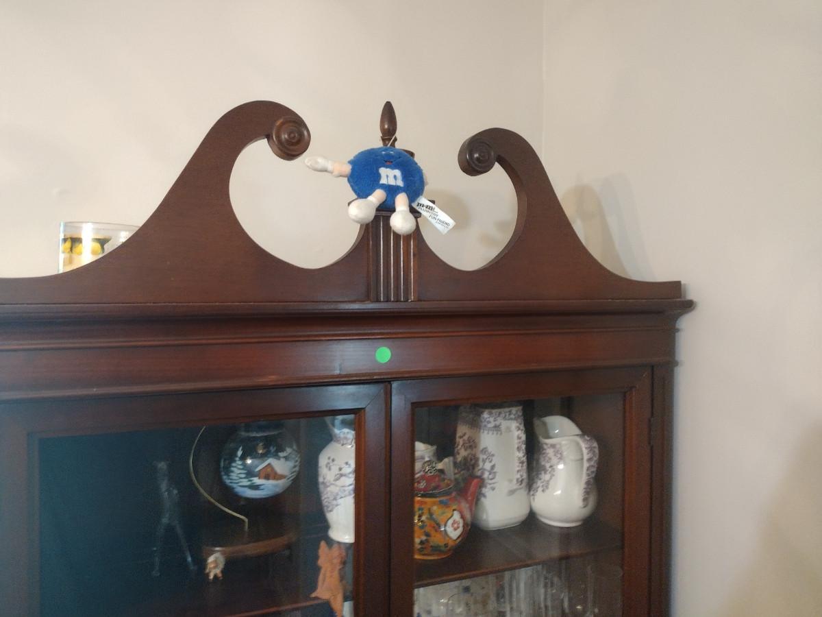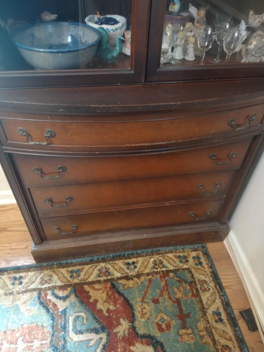 This slimmed down china hutch has a curved front top drawer and enough storage for your dishes, linens, and anything else you want to stow awy. Measures only 36"x17"x78" to the top of the finial. ***CONTENTS NOT INCLUDED.