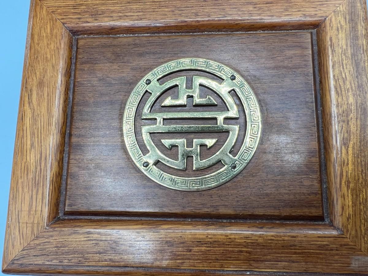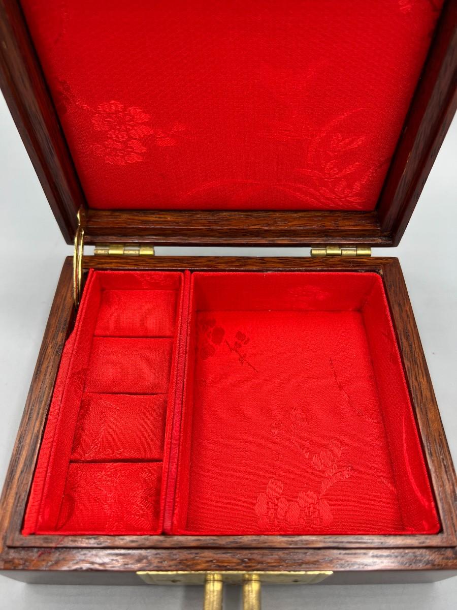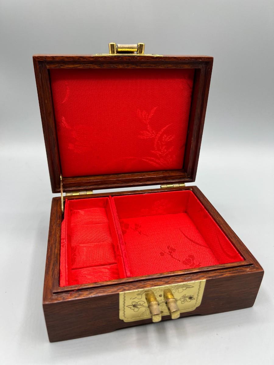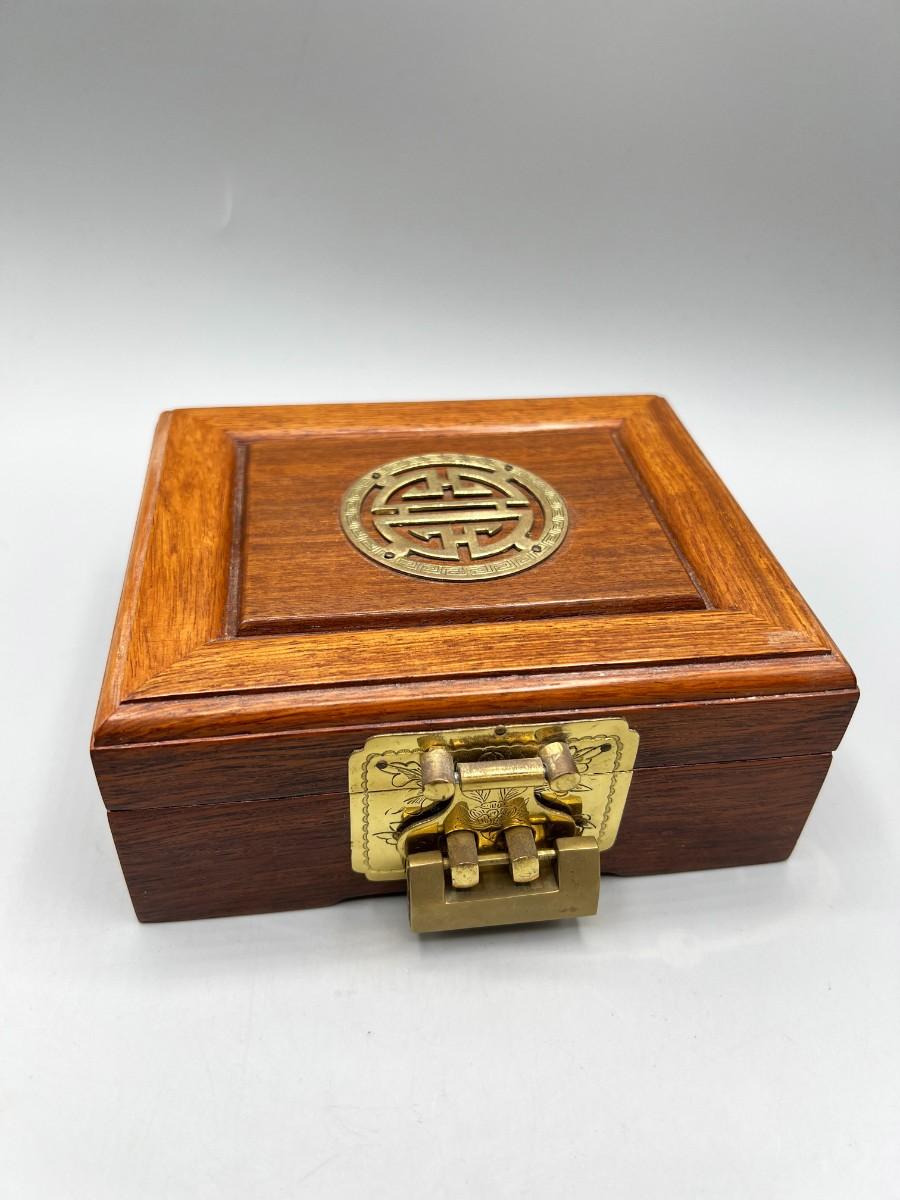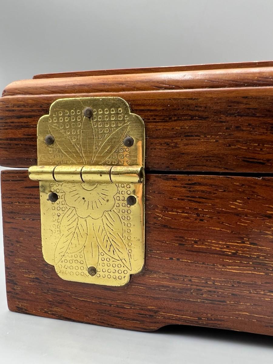 Vintage Chinese Asian Jewelry Trinket Box Wood Brass with Lock & Key, there is no significant damage to the trinket box and is in good vintage condition. Check pictures for more details and for sizing.