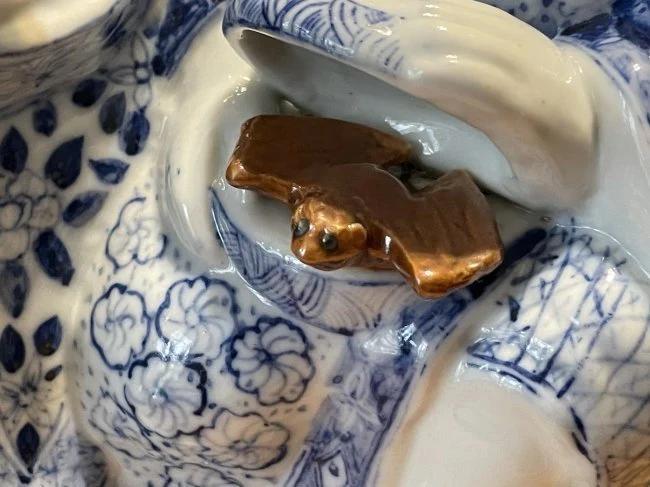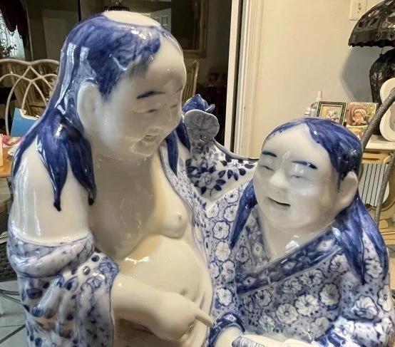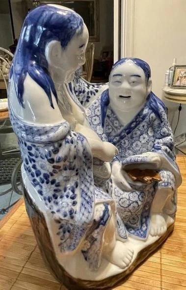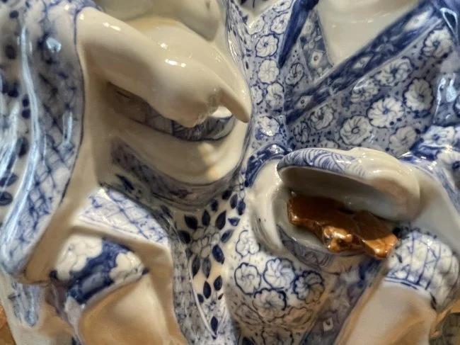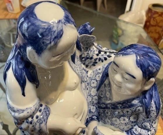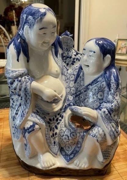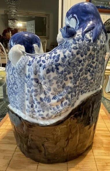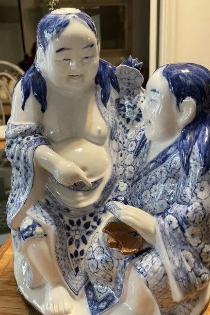 Vintage Chinese Blue & White Immortal HeHe Porcelain Figurine 10.75" Tall & 8" Wide in VG Preowned Condition from an Estate. (Heavy & Very Nicely Designed). $15 Domestic Shipping.