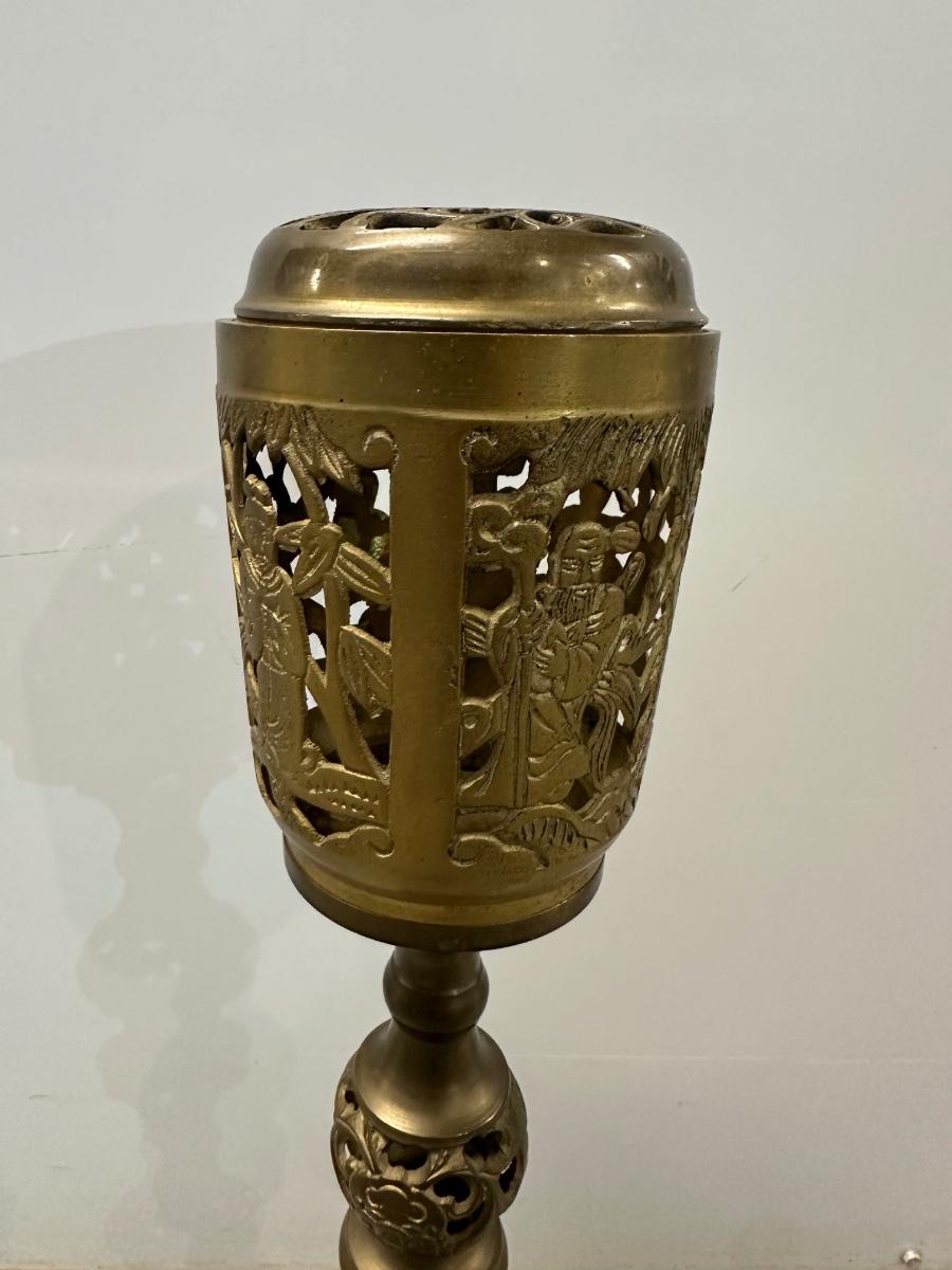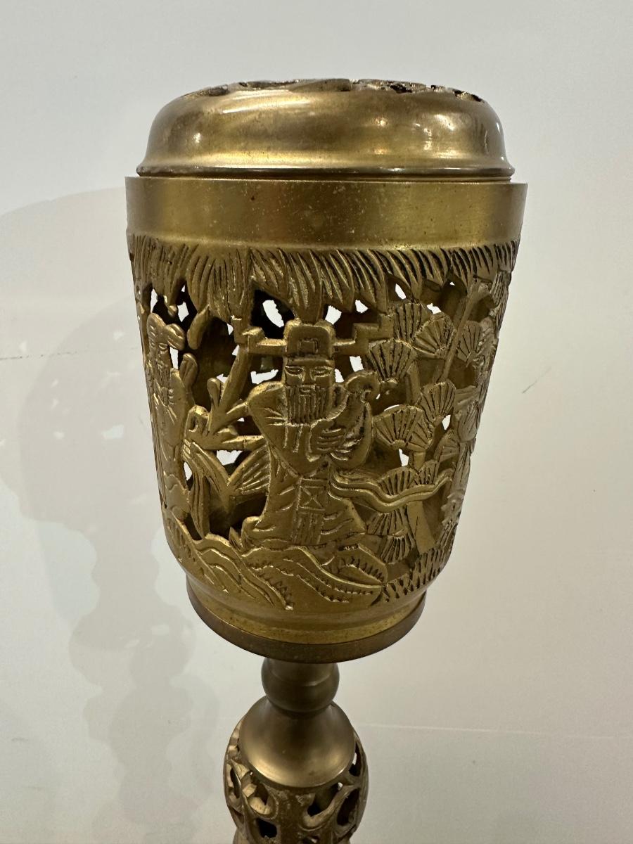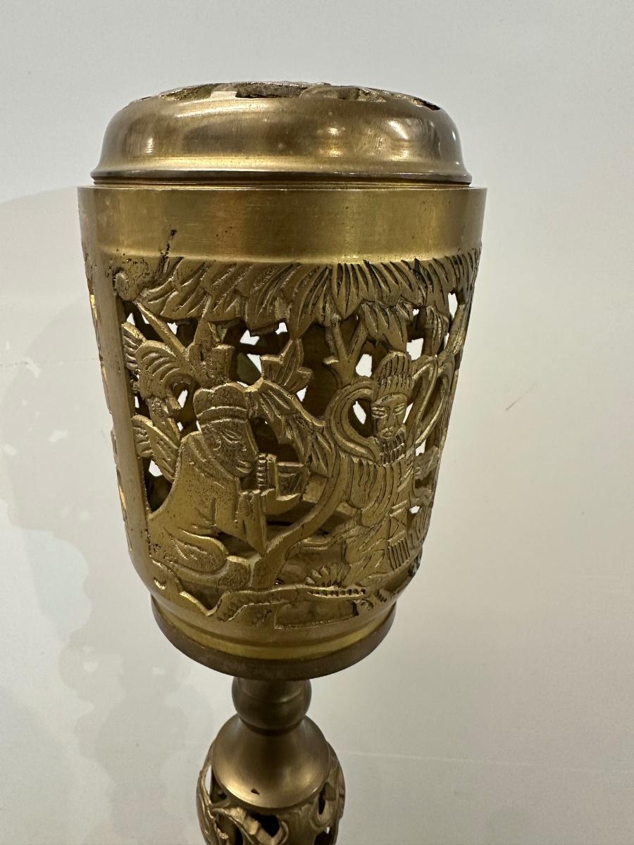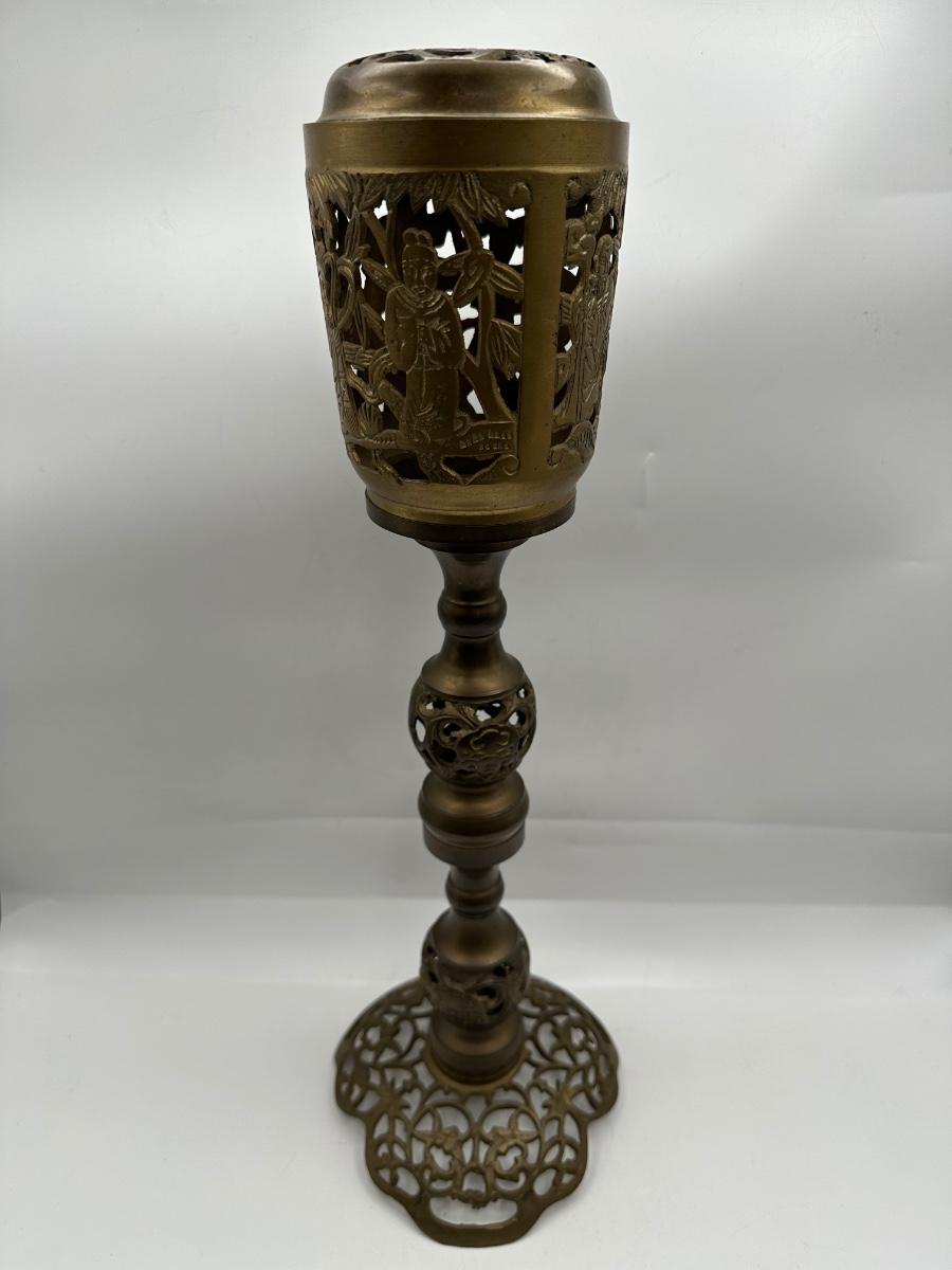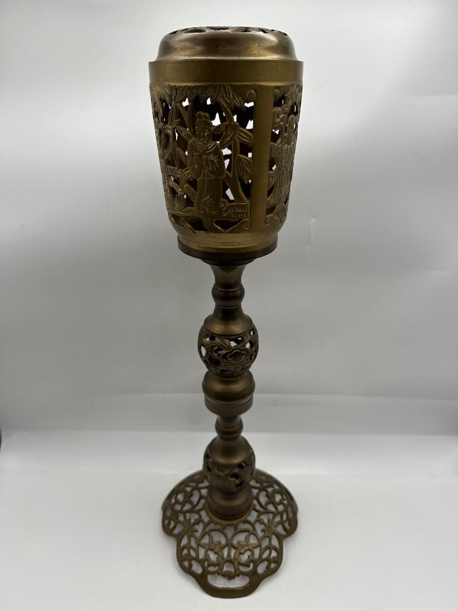 Vintage Chinese brass incense burner stand. This intricately cast and pierced piece features four panels of raised figural scenes, likely depicting scholars or deities in a lush landscape, complete with traditional robes and symbolic foliage. The stem is adorned with openwork floral elements, and the base boasts an ornate filigree design for a balanced, decorative presence.
