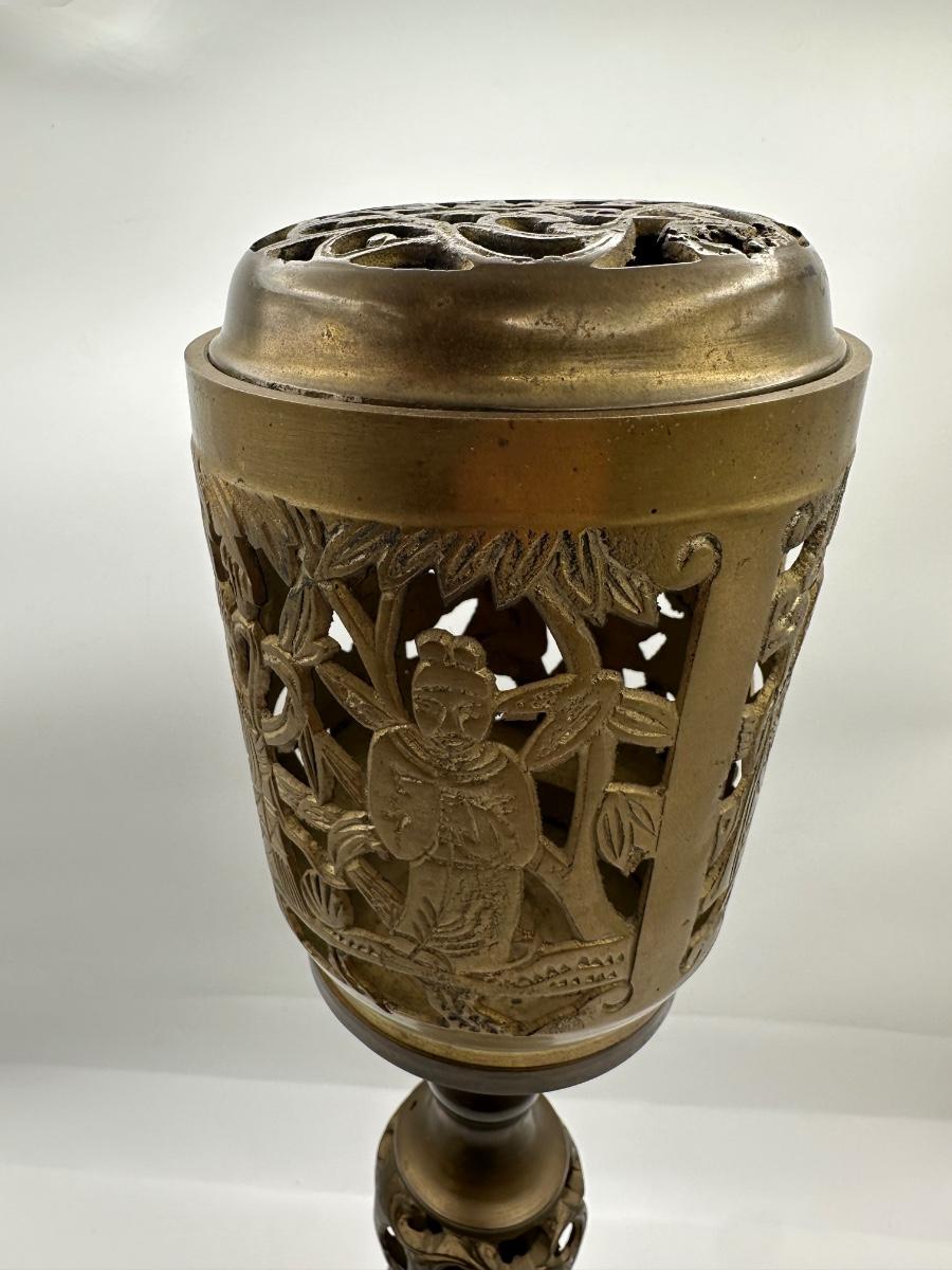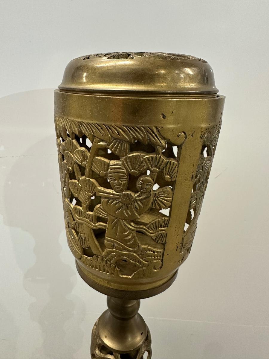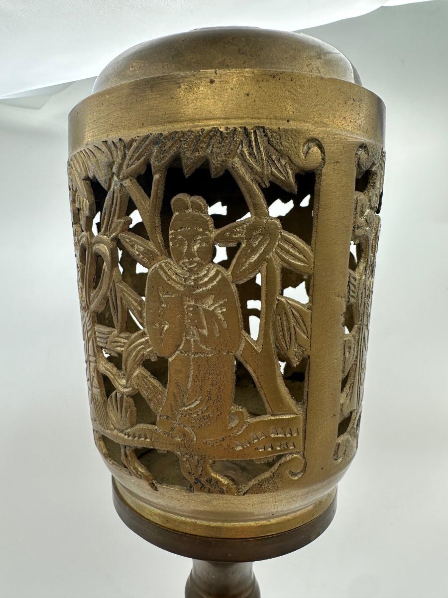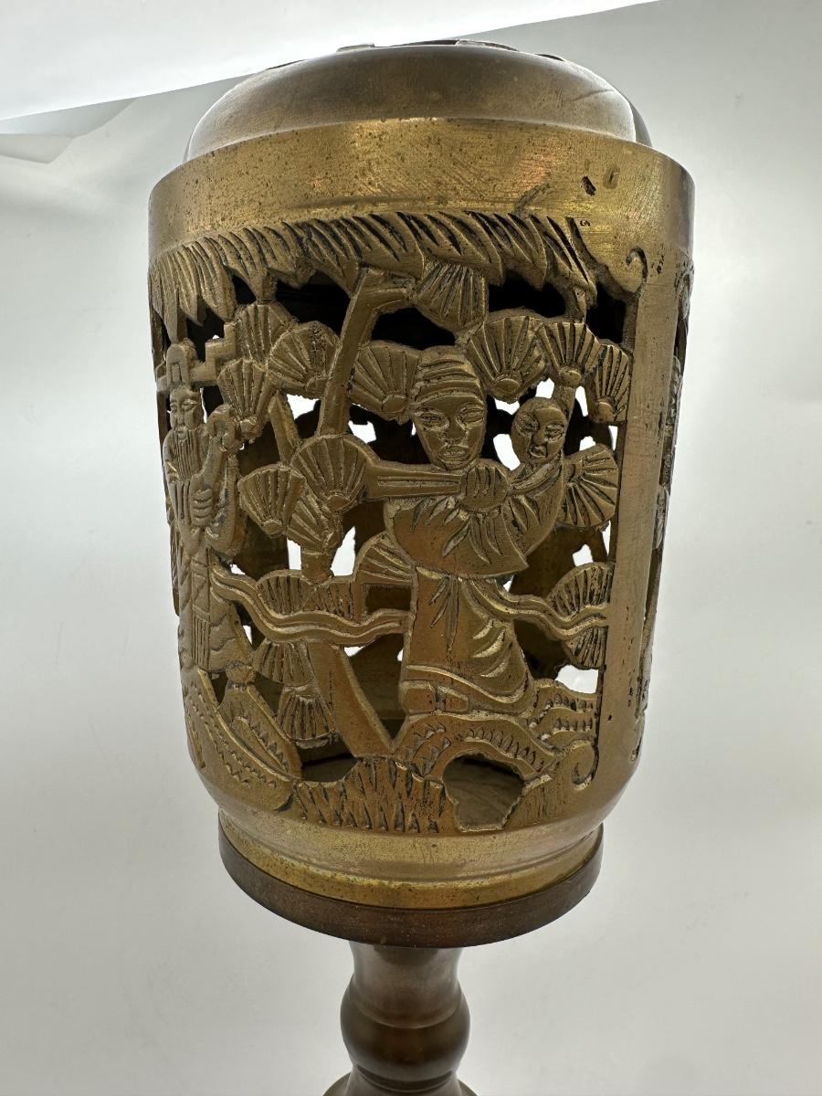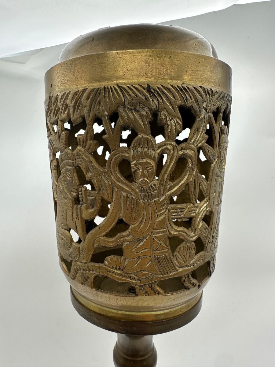 Vintage Chinese brass incense burner stand. This intricately cast and pierced piece features four panels of raised figural scenes, likely depicting scholars or deities in a lush landscape, complete with traditional robes and symbolic foliage. The stem is adorned with openwork floral elements, and the base boasts an ornate filigree design for a balanced, decorative presence.
