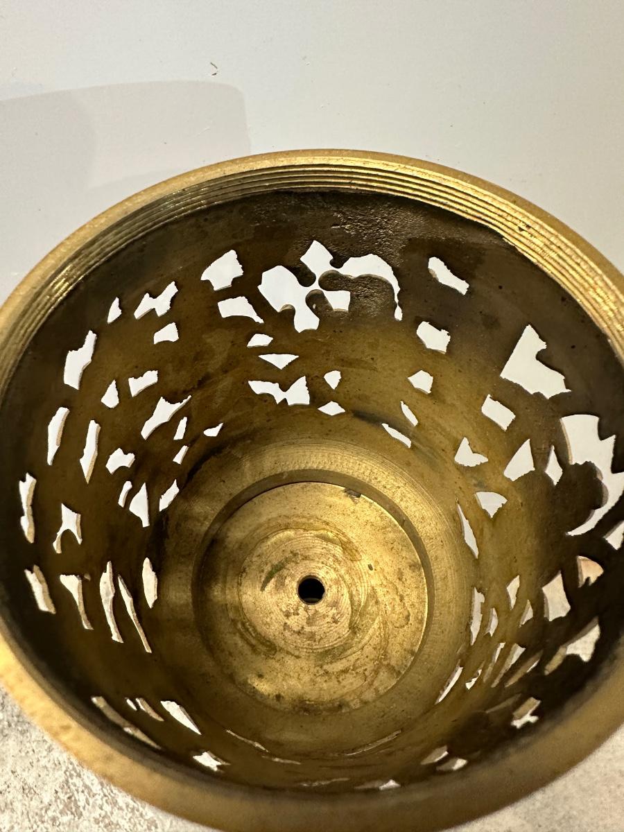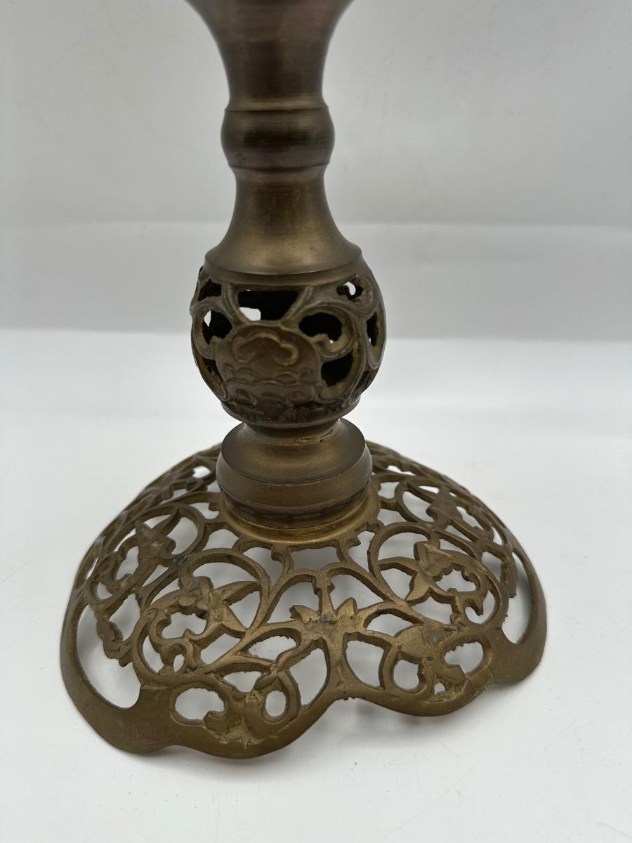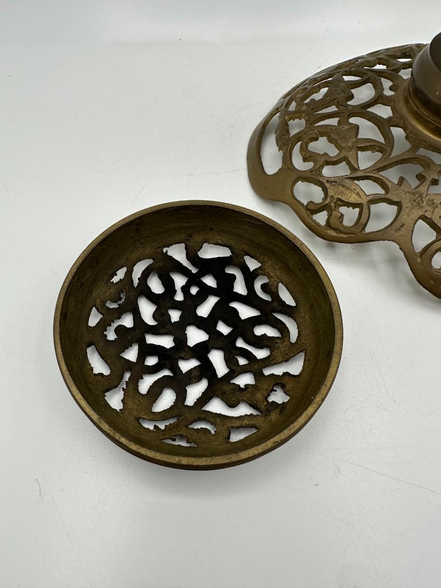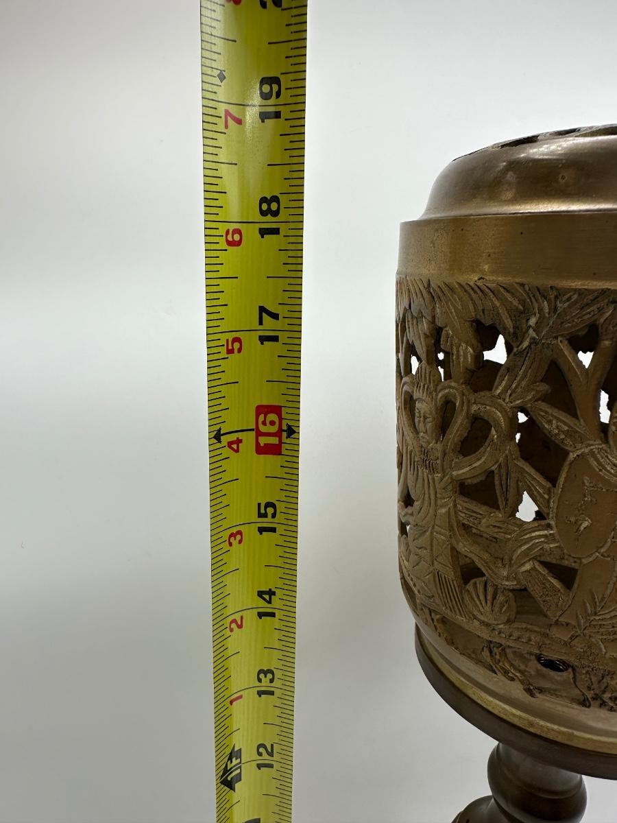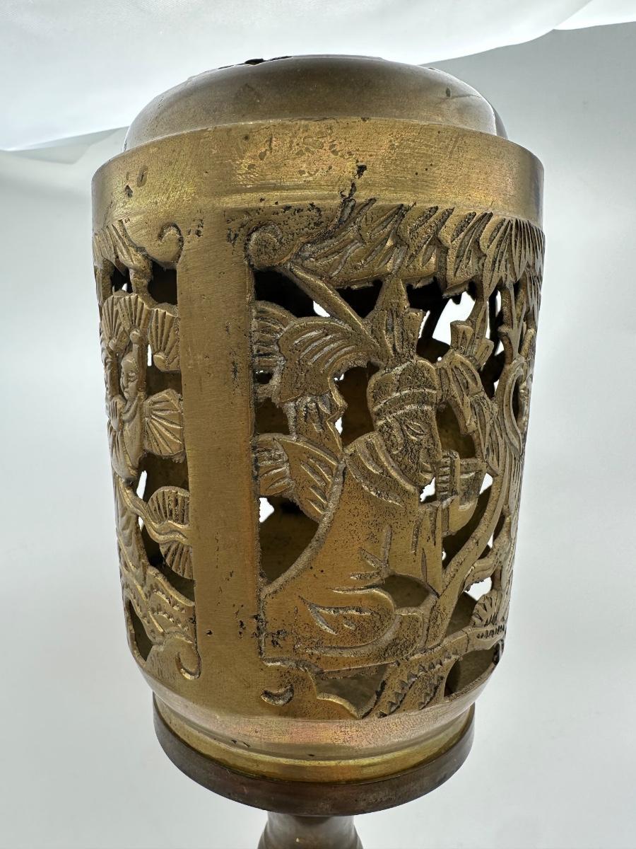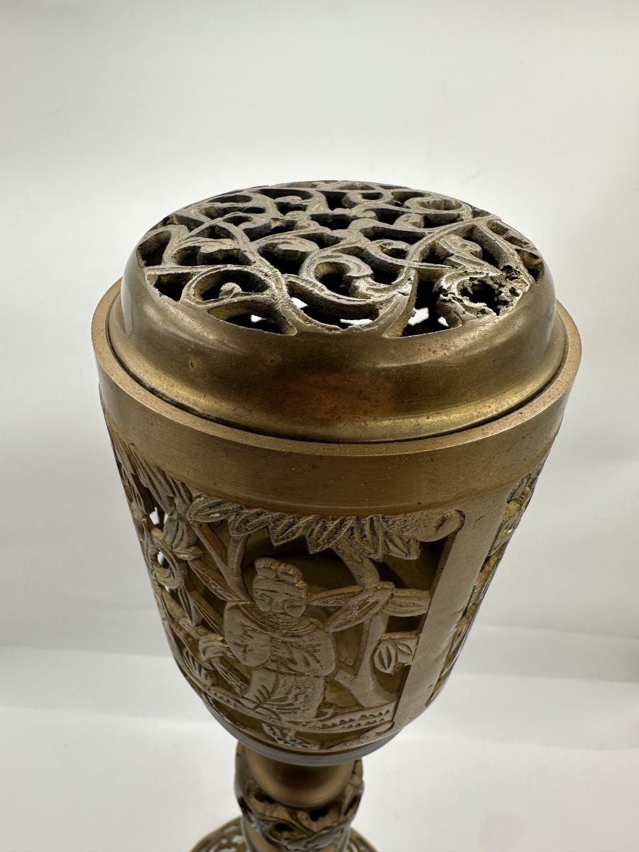 Vintage Chinese brass incense burner stand. This intricately cast and pierced piece features four panels of raised figural scenes, likely depicting scholars or deities in a lush landscape, complete with traditional robes and symbolic foliage. The stem is adorned with openwork floral elements, and the base boasts an ornate filigree design for a balanced, decorative presence.