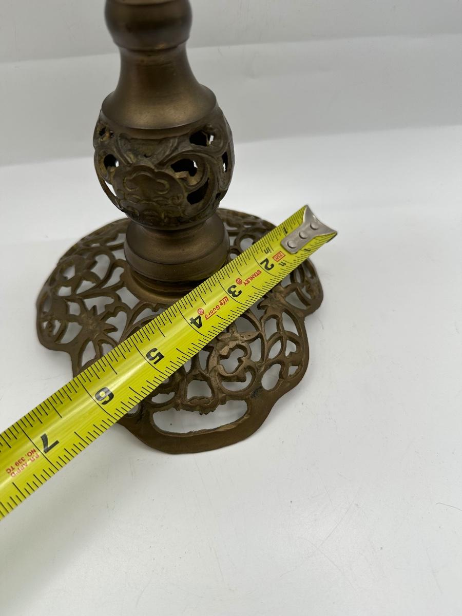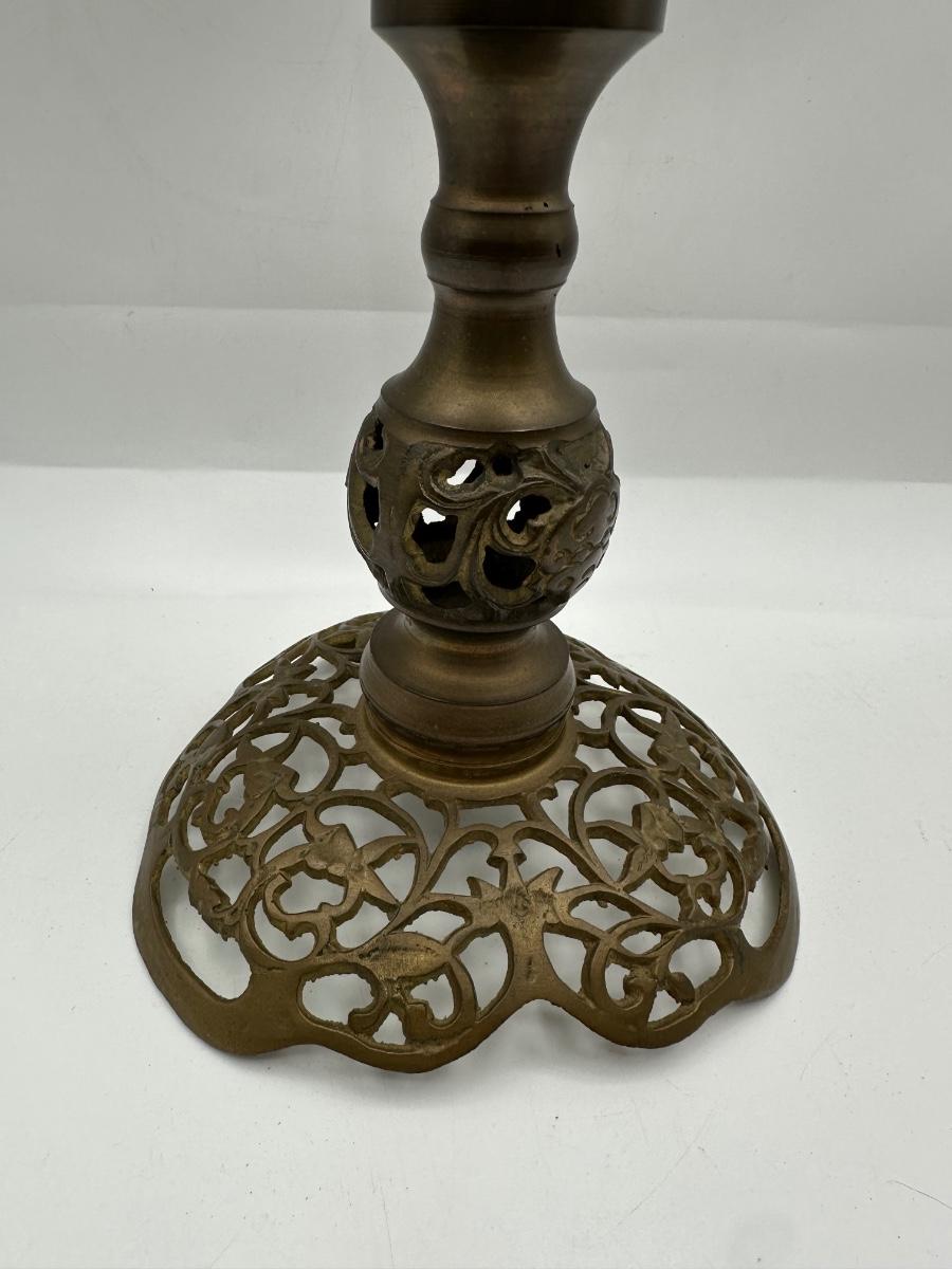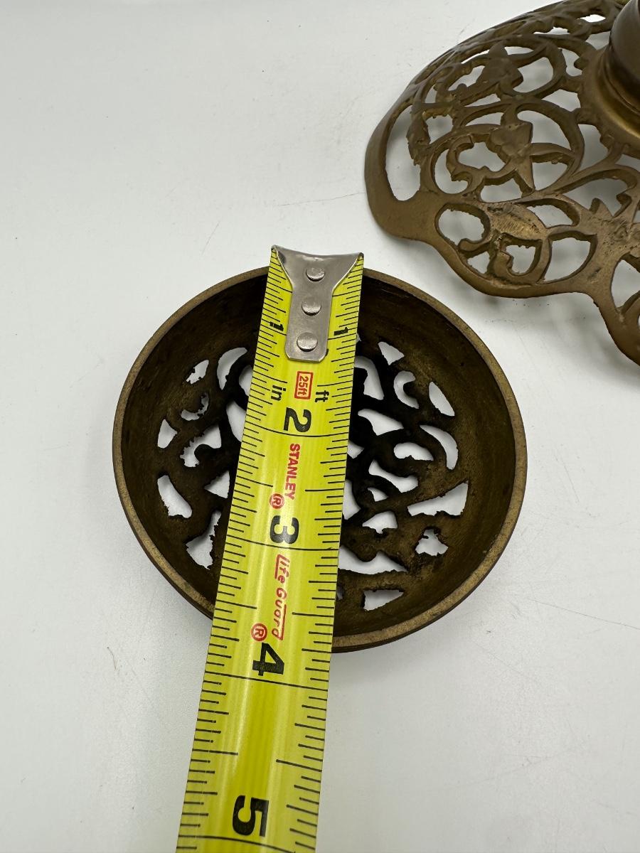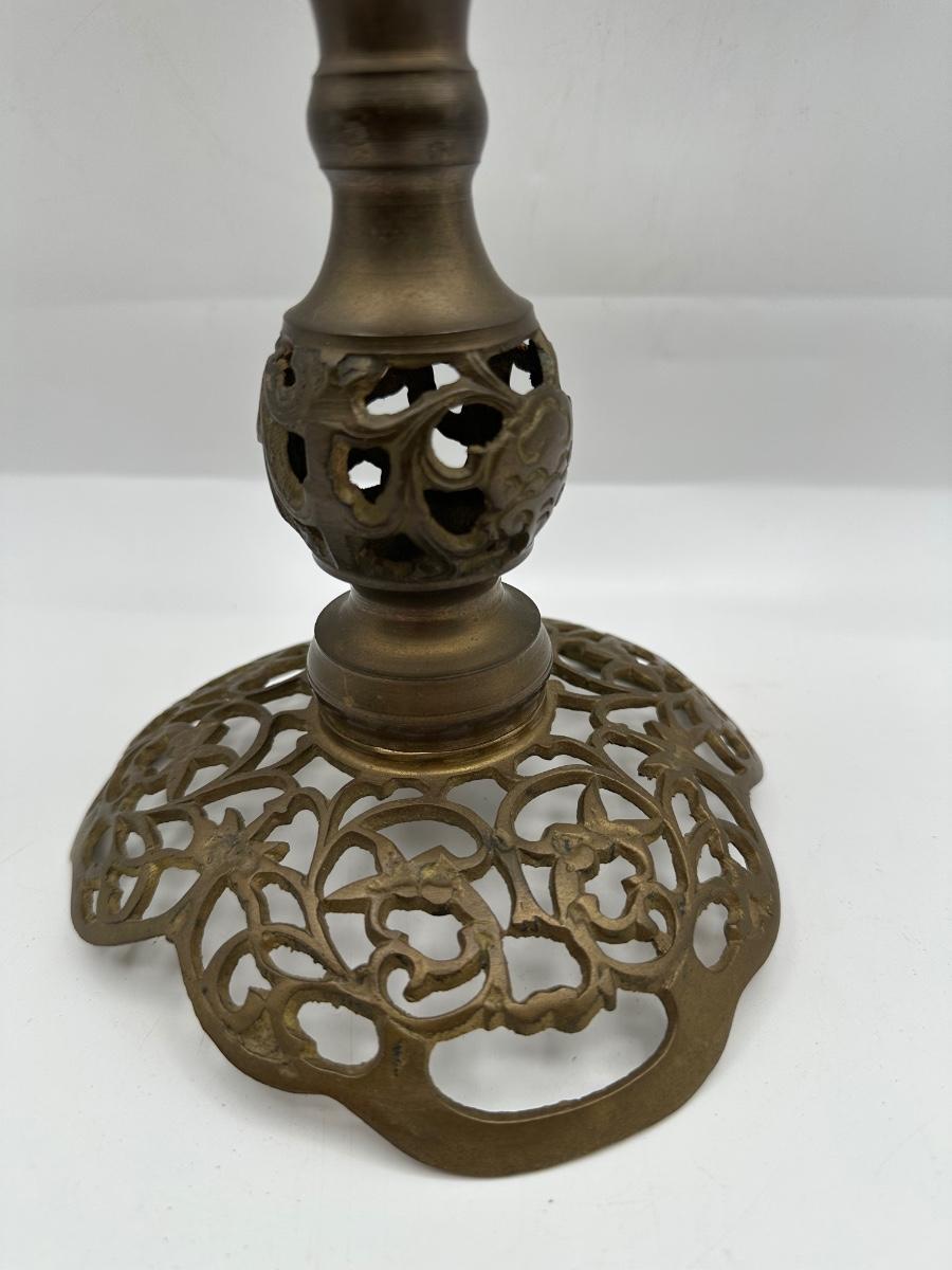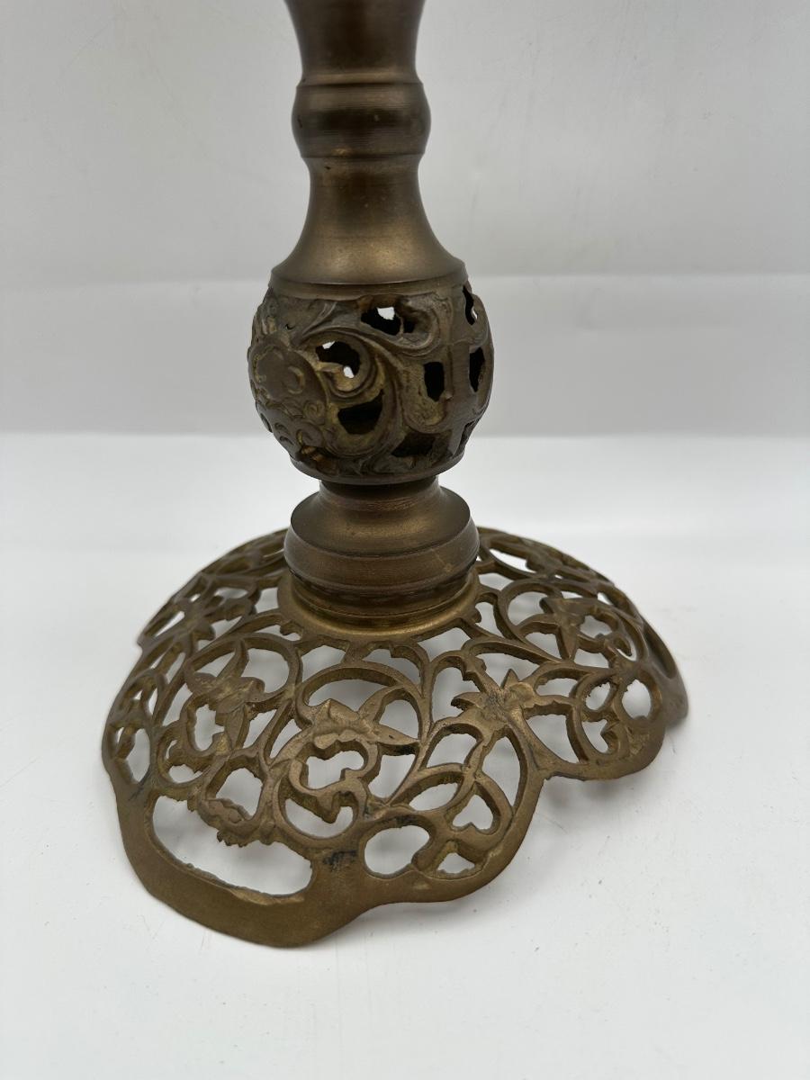 Vintage Chinese brass incense burner stand. This intricately cast and pierced piece features four panels of raised figural scenes, likely depicting scholars or deities in a lush landscape, complete with traditional robes and symbolic foliage. The stem is adorned with openwork floral elements, and the base boasts an ornate filigree design for a balanced, decorative presence.