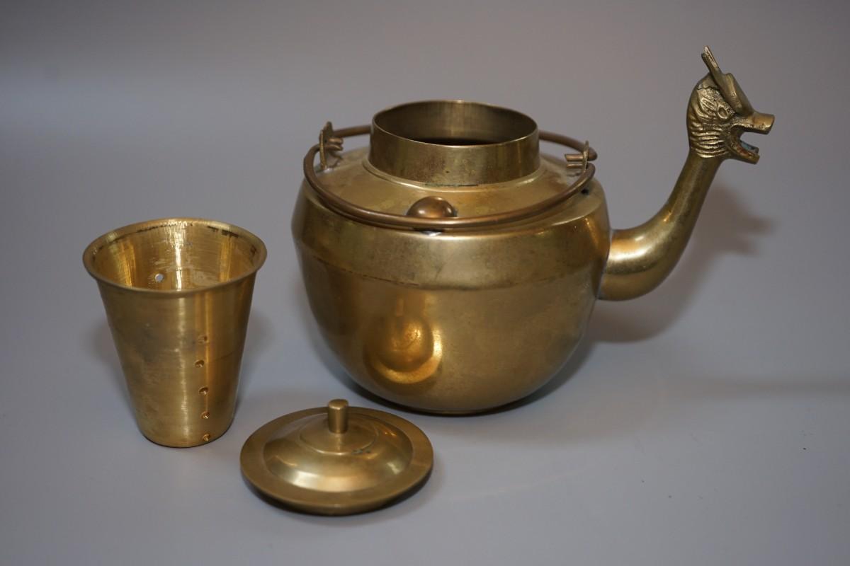 unique and useful brass tea kettle with the insert to hold the tea leaves.