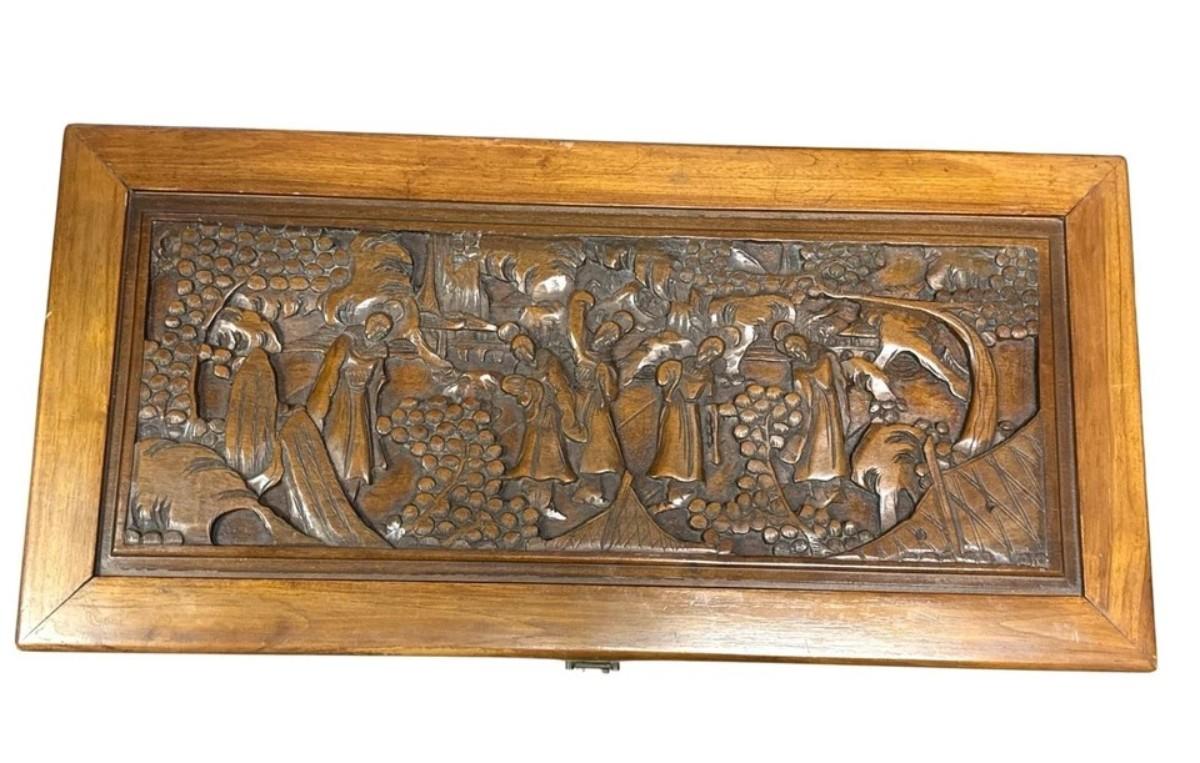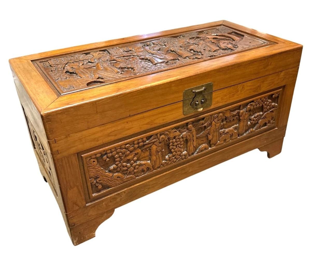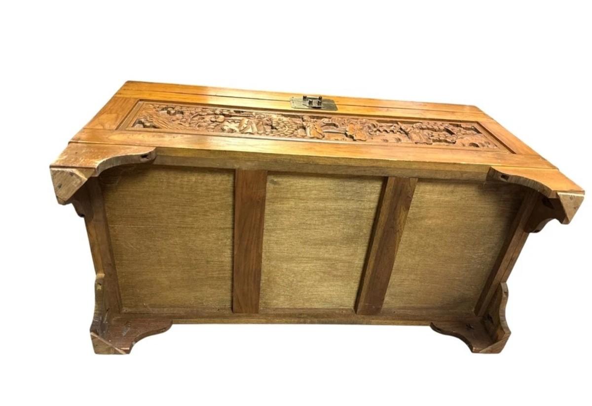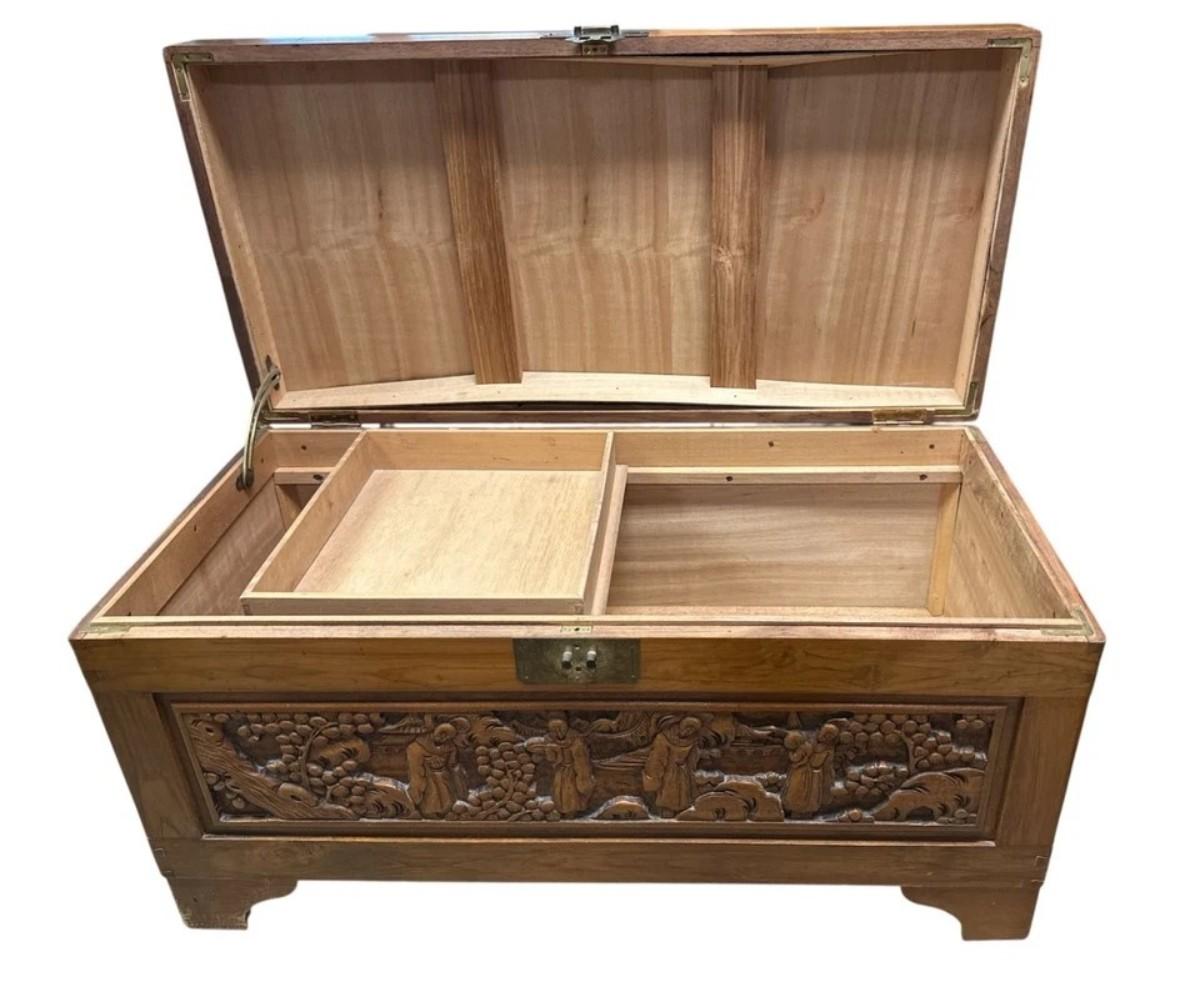 Vintage Chinese Hand Carved Camphor Wood Storage Trunk Chest with one Shelf.