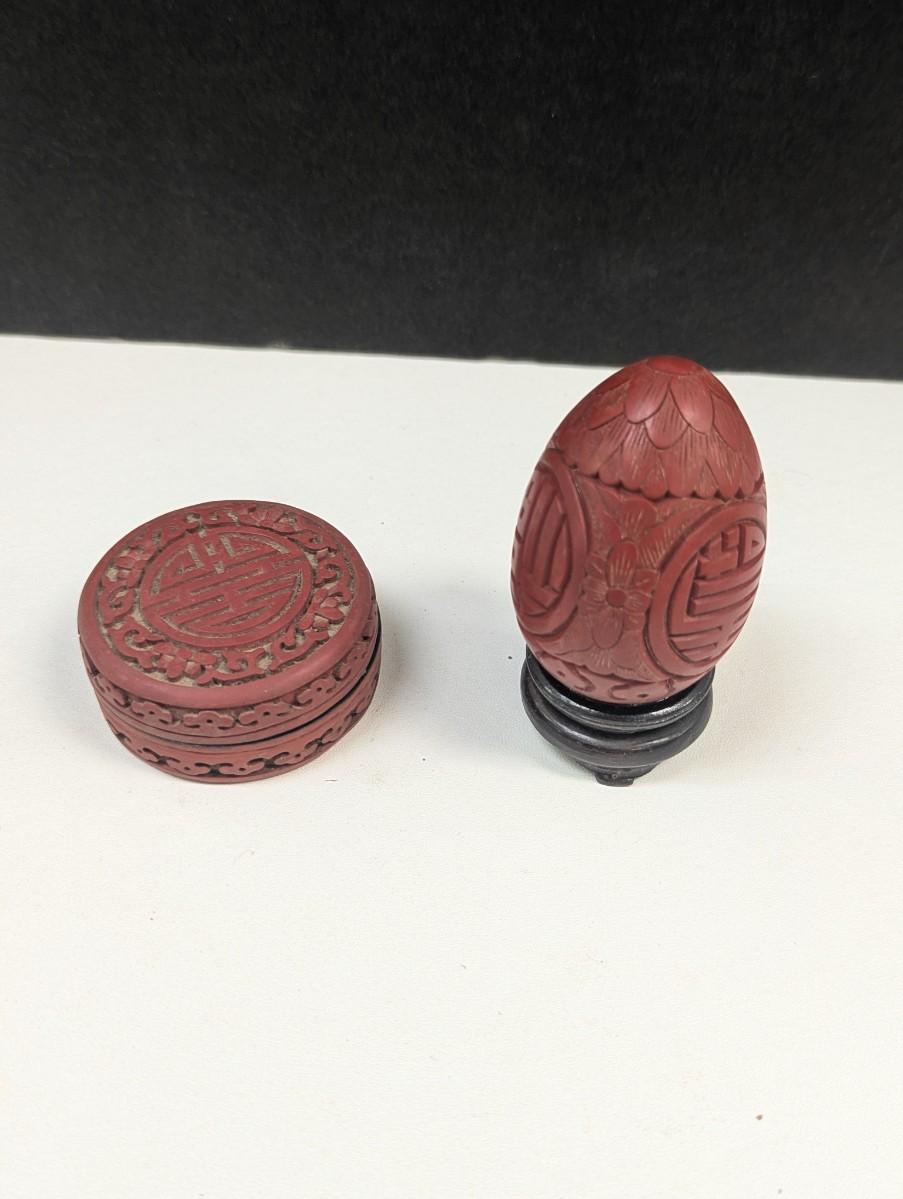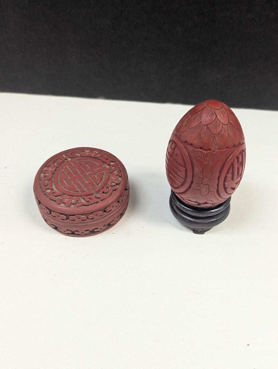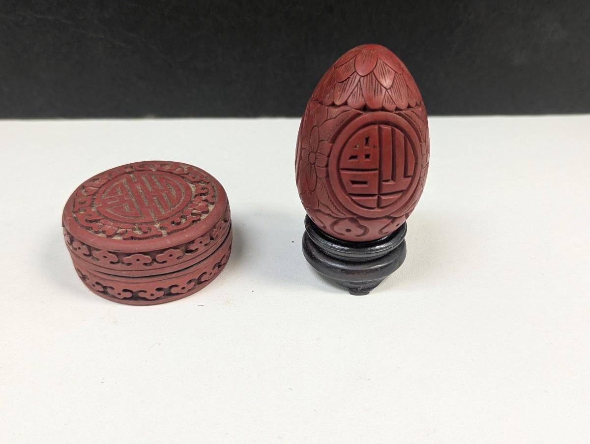 Vintage Chinese Cinnabar Lacquer Carved Wood Box & Carved Cinnabar Egg