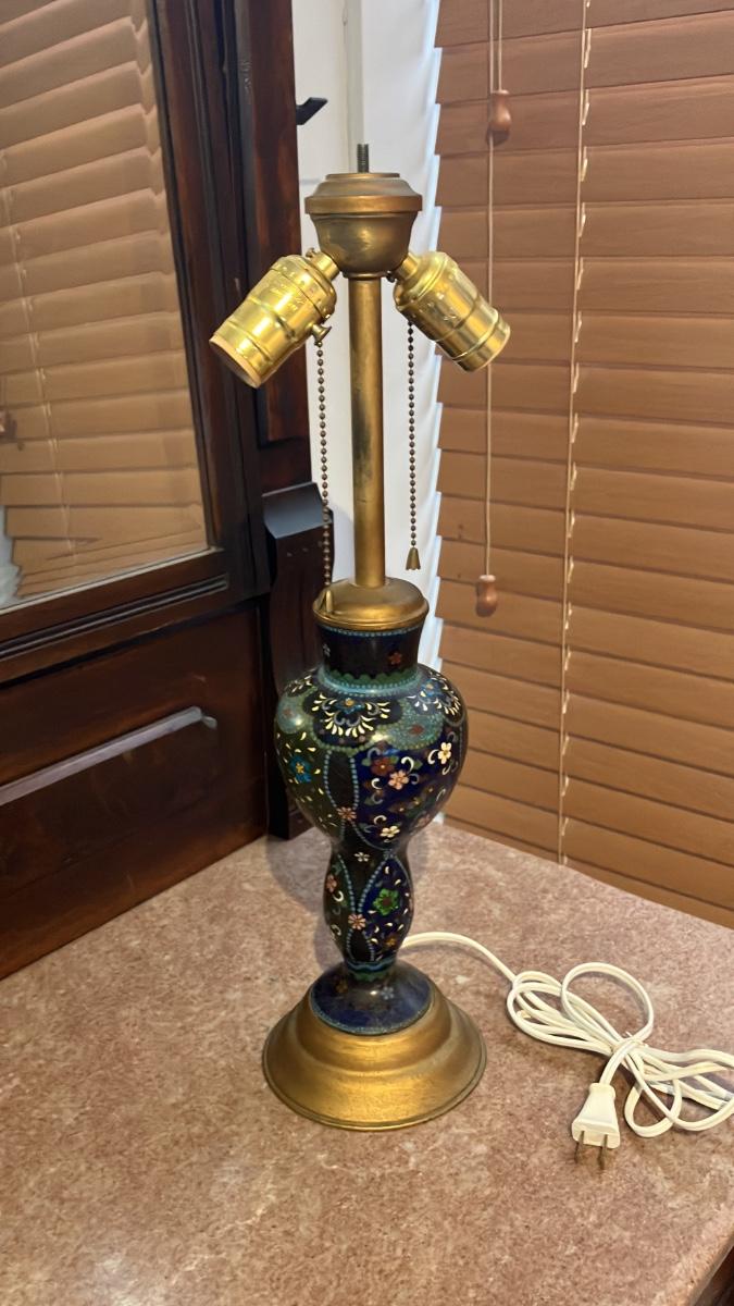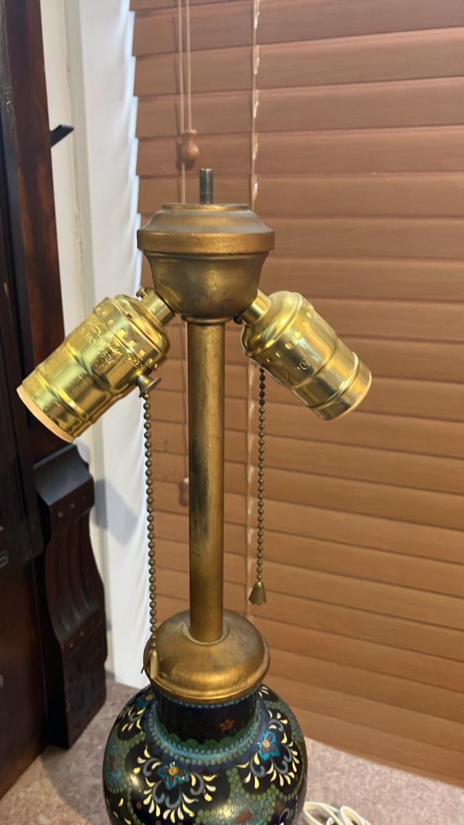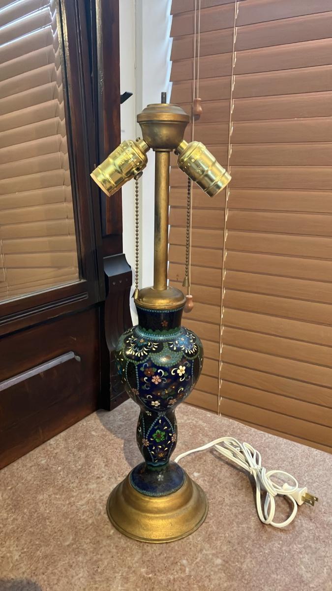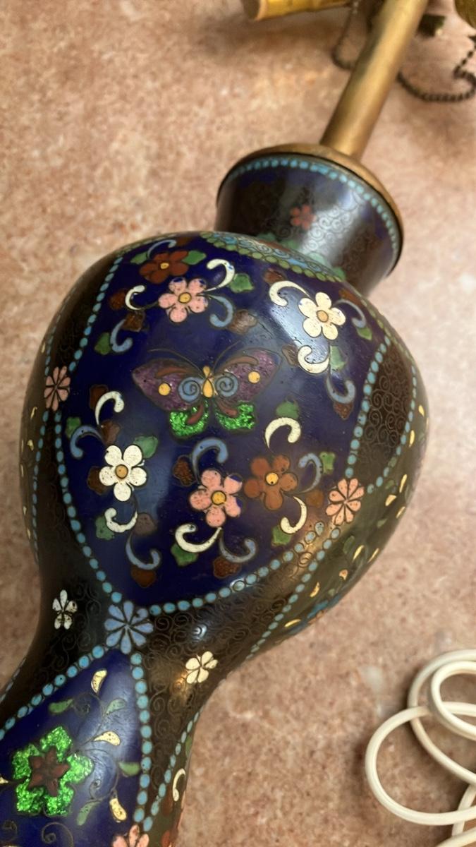 Vintage Chinese Cloisonné Enamel Table Lamp, Floral & Butterfly Motif on Midnight-Blue 20”