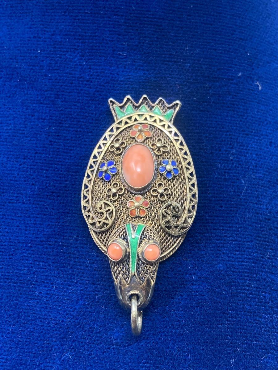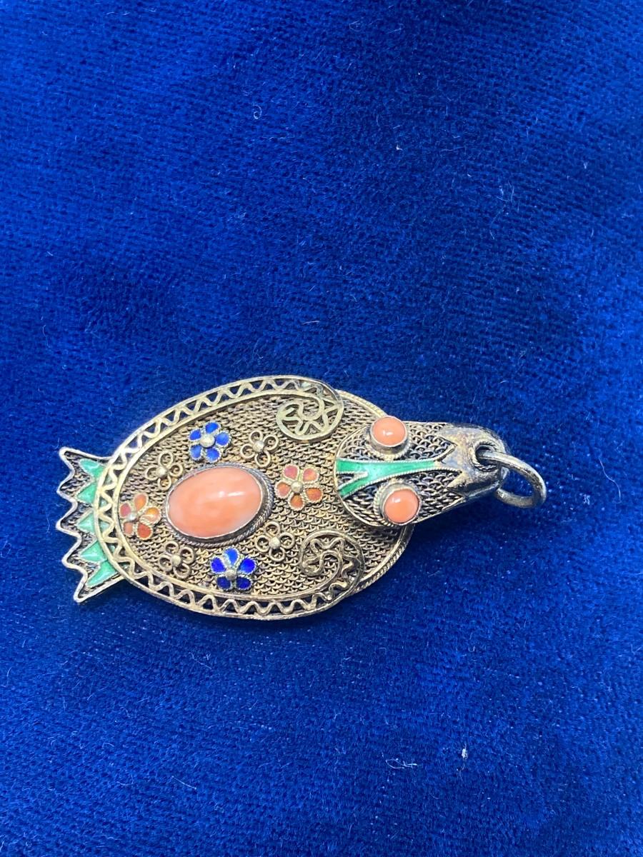 Orange Coral, Silver Filigree, Cabachon with colorful enamel 1 1/2" x 3/4 x 1/2"