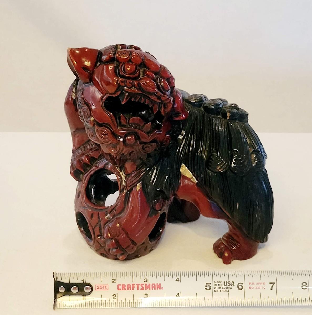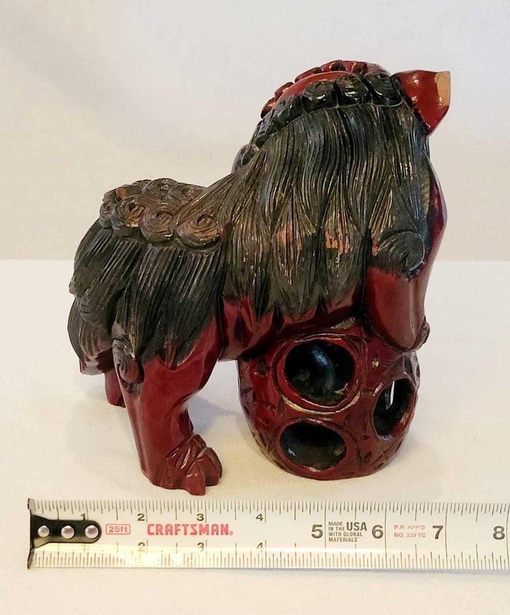 Vintage Mid Century Modern Chinese Carved Red Foo Dog with Floating Ball