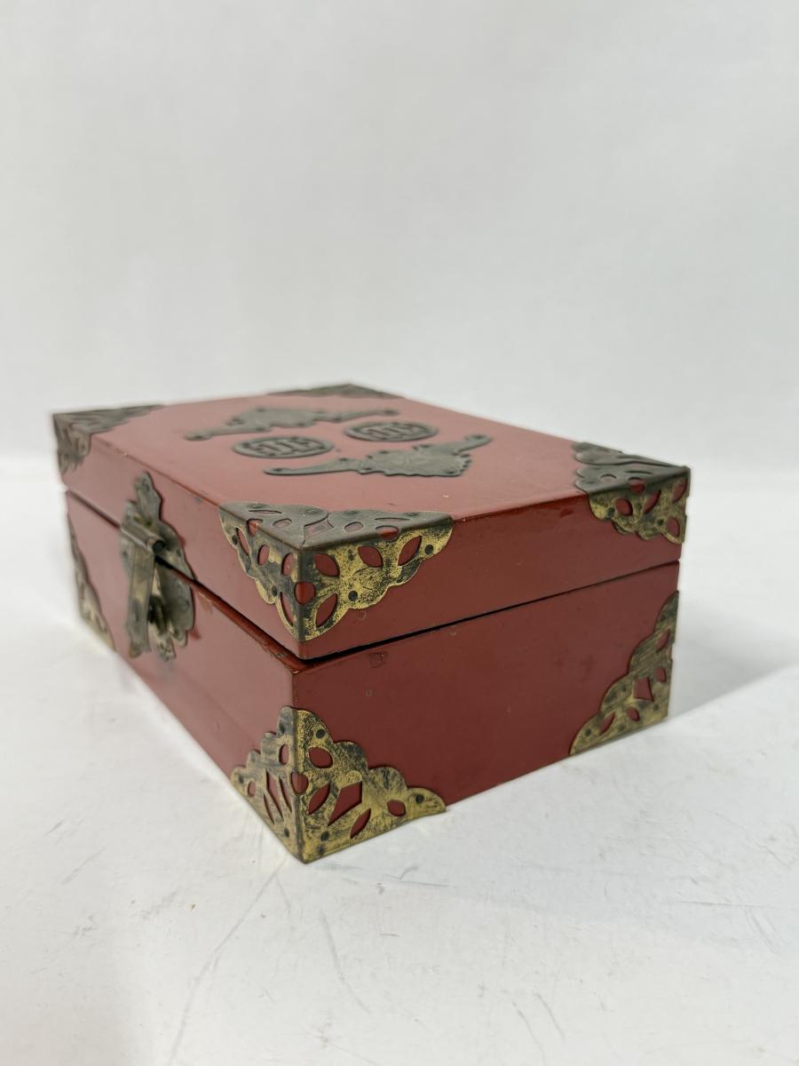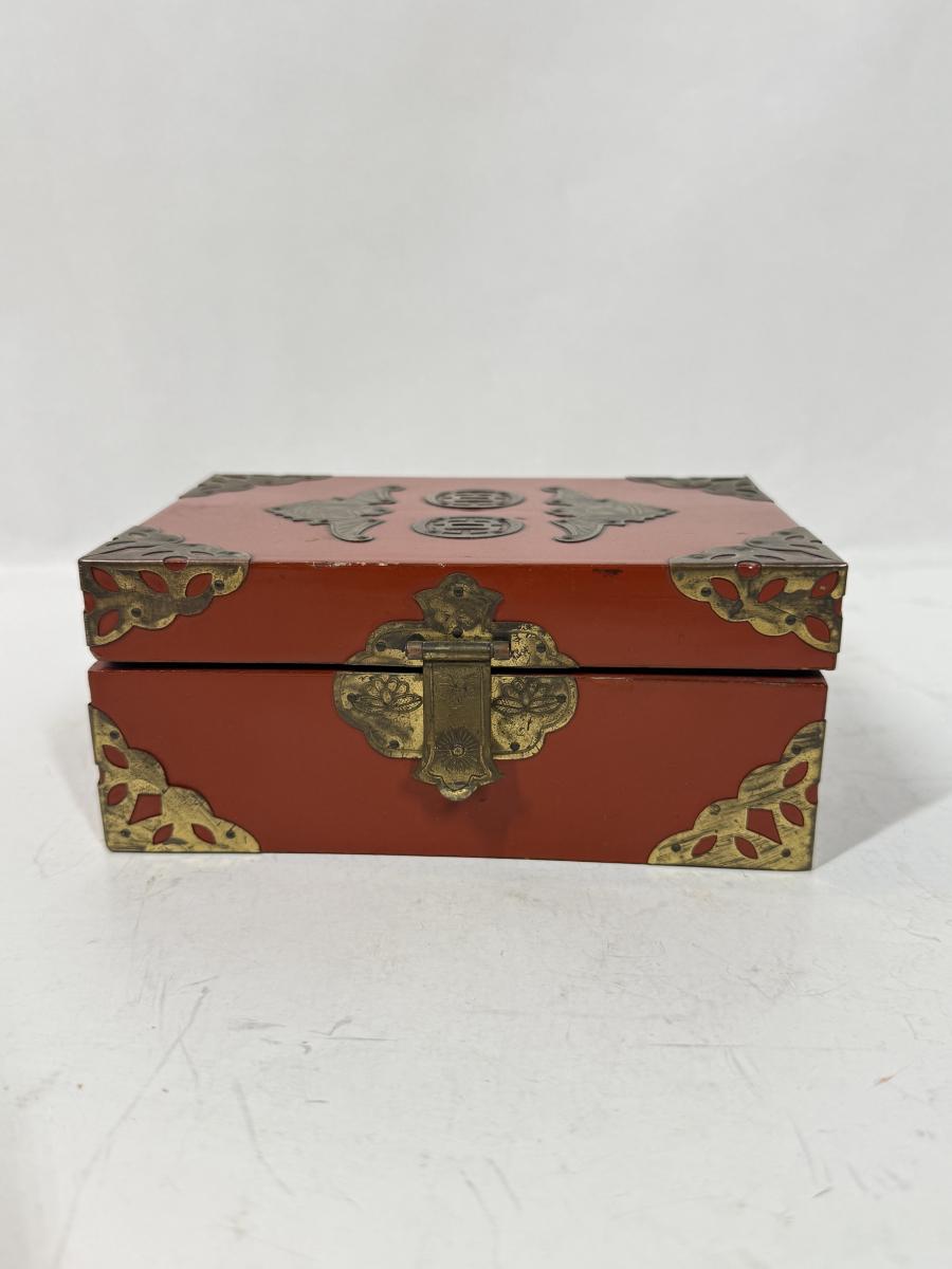 Vintage Chinese Jewelry Box Red Lacquer & Brass Trinket Holder