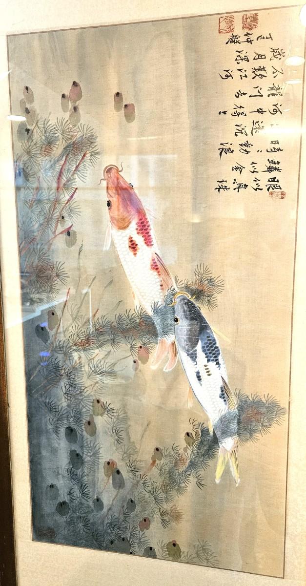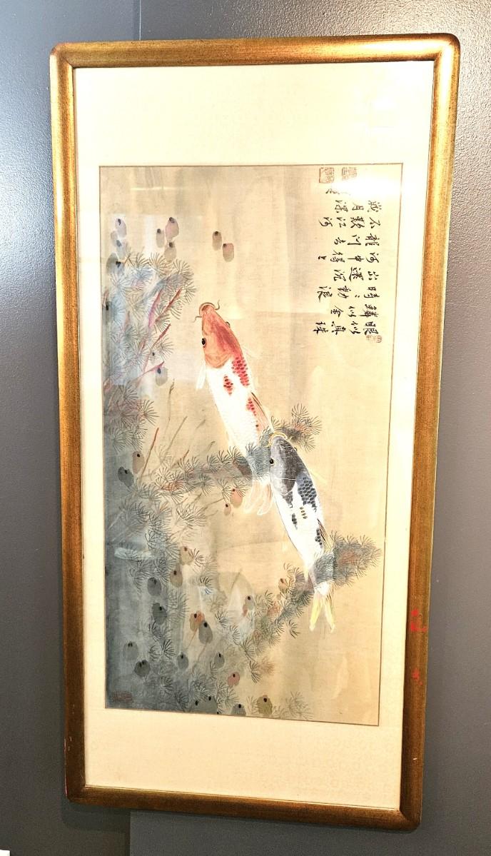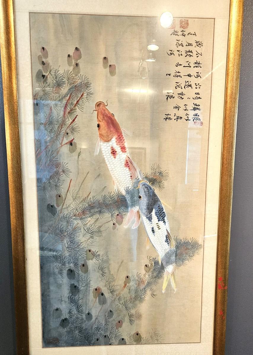 Vintage Chinese KOI Fish Watercolor Painting, 52 x 25