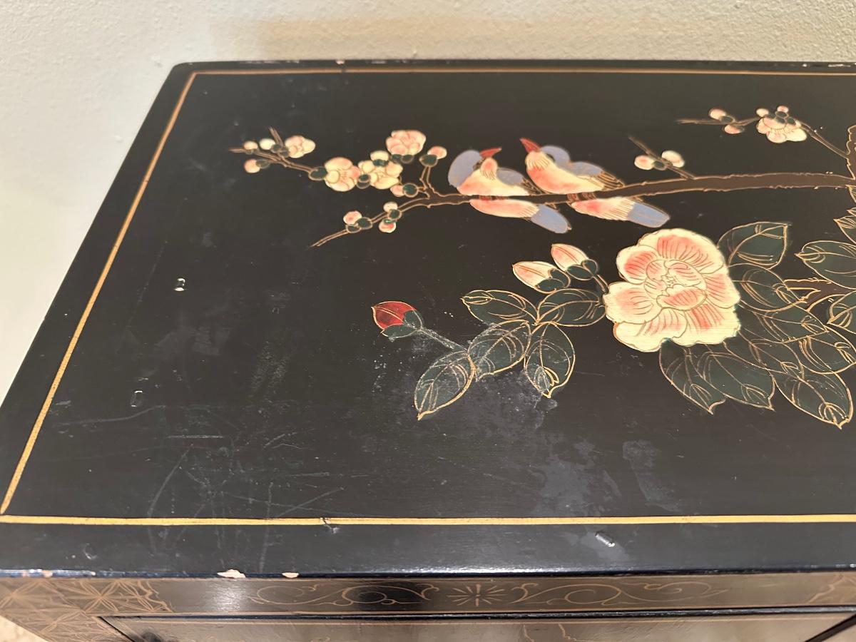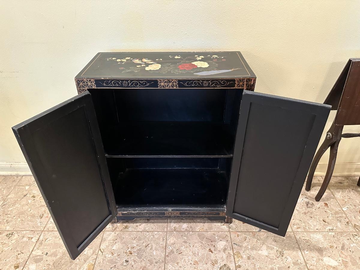 Black lacquer storage cabinet with hand-painted floral and bird designs, gilt accents, and traditional brass hardware.