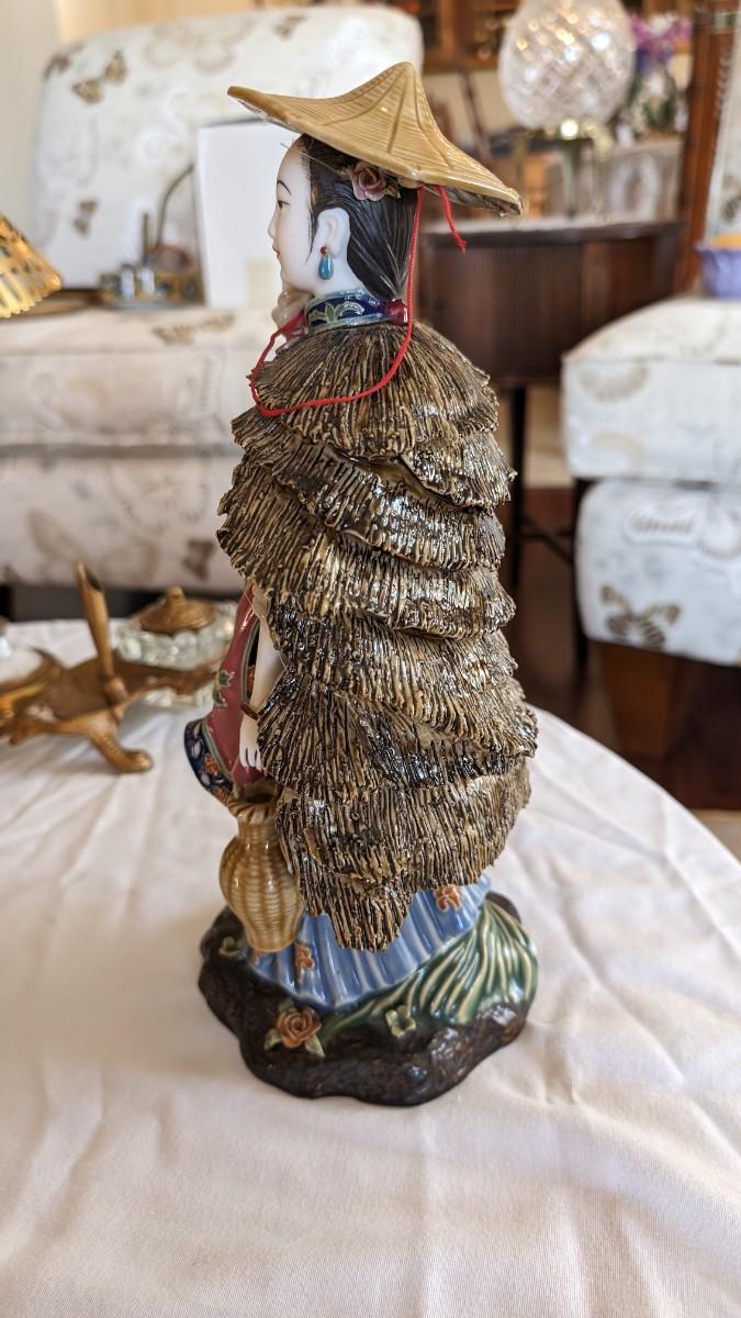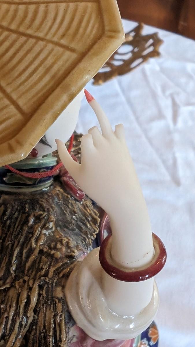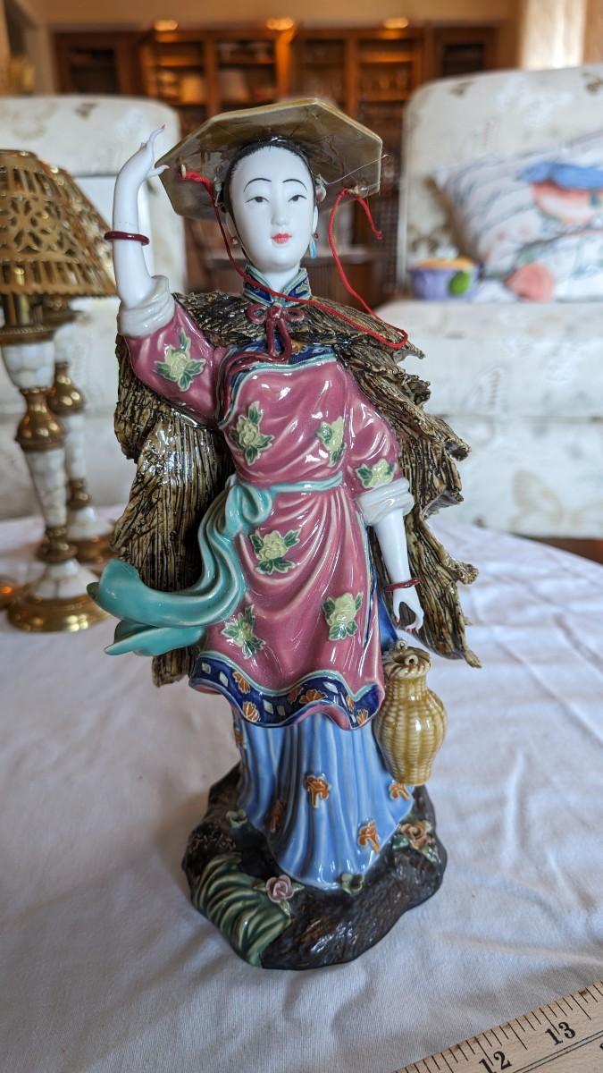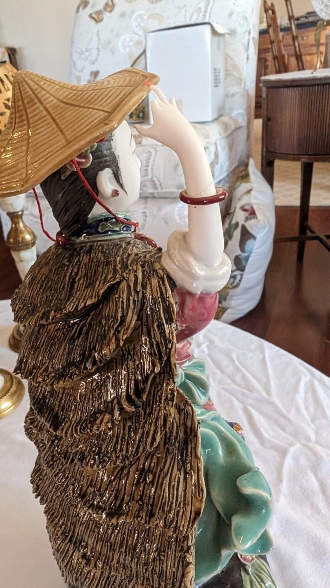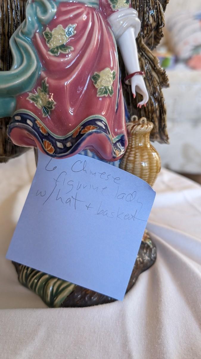 Sold AS-IS. This is a beautiful vintage figurine of an Chinese lady in the wind approximately 11.5" tall. Bracelets move on her wrists. Her right fingers are broken and the hat has a glued crack. The basket does not have a handle.