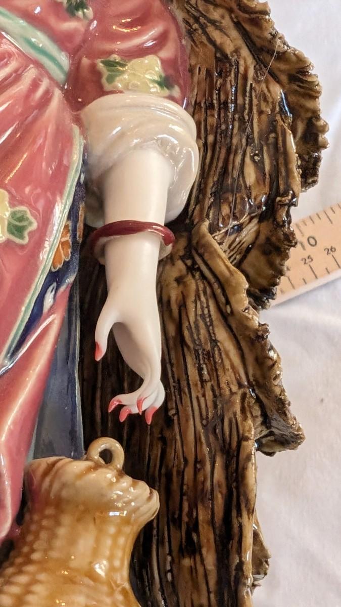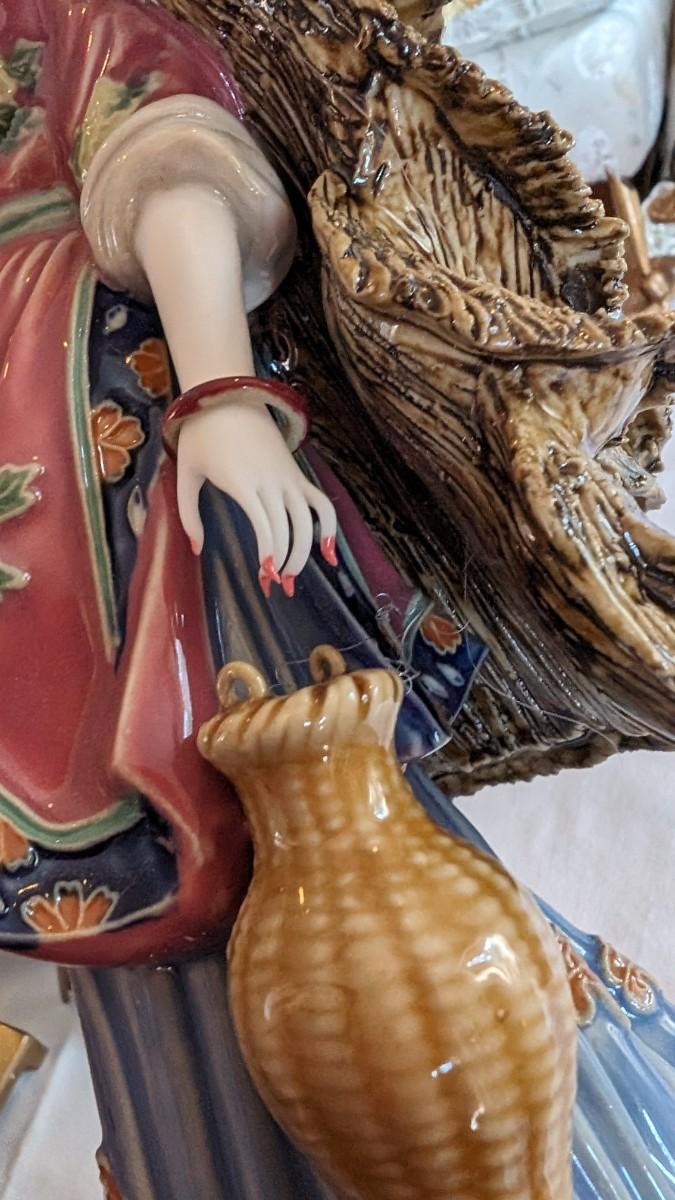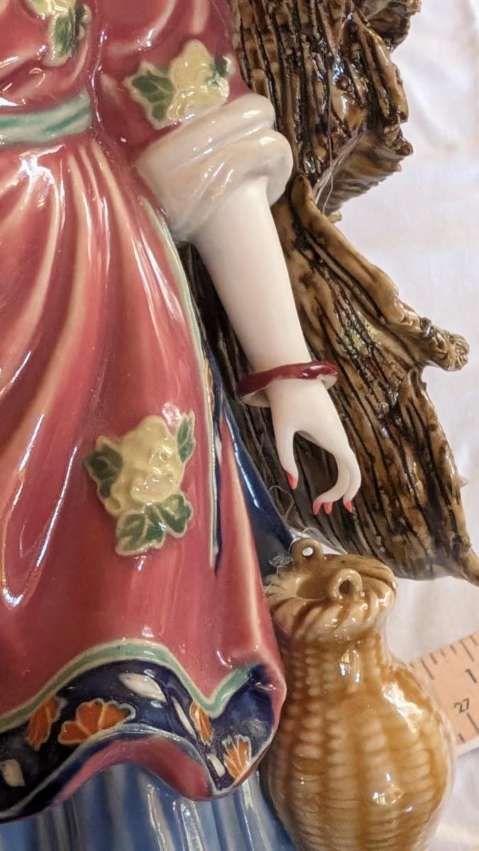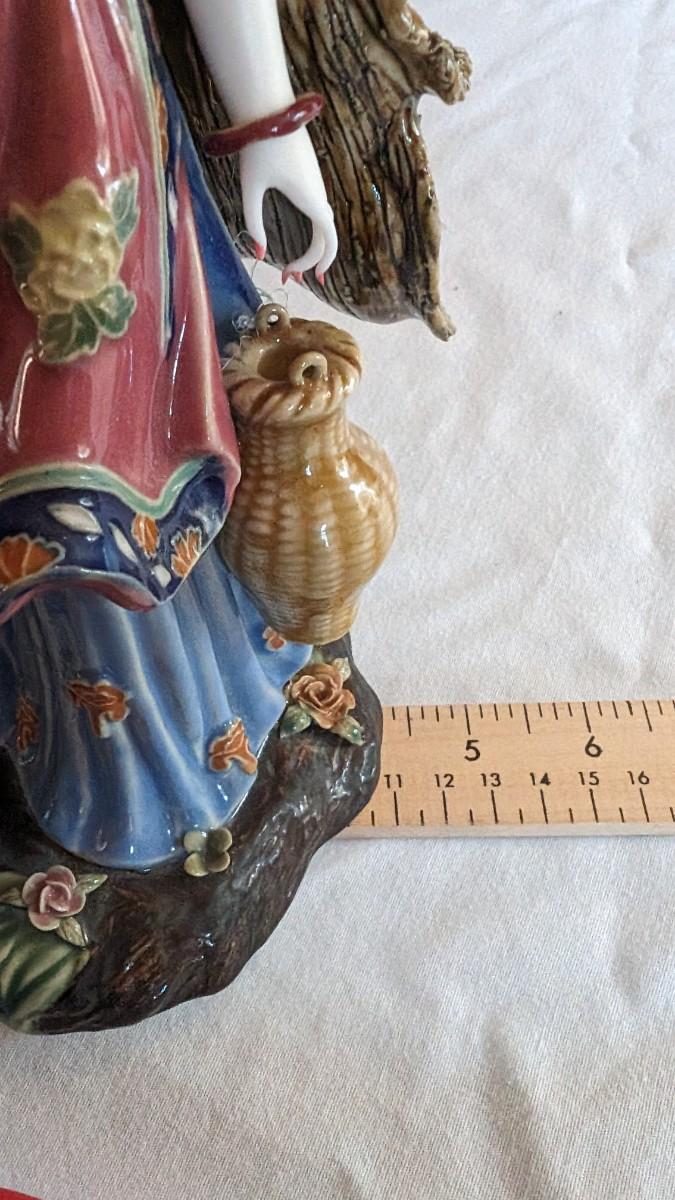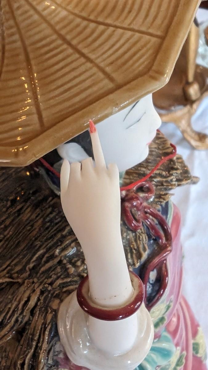 Sold AS-IS. This is a beautiful vintage figurine of an Chinese lady in the wind approximately 11.5" tall. Bracelets move on her wrists. Her right fingers are broken and the hat has a glued crack. The basket does not have a handle.