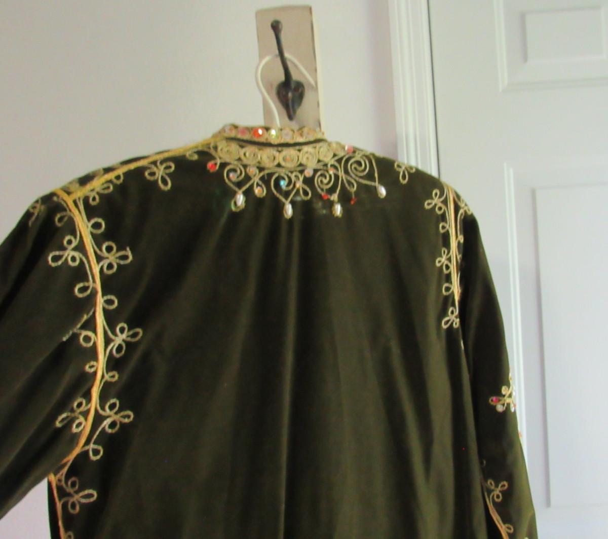 Mostly in very good shape. Fully lined, good shape. Beads, sequins, rhinestones, some missing in spots. Very heavy velvet, heavy to ship. No labels, size unknown. Shipping available at shipping cost plus $5.00 per box handling fee. No returns or refunds. See our terms for details.