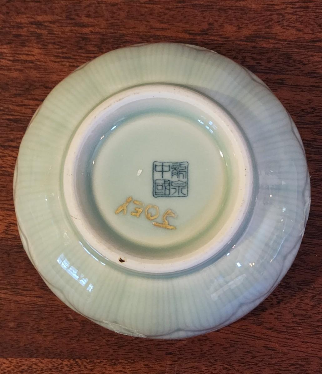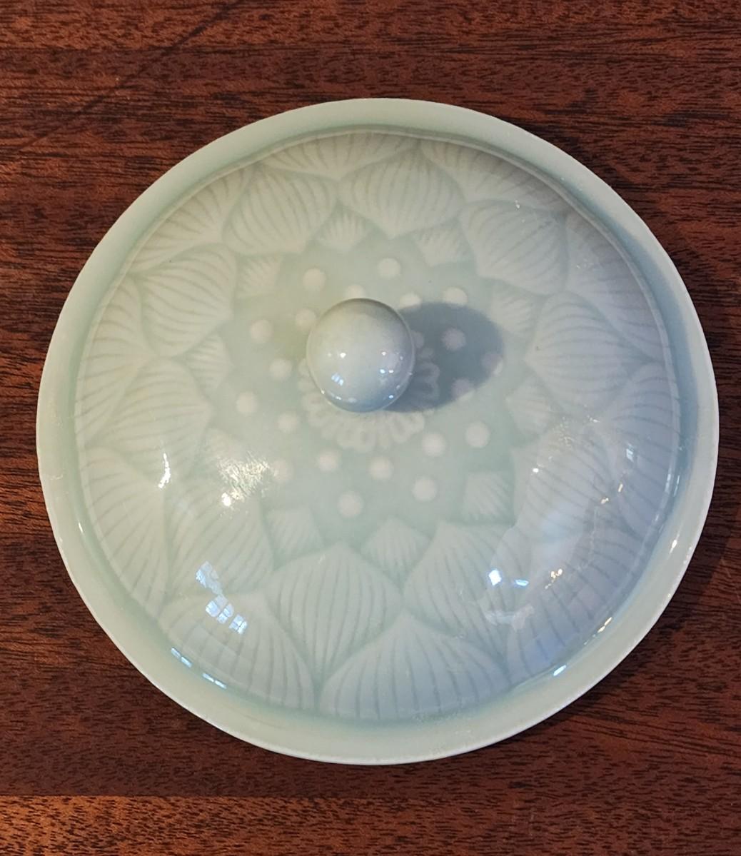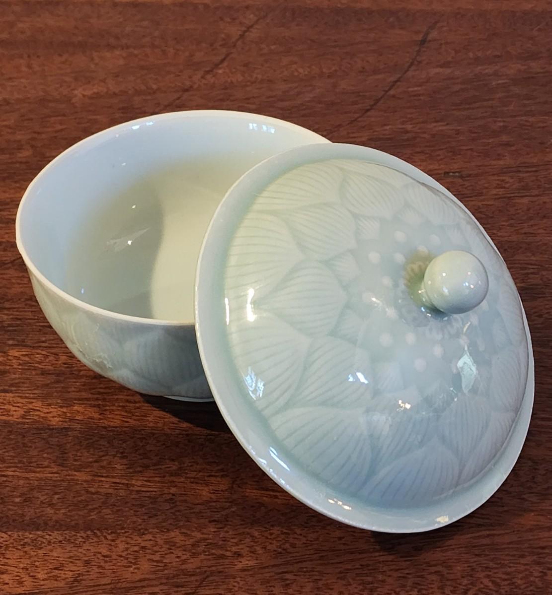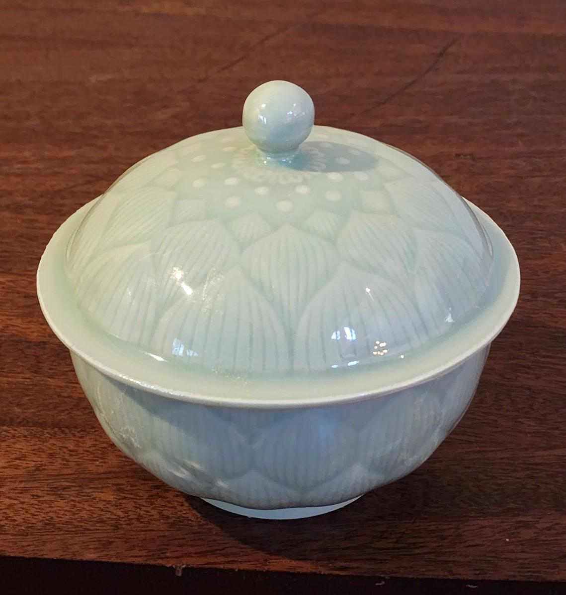 5 1/2" Covered Chinese Celedon porcelain bowl, delicately painted with lustrous finish.