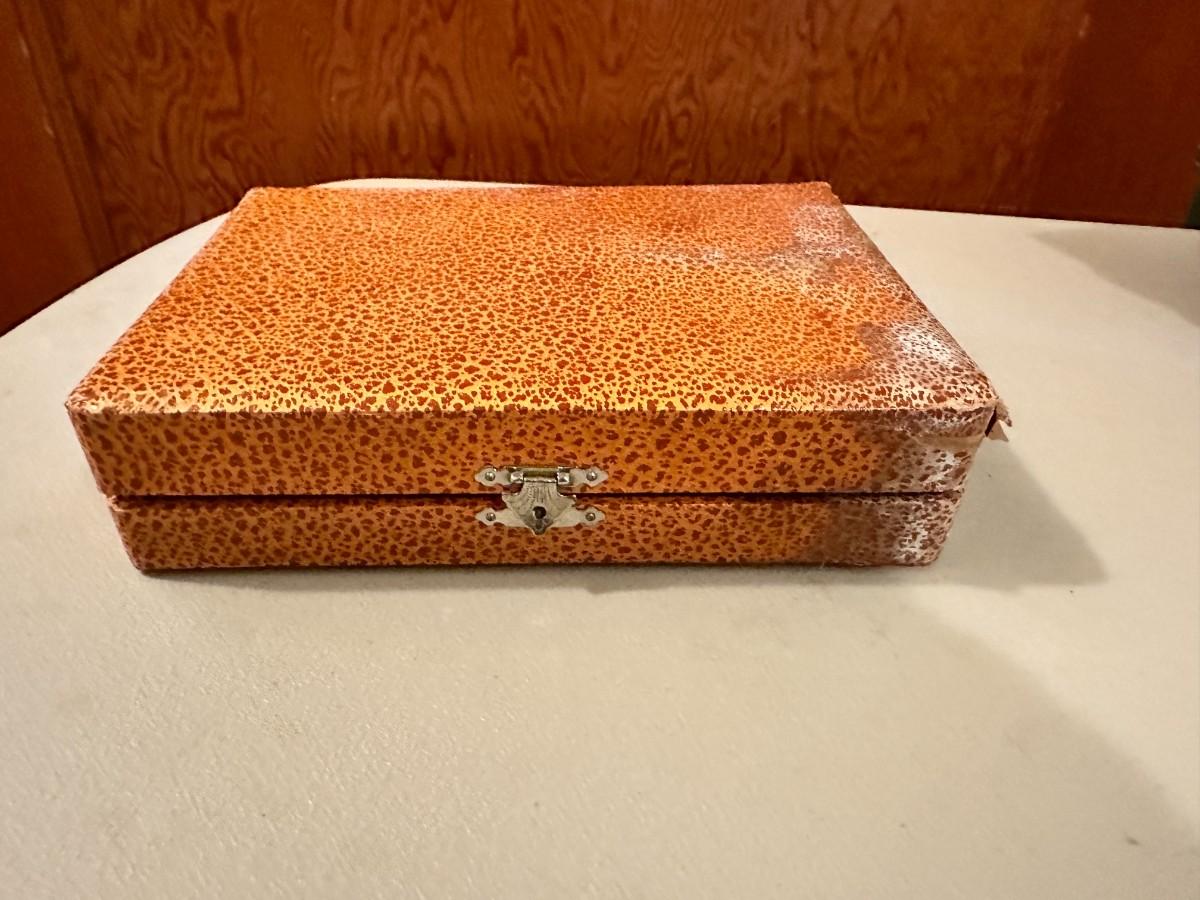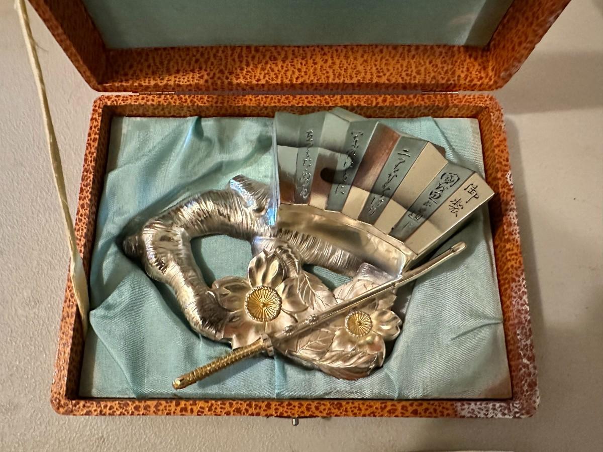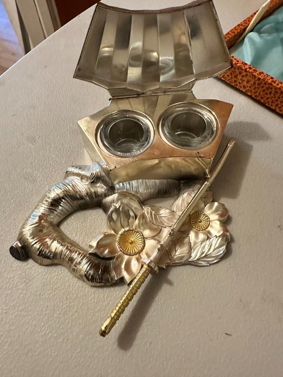 Vintage Chinese Metal Desk Ink Set Decorated with Sword in Original Wooden Box