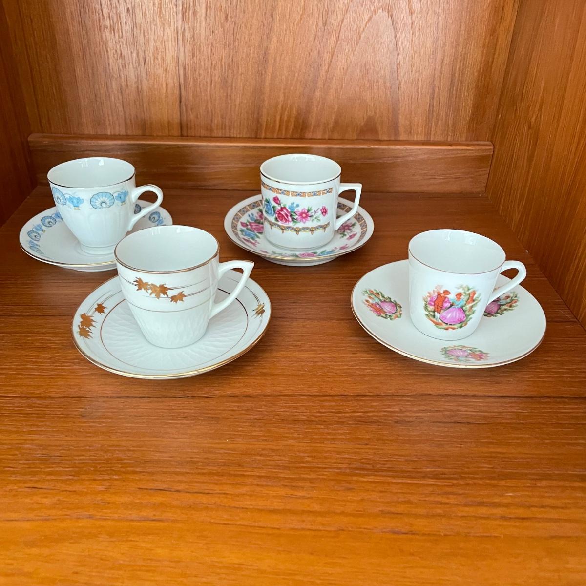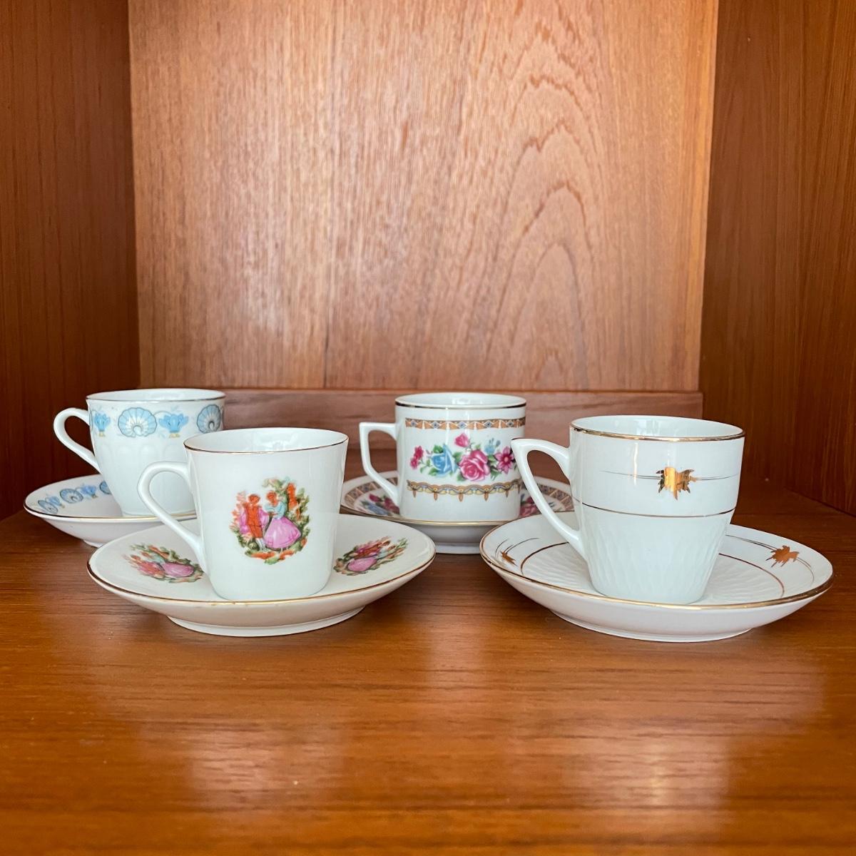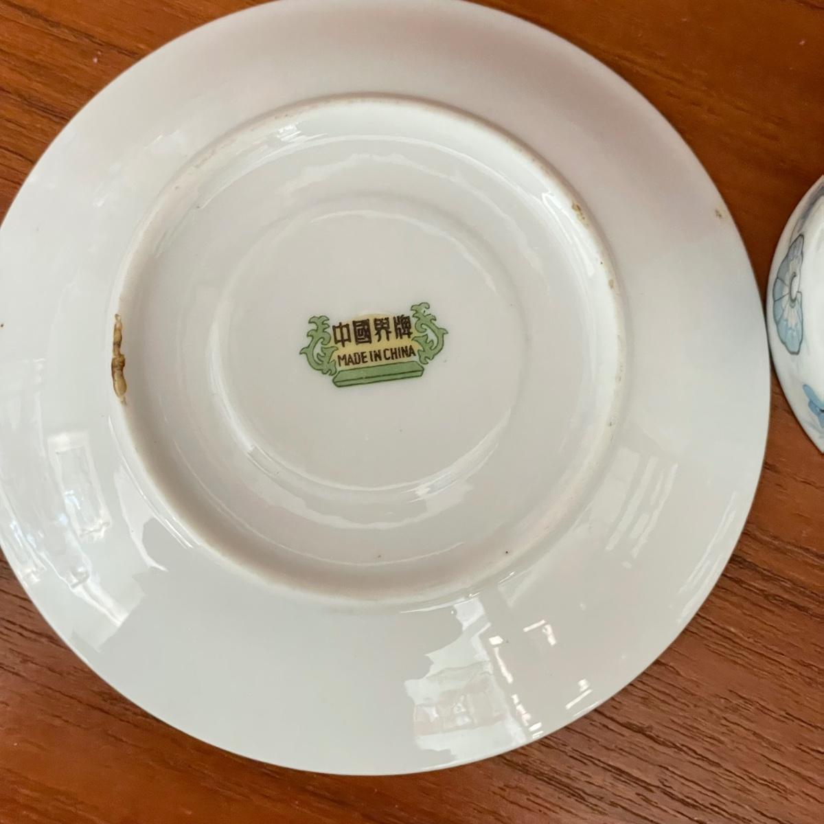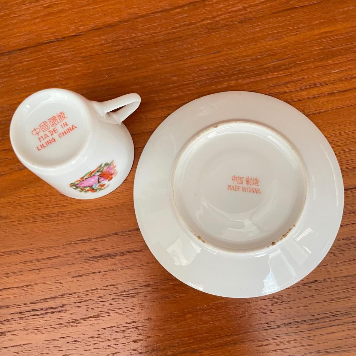 Four delicate vintage Chinese teacups and saucers. All have gold colored accents, except the blue seashell cup appears to have more of a silver tone than its saucer and the rest of the sets. Three of the four cups measure just over 2” tall. See images. Shipping available.