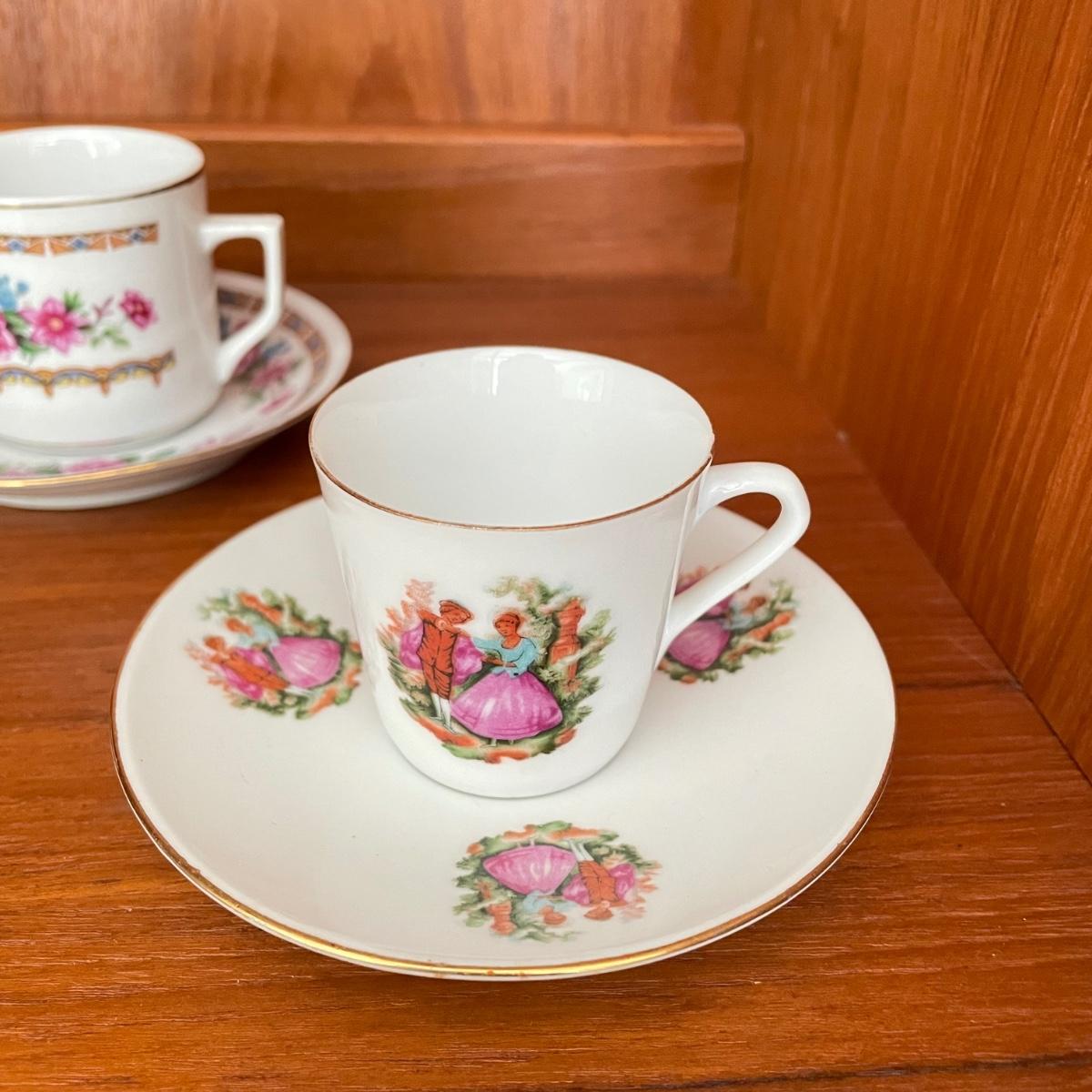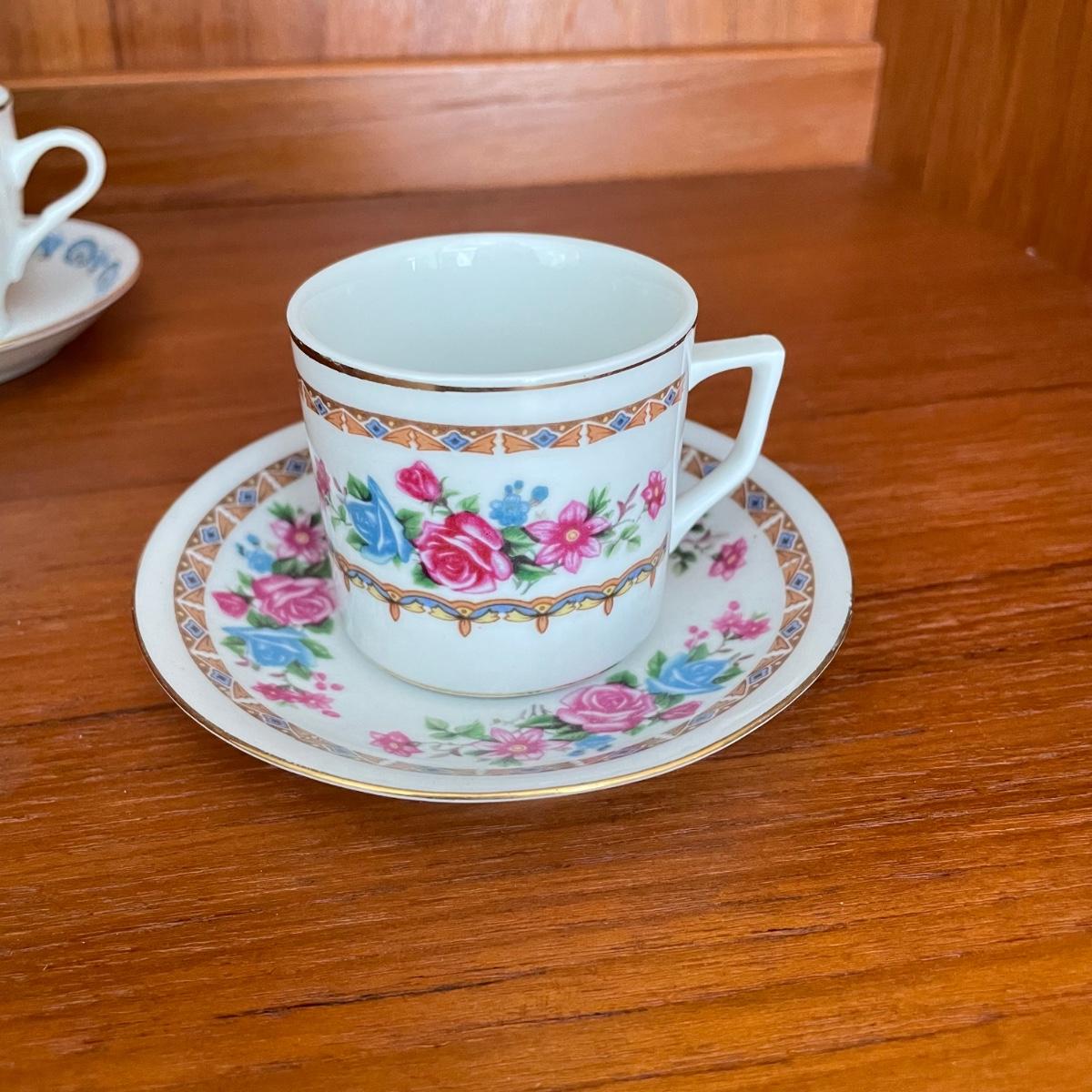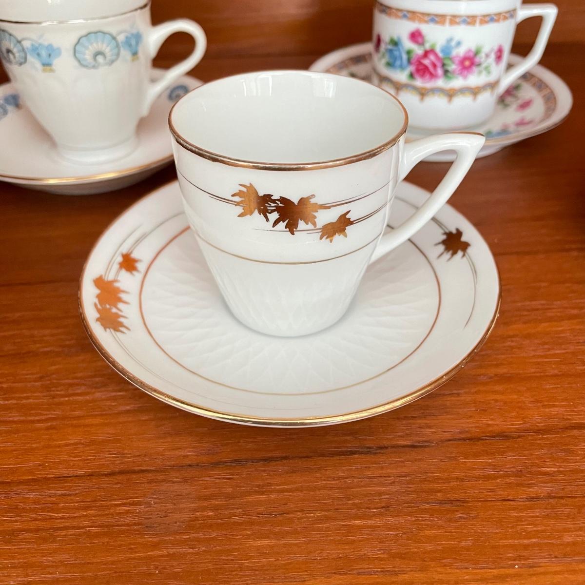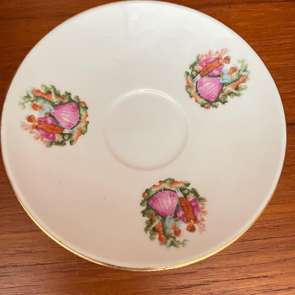 Four delicate vintage Chinese teacups and saucers. All have gold colored accents, except the blue seashell cup appears to have more of a silver tone than its saucer and the rest of the sets. Three of the four cups measure just over 2” tall. See images. Shipping available.