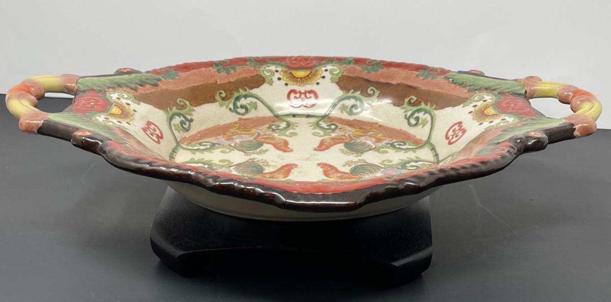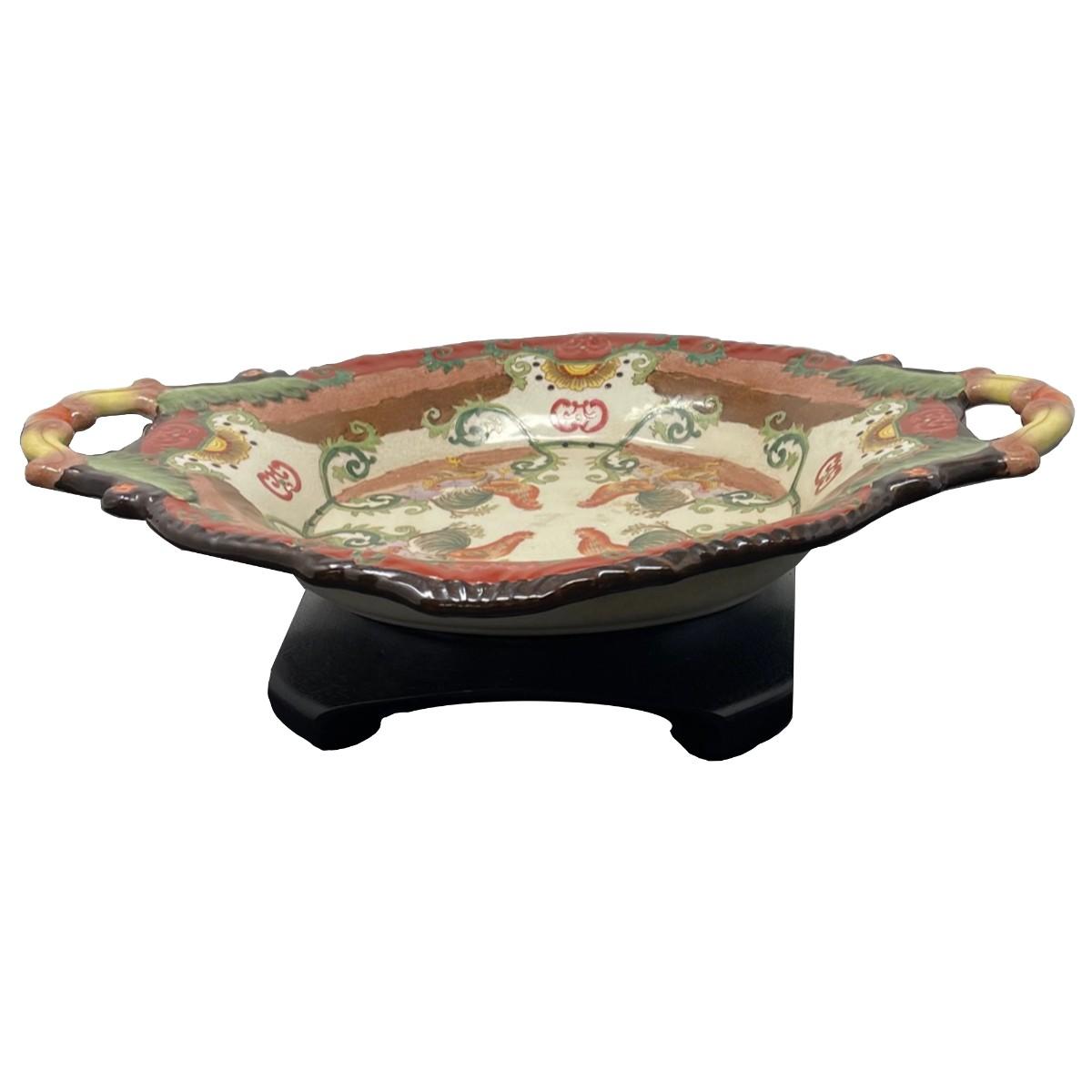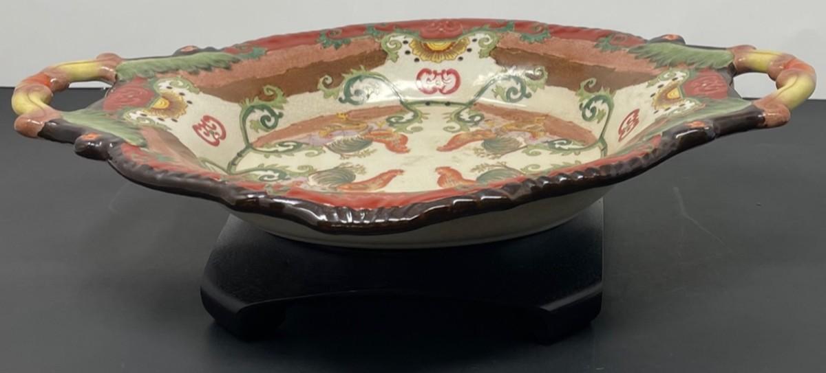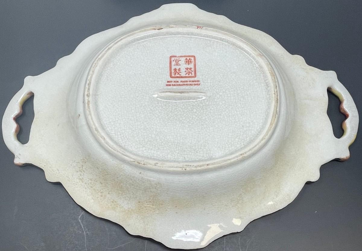 Description: Vintage Chinese Oval plate with handle/ Stamped Measurement approximate: 15"l x 11"w x 2.5"h; Material: Porcelain