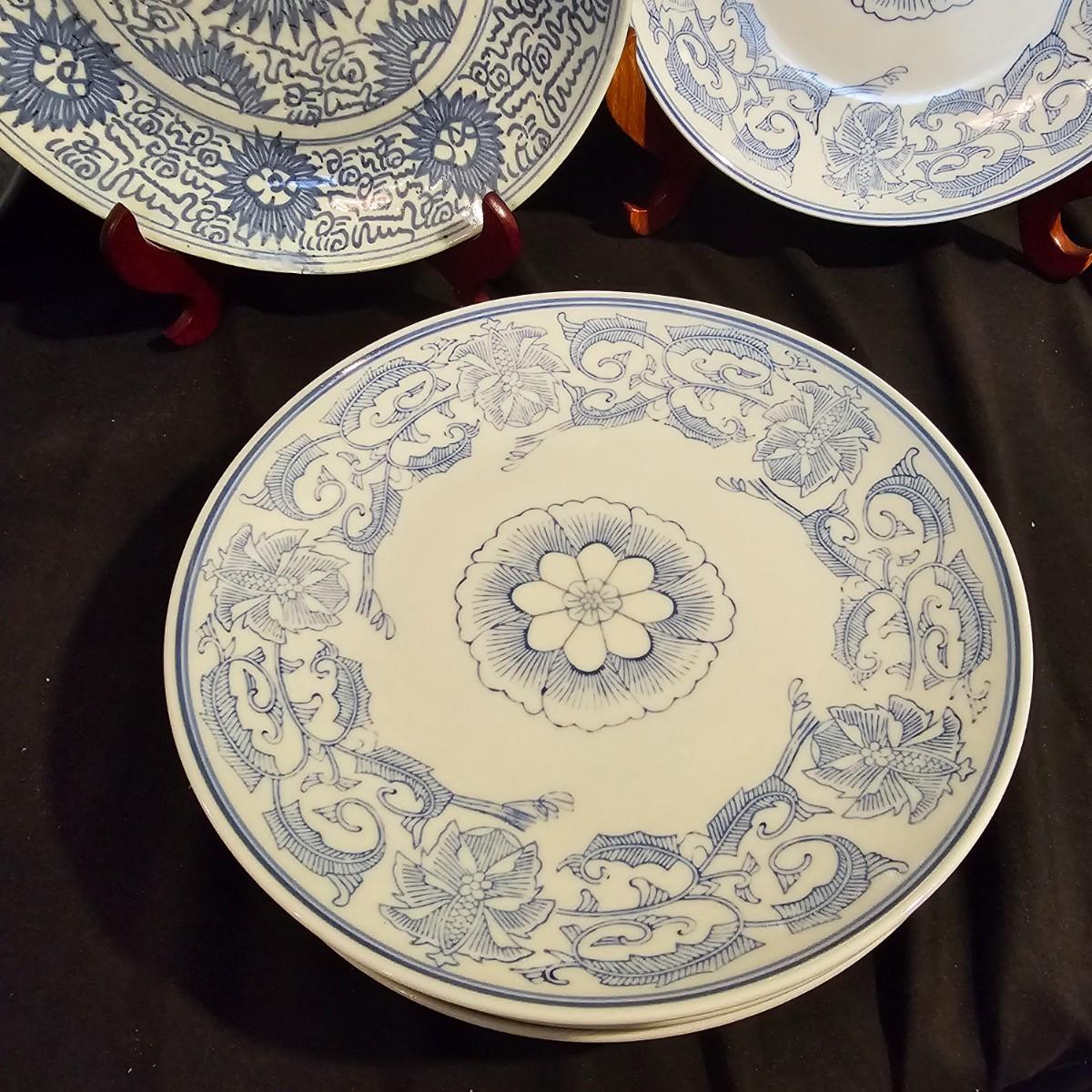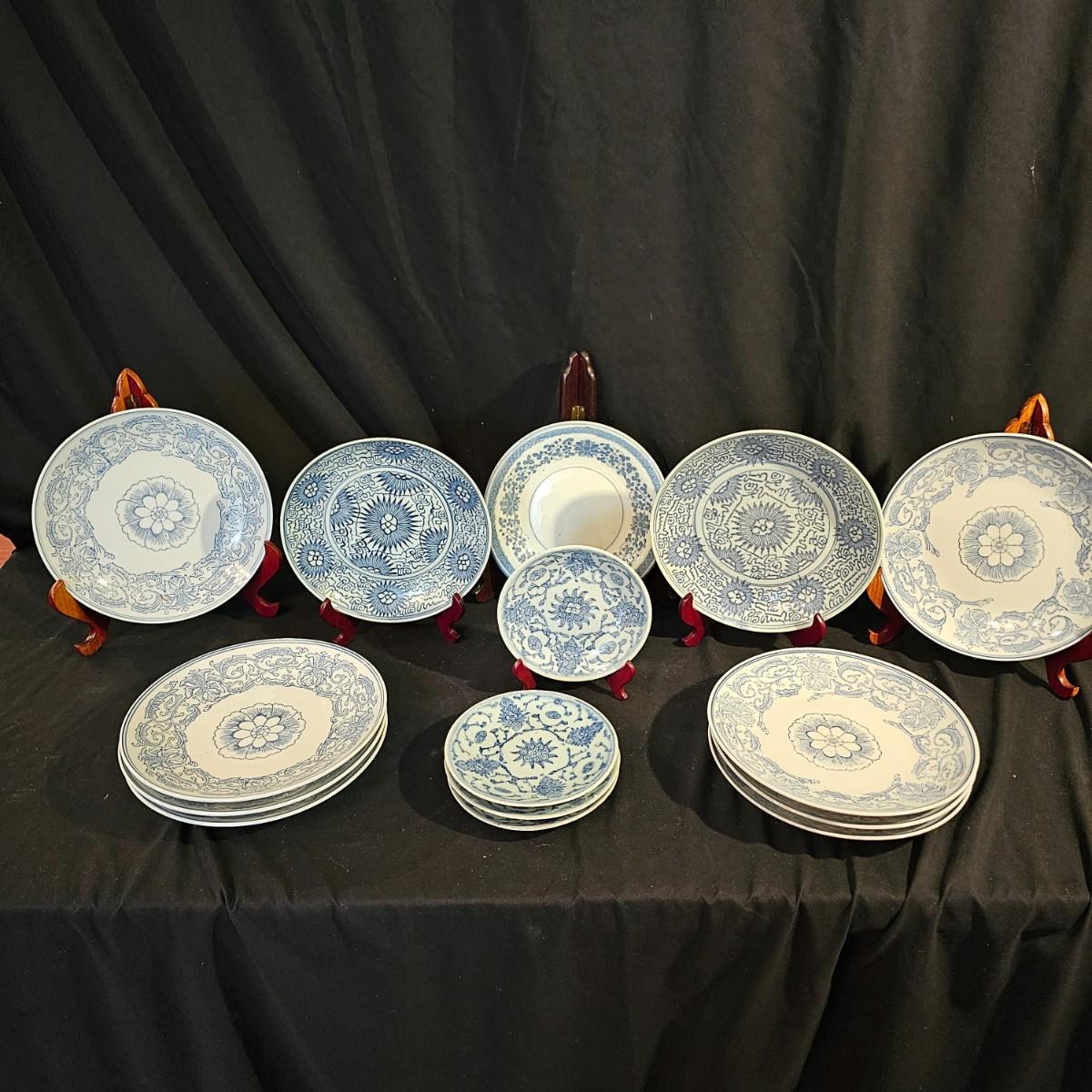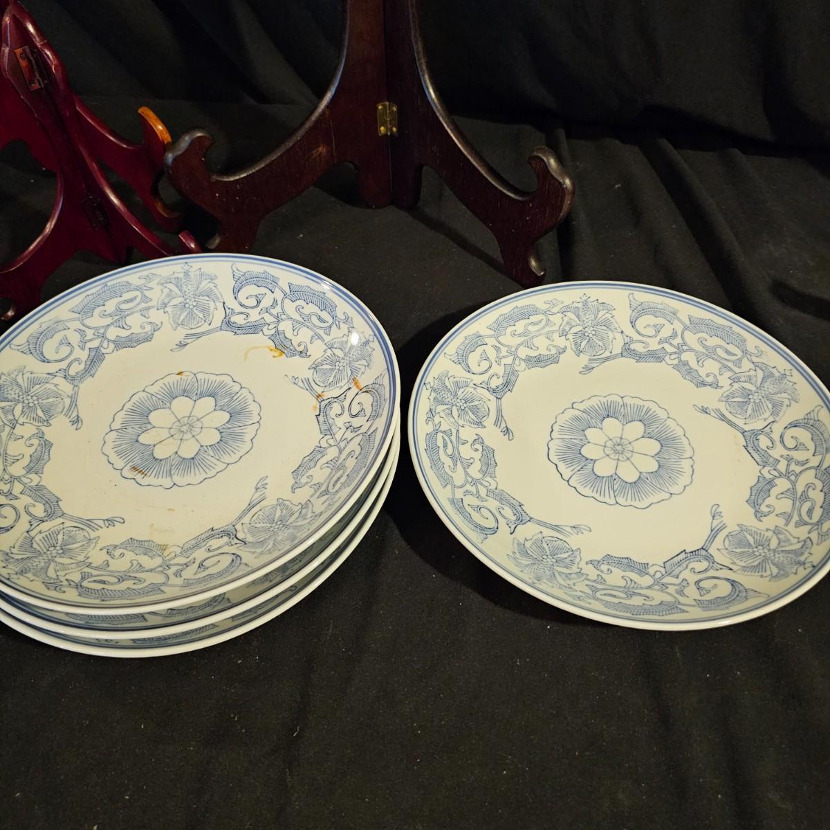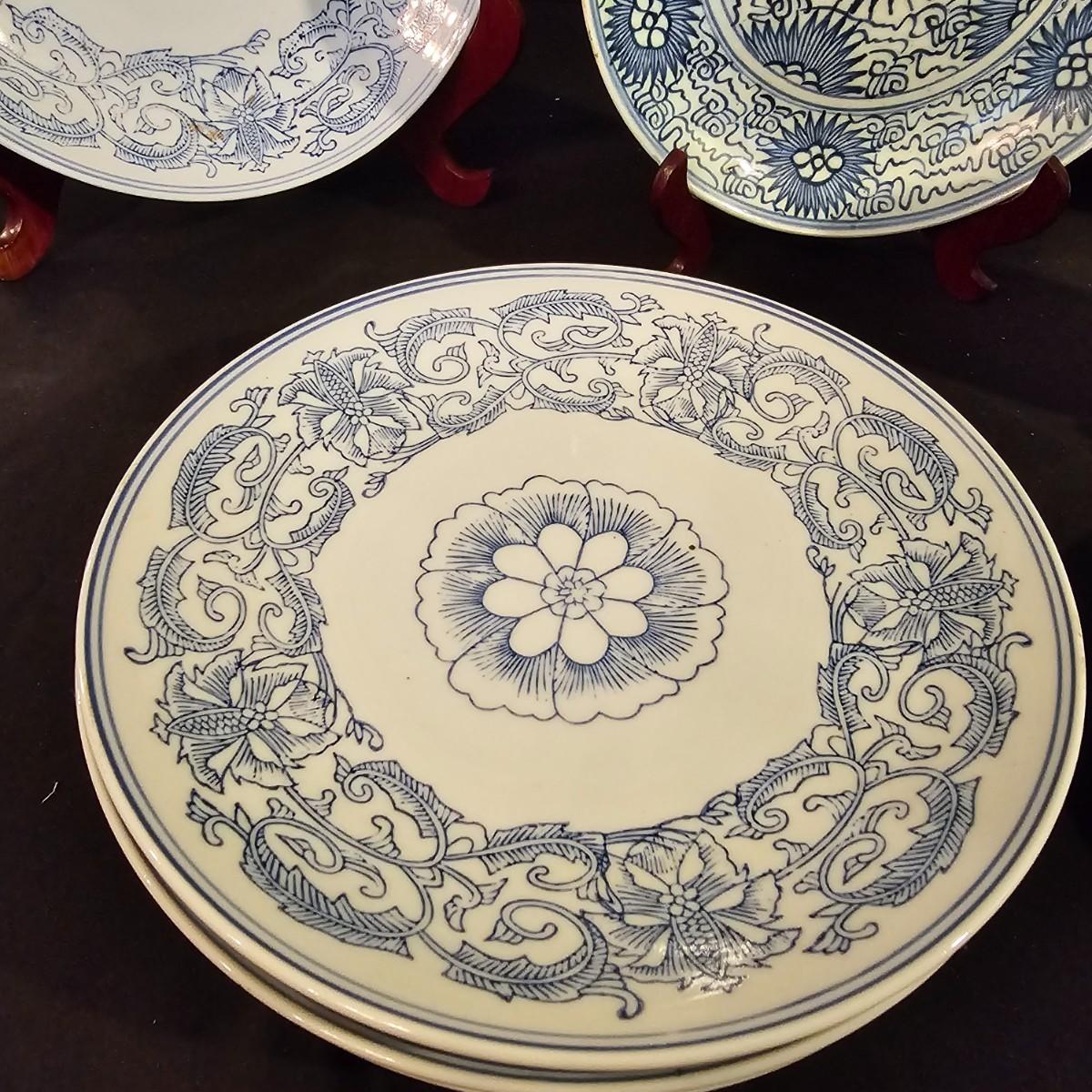 Assortment of blue Chinese plates of various sizes. Four 6.5" D, two 9" D and nine 10" D plates. Variations in pattern and color intensity, some itels marked 'Made in China', others with Chinese idiogram markings. Minor nicks and chips. Also includes six wooden plate stands, three 12", two 8" and one 6". See photos for details. Local pickup only.