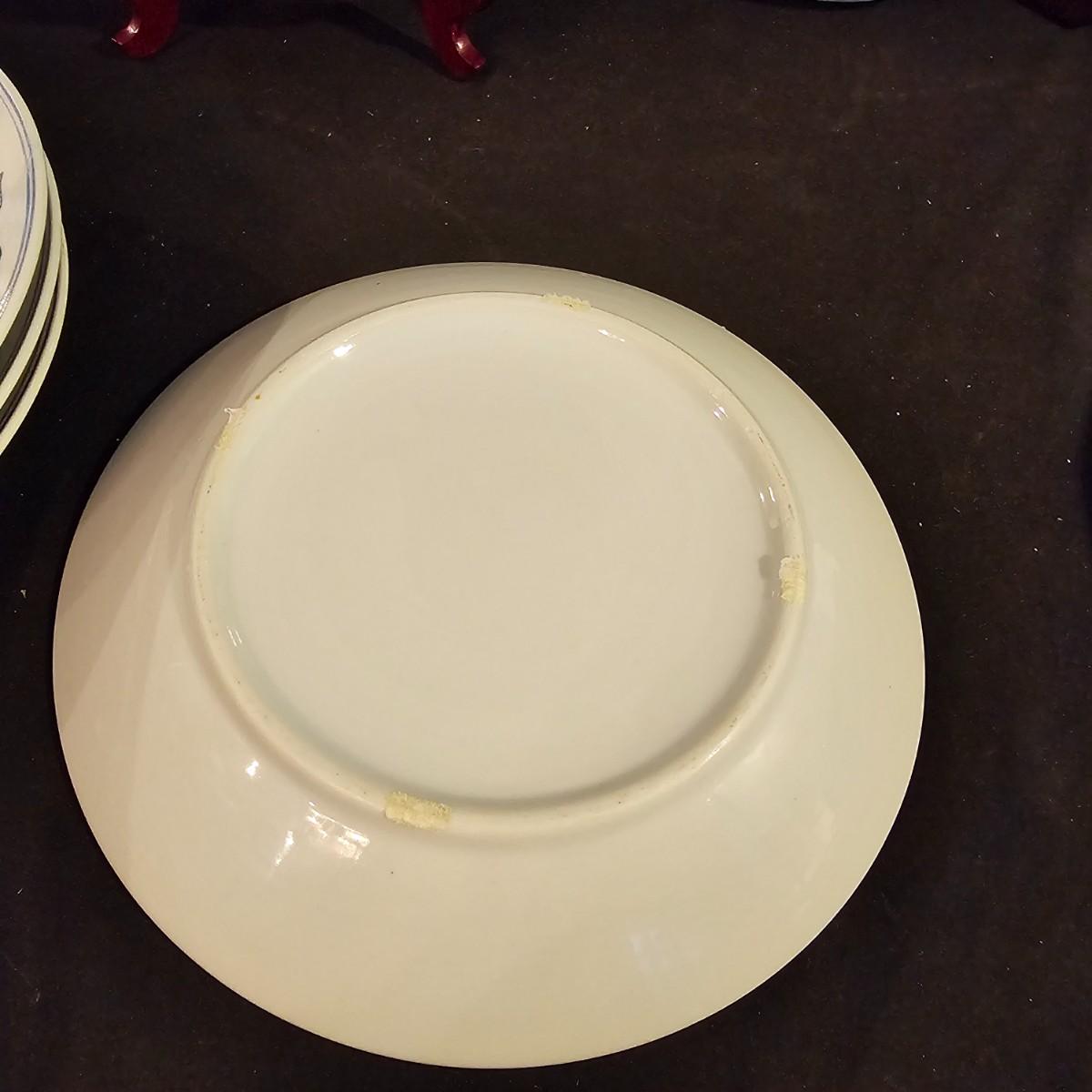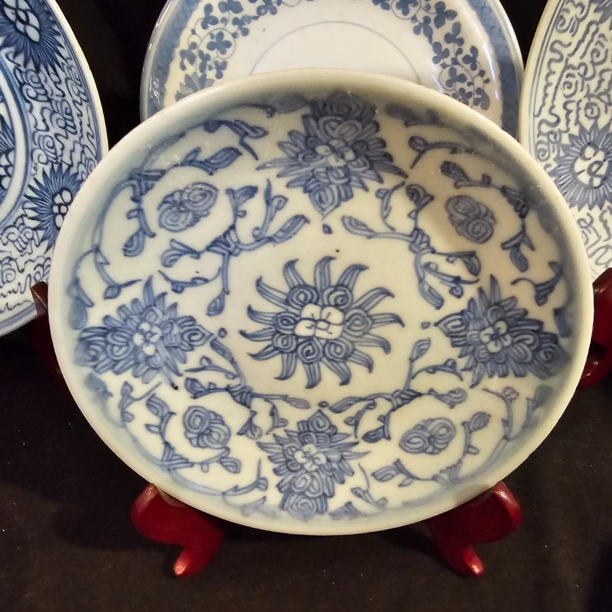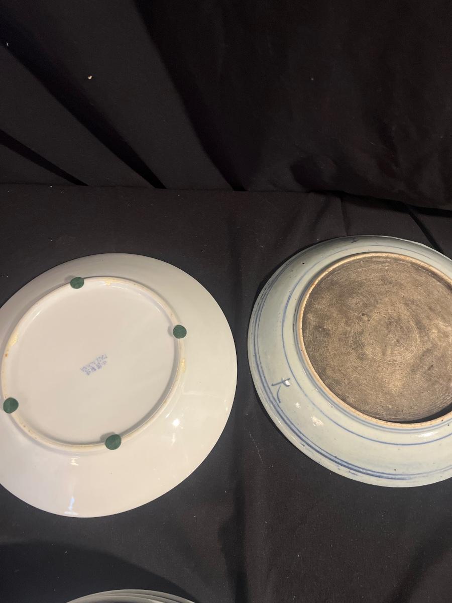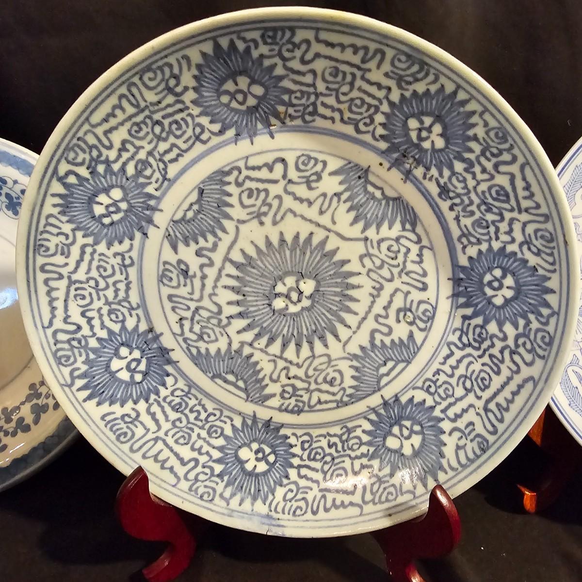 Assortment of blue Chinese plates of various sizes. Four 6.5" D, two 9" D and nine 10" D plates. Variations in pattern and color intensity, some itels marked 'Made in China', others with Chinese idiogram markings. Minor nicks and chips. Also includes six wooden plate stands, three 12", two 8" and one 6". See photos for details. Local pickup only.