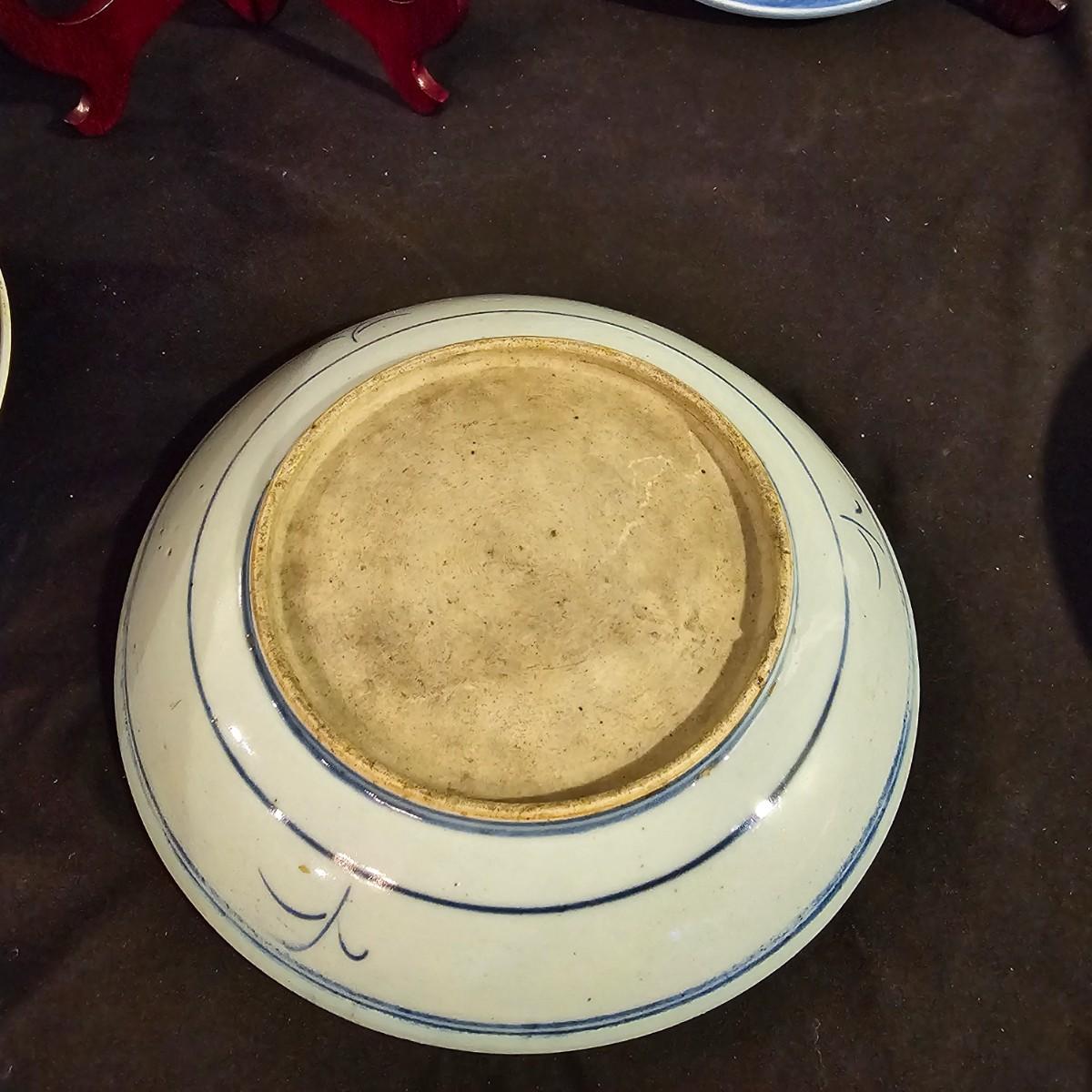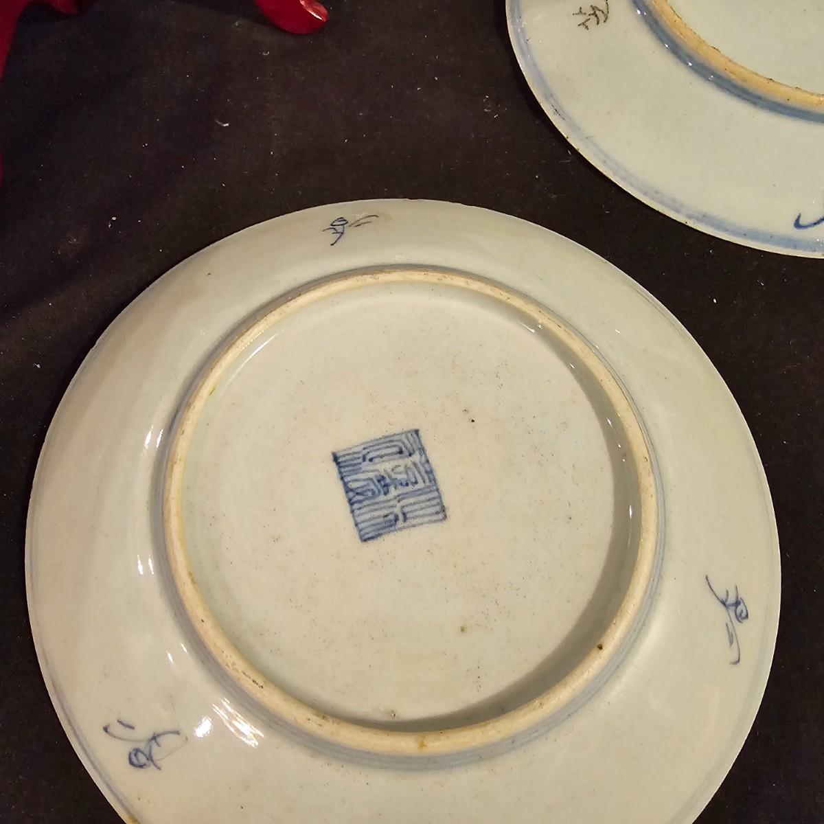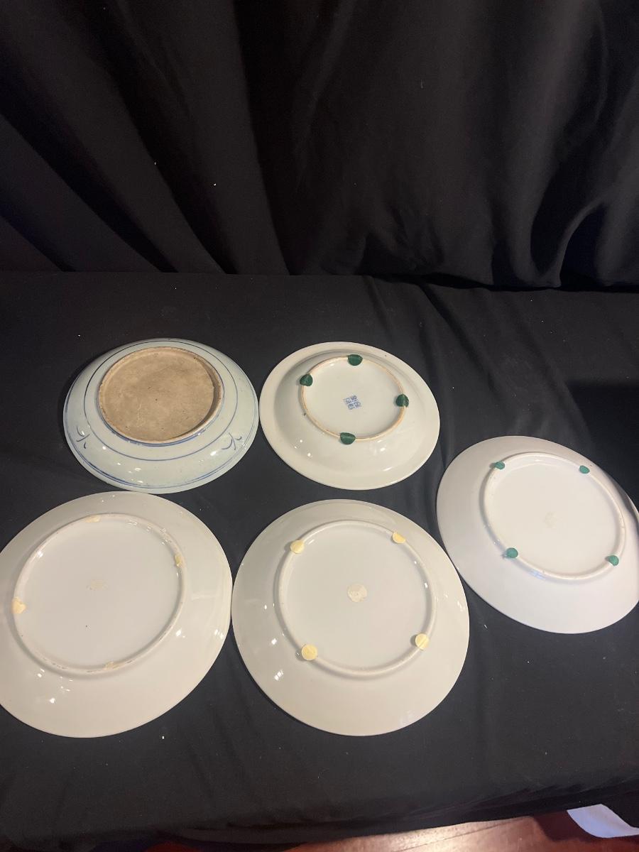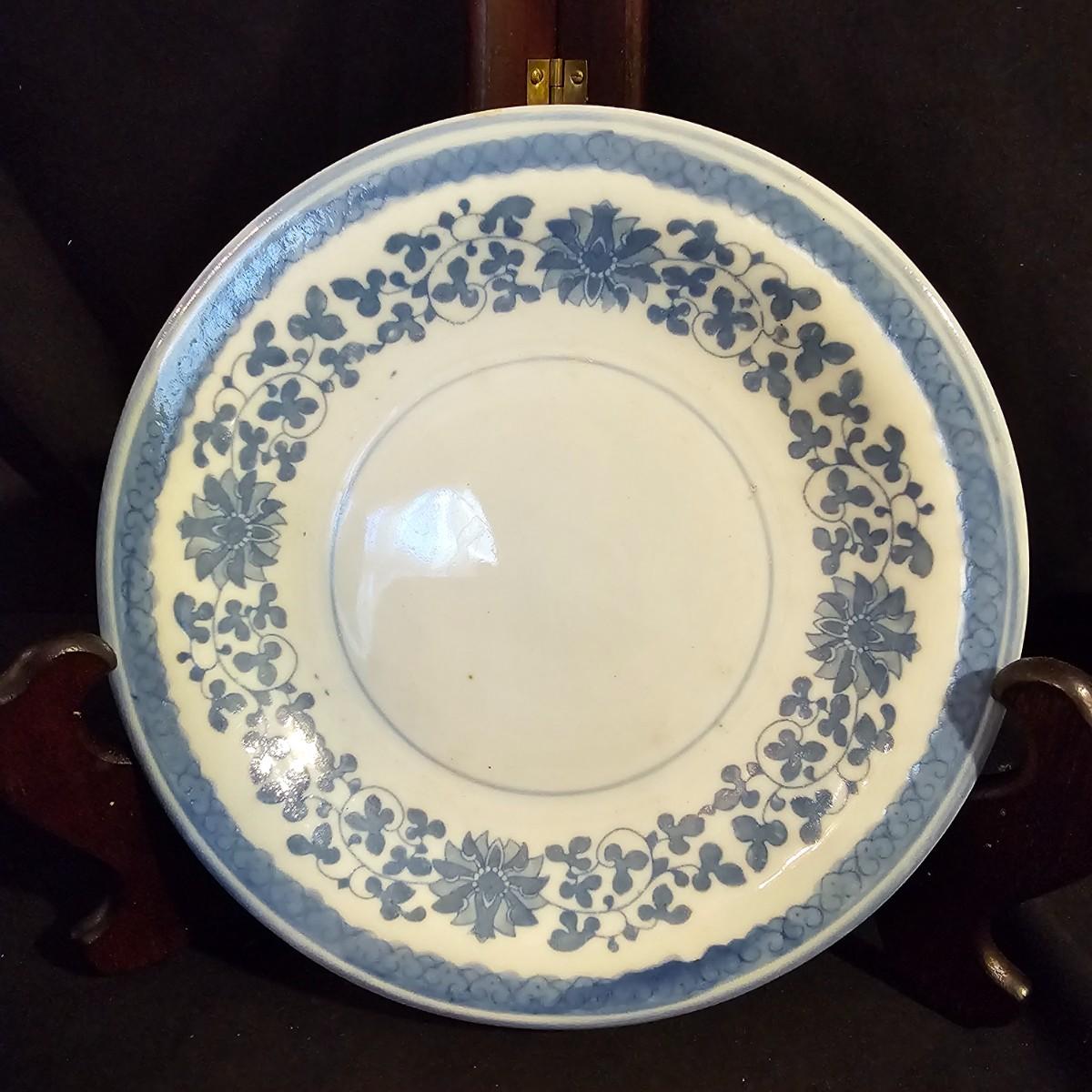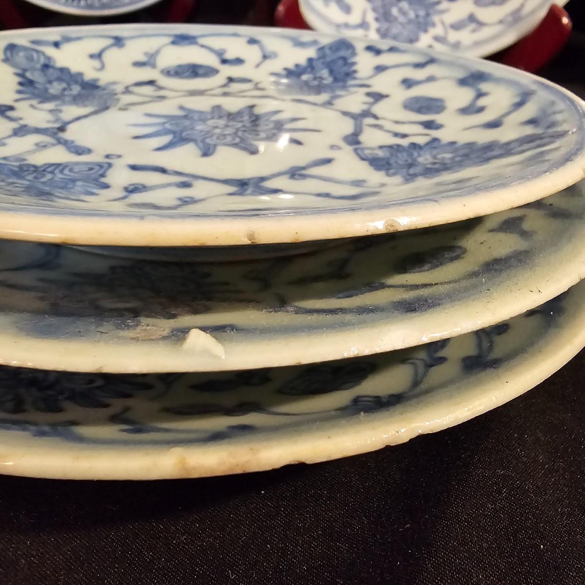 Assortment of blue Chinese plates of various sizes. Four 6.5" D, two 9" D and nine 10" D plates. Variations in pattern and color intensity, some itels marked 'Made in China', others with Chinese idiogram markings. Minor nicks and chips. Also includes six wooden plate stands, three 12", two 8" and one 6". See photos for details. Local pickup only.