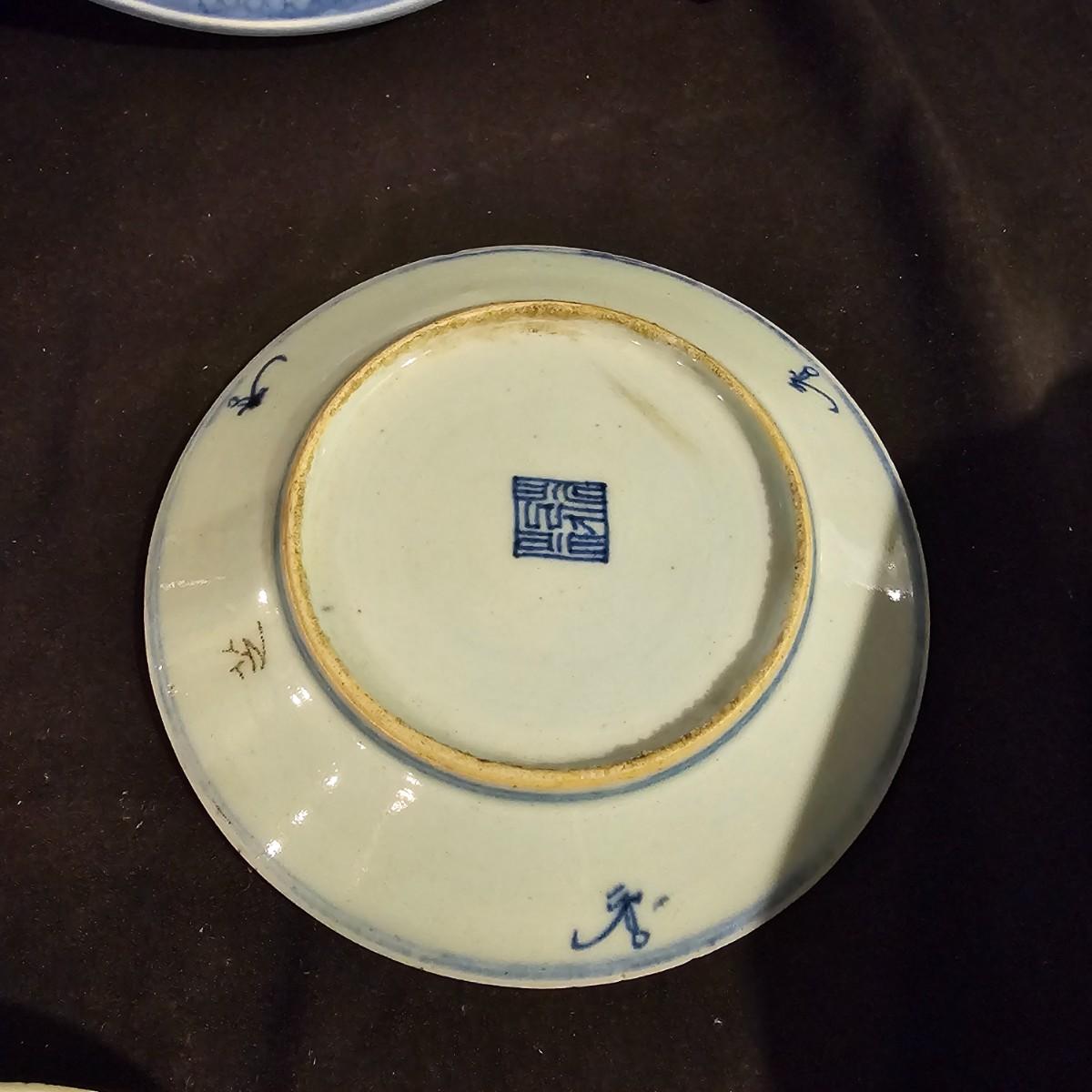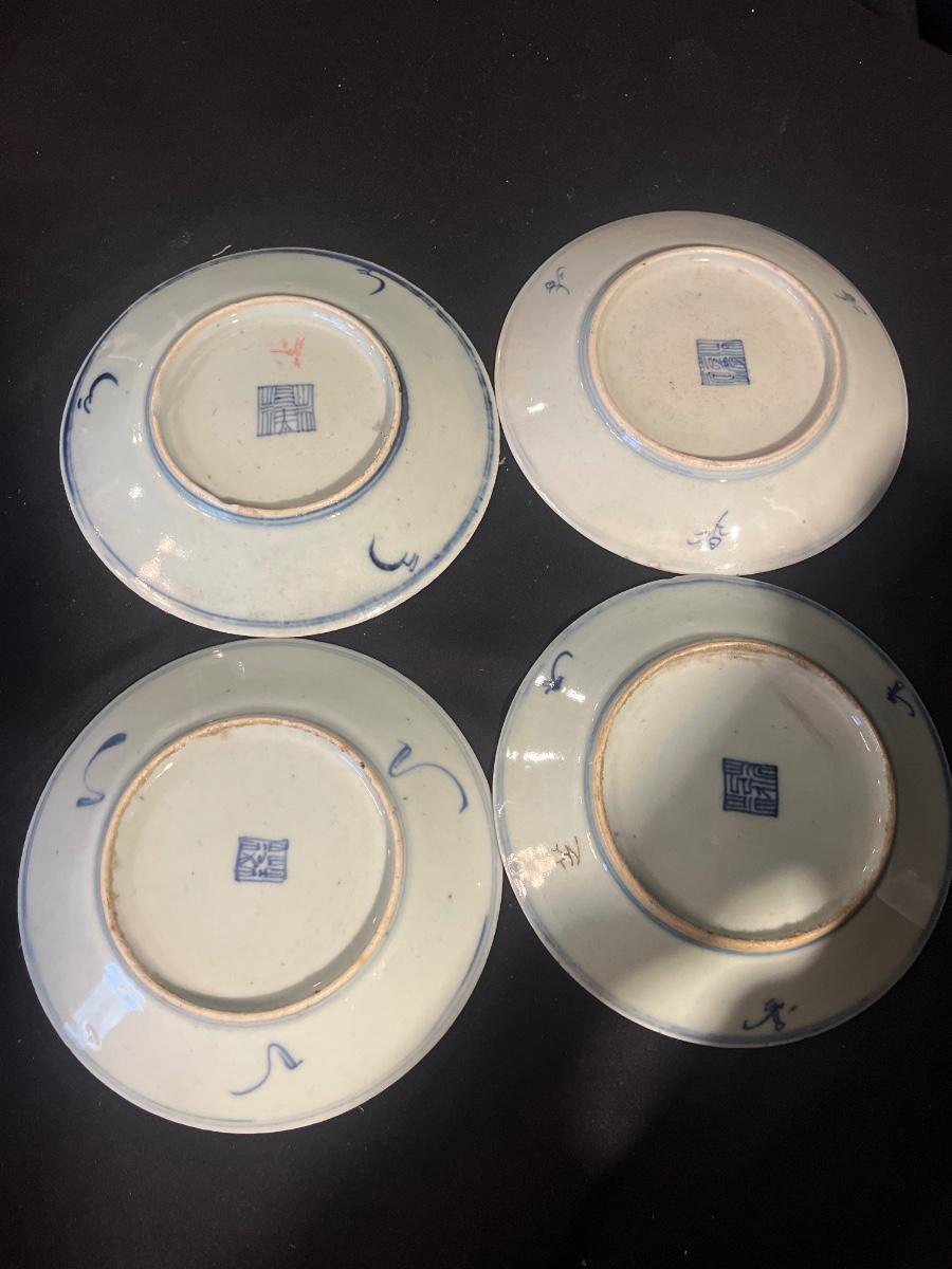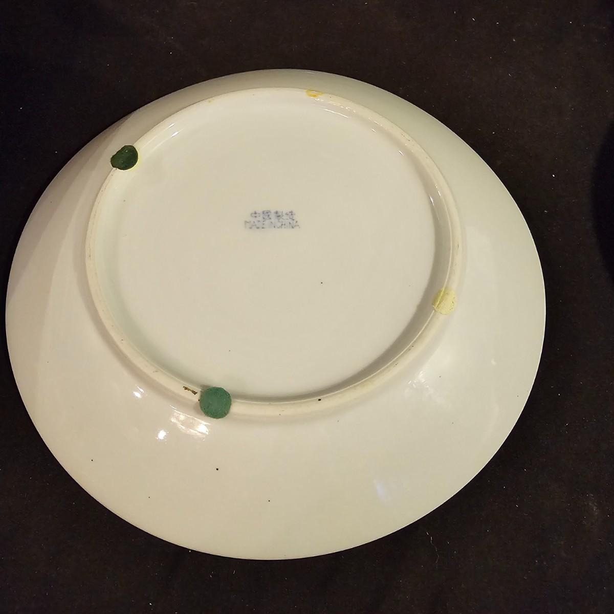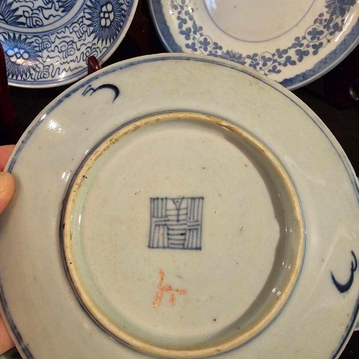 Assortment of blue Chinese plates of various sizes. Four 6.5" D, two 9" D and nine 10" D plates. Variations in pattern and color intensity, some itels marked 'Made in China', others with Chinese idiogram markings. Minor nicks and chips. Also includes six wooden plate stands, three 12", two 8" and one 6". See photos for details. Local pickup only.
