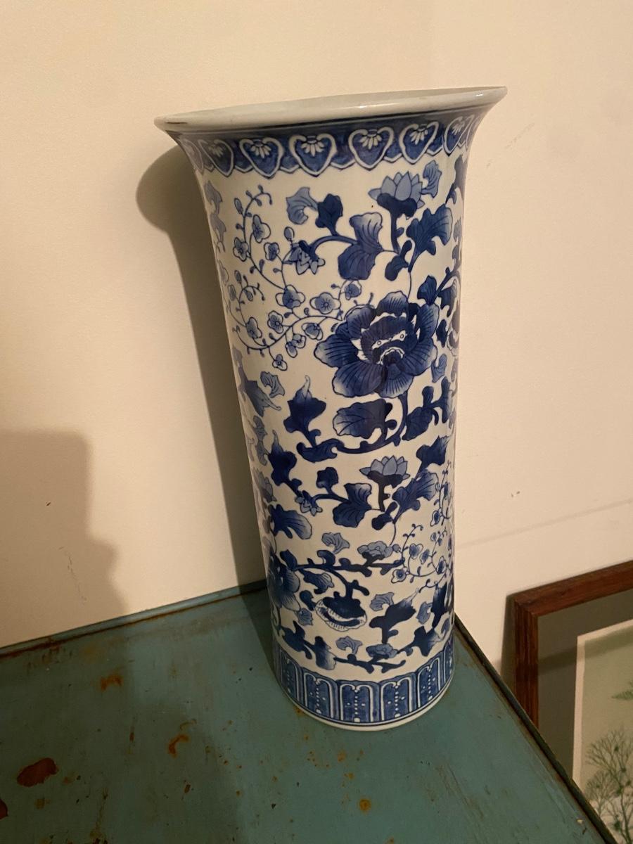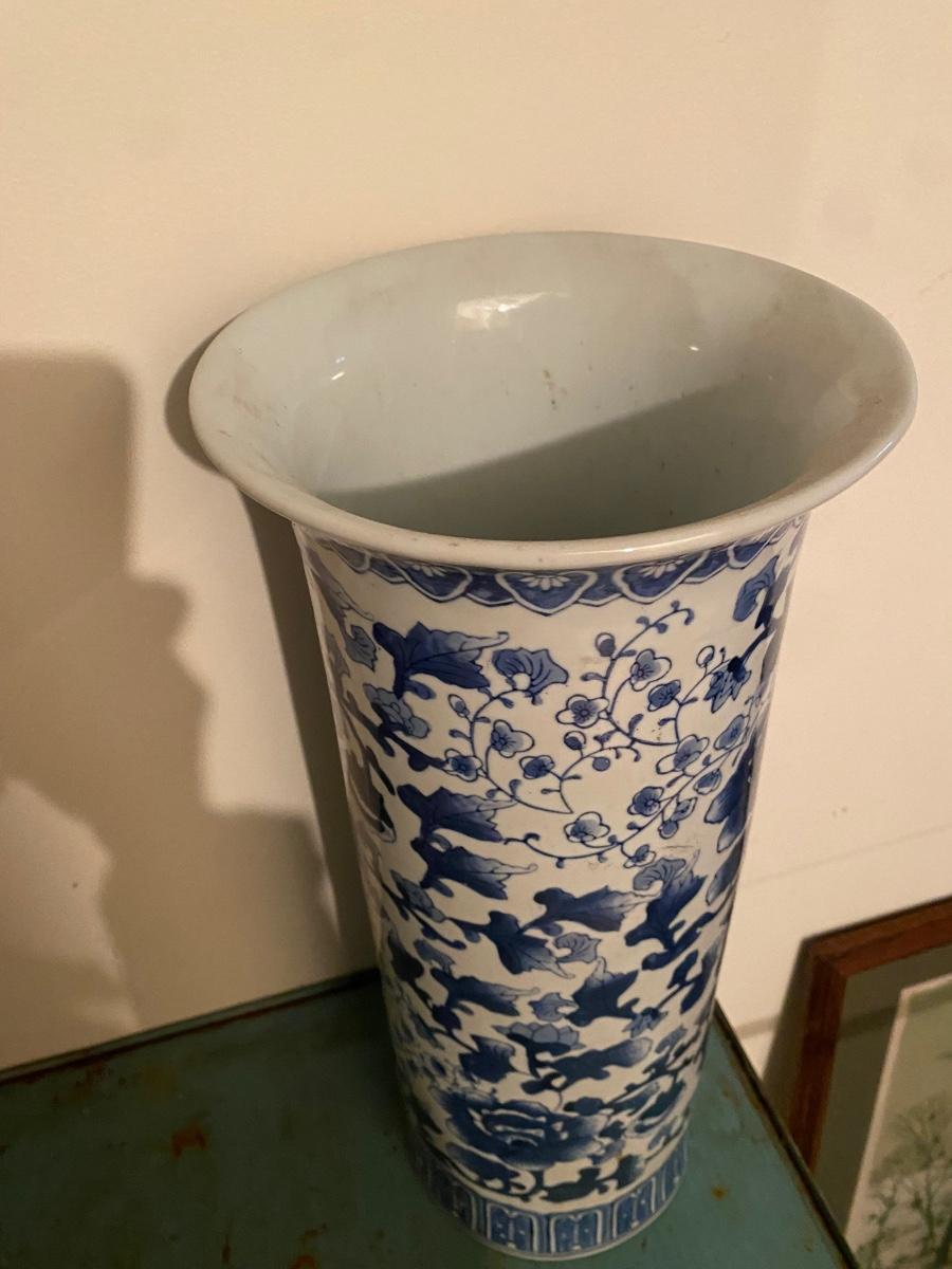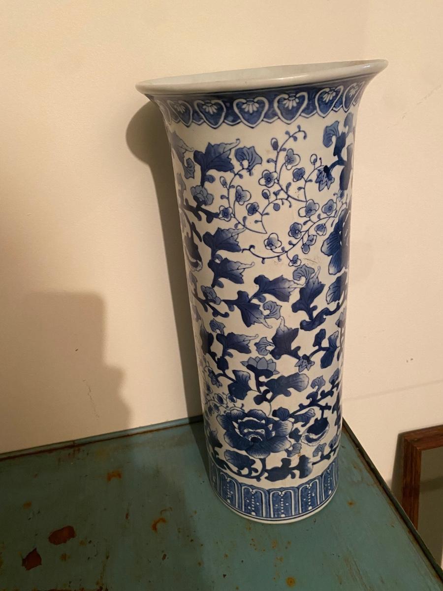 Vintage Chinese Porcelain Blue And White Floral Beaker Vase, 17" high, 8 " diameter.