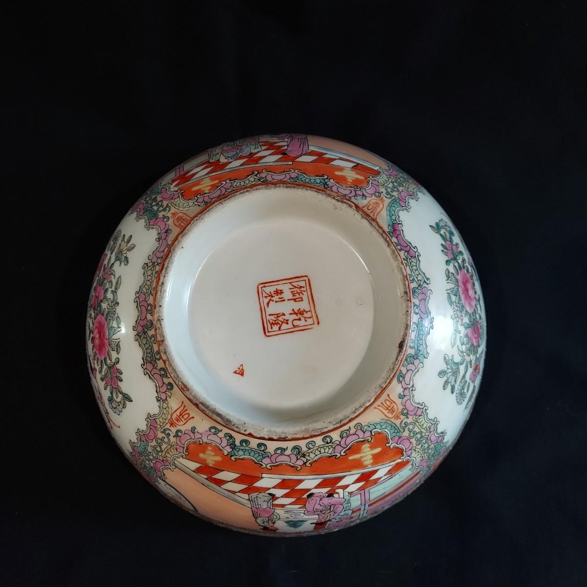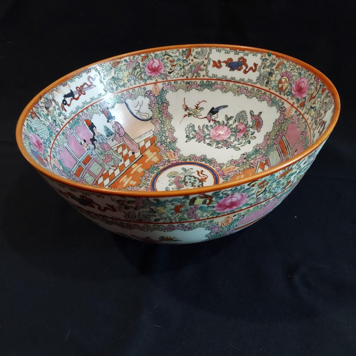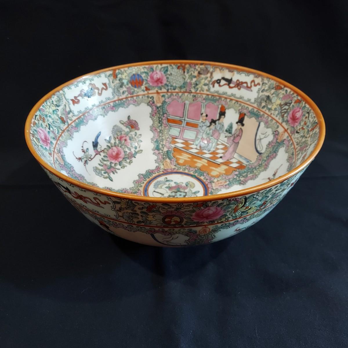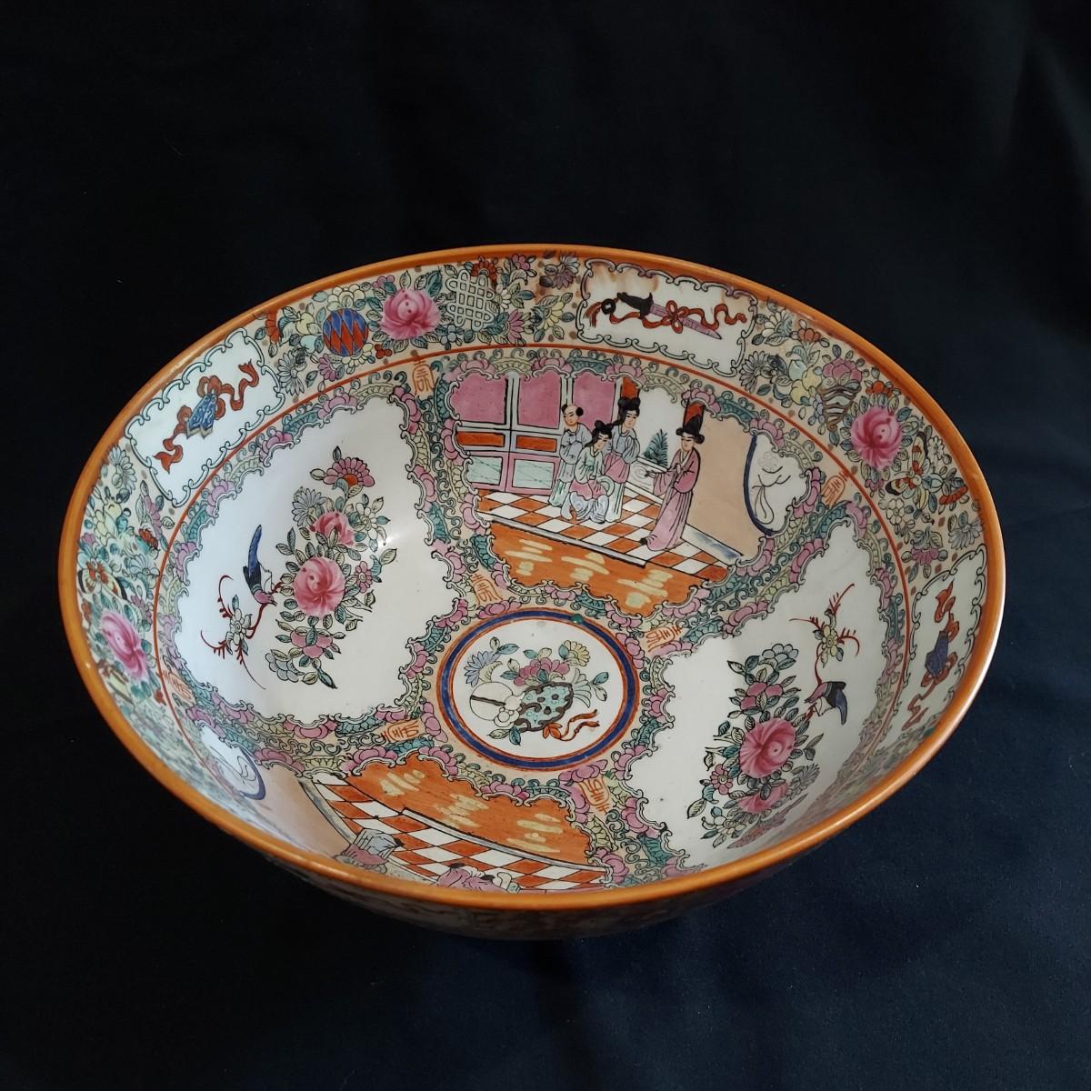 Vintage Chinese porcelain rose medallion bowl. It has a 12" diameter and is 6" deep. Shipping available.