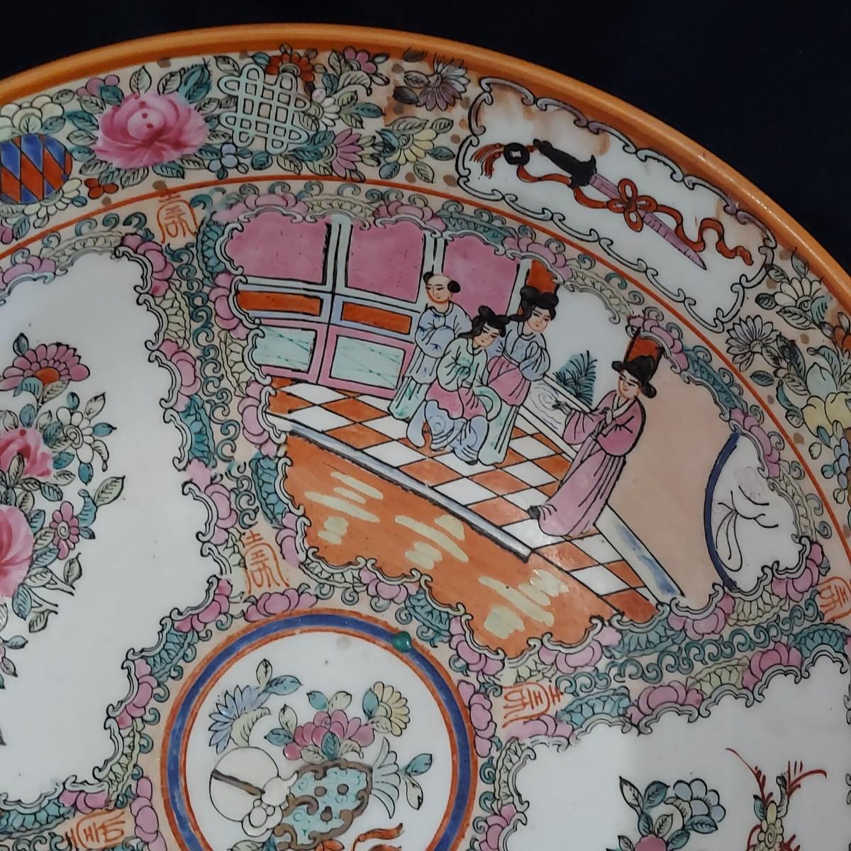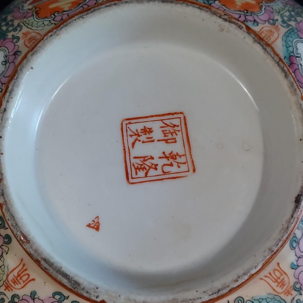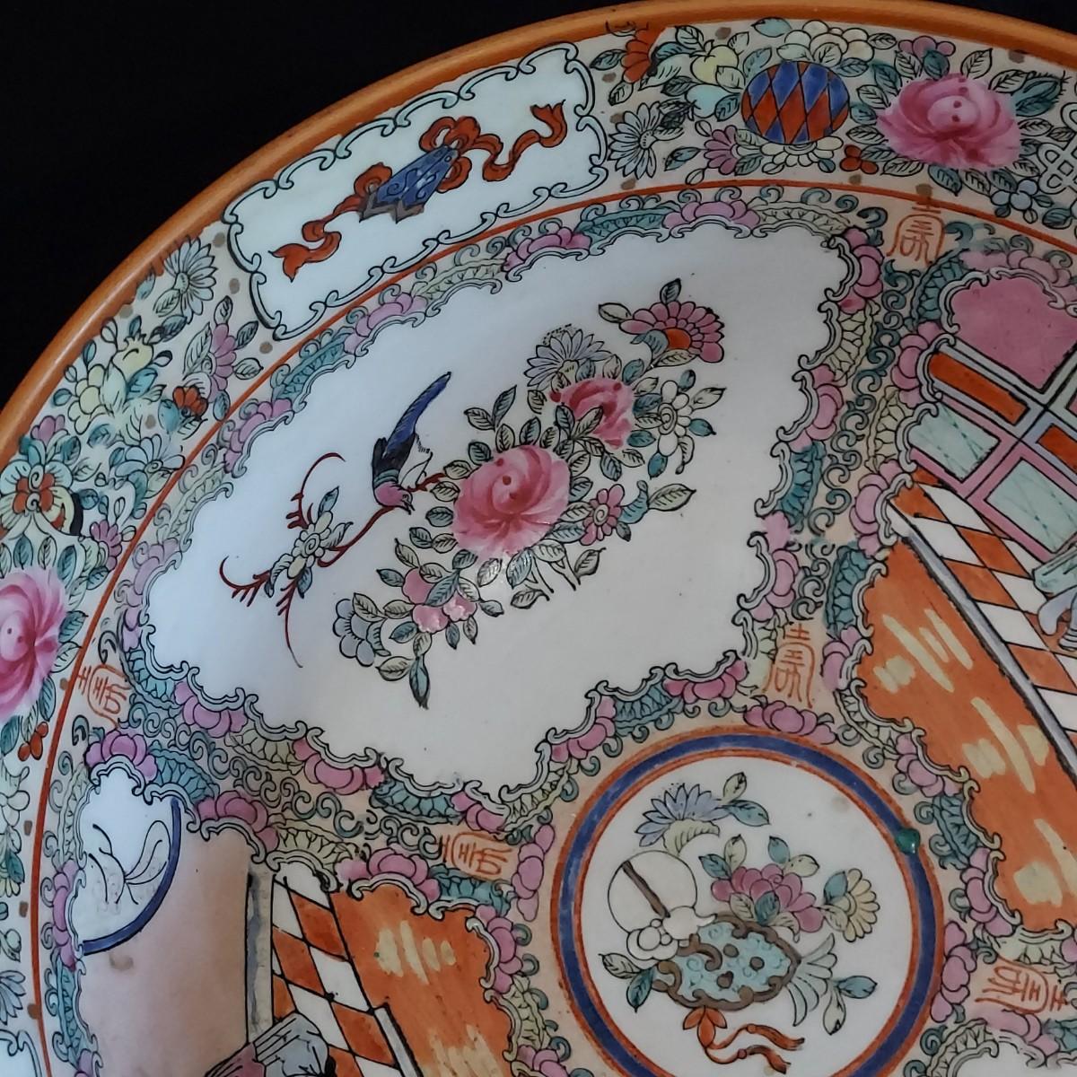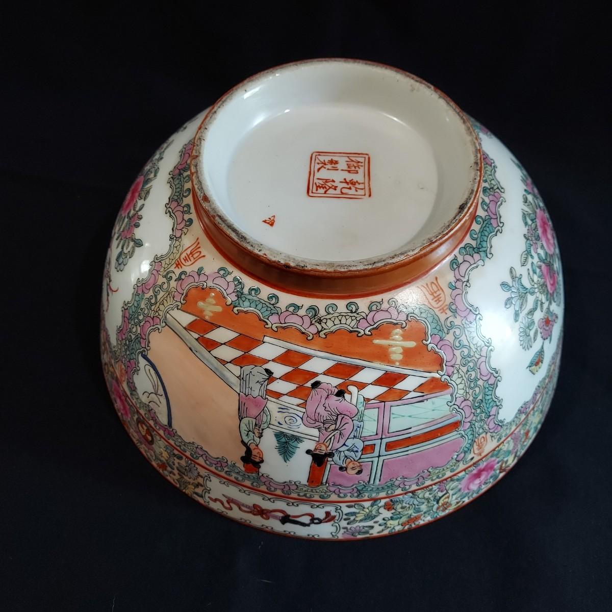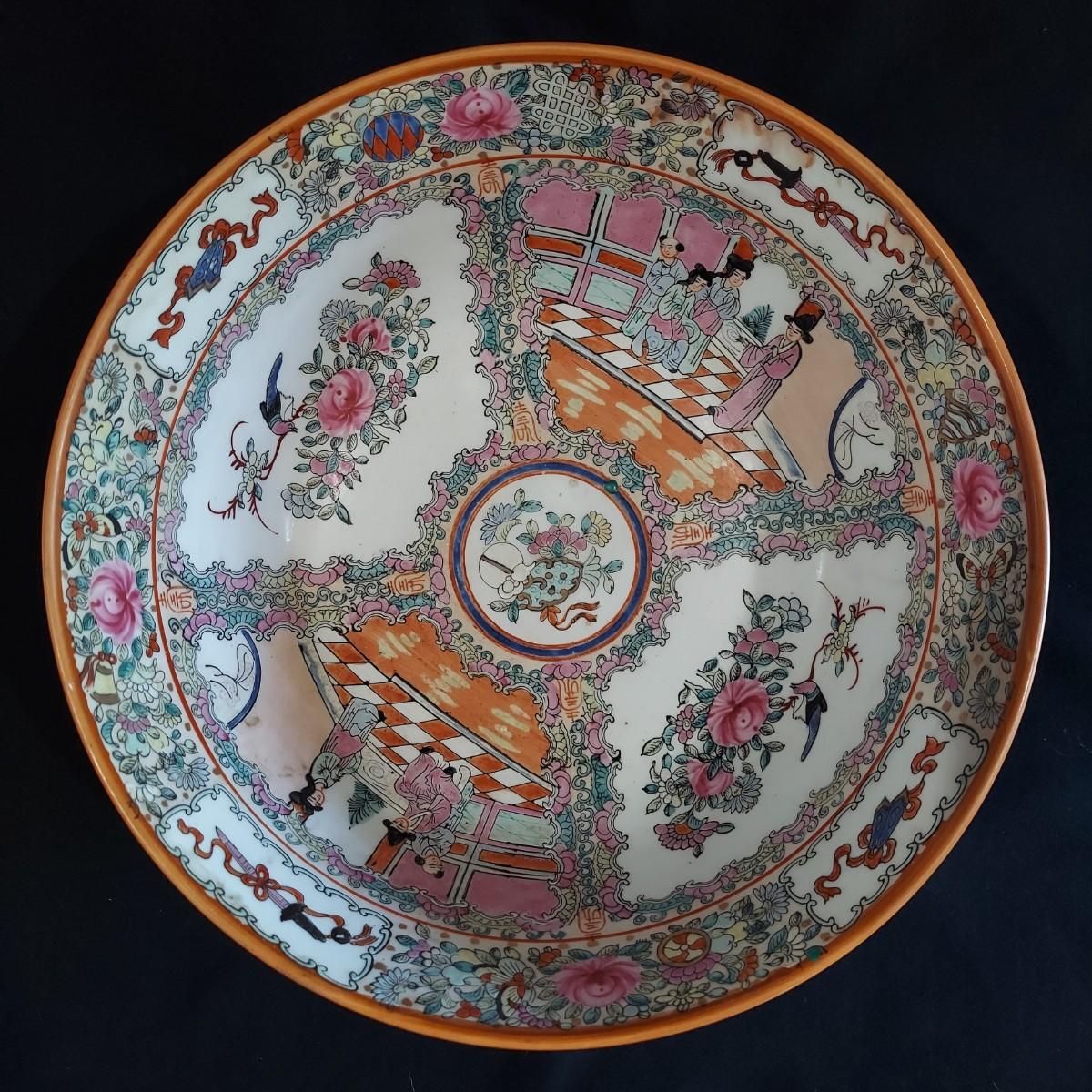 Vintage Chinese porcelain rose medallion bowl. It has a 12" diameter and is 6" deep. Shipping available.
