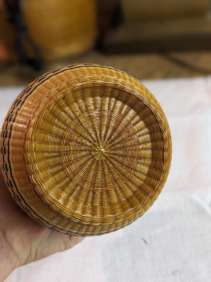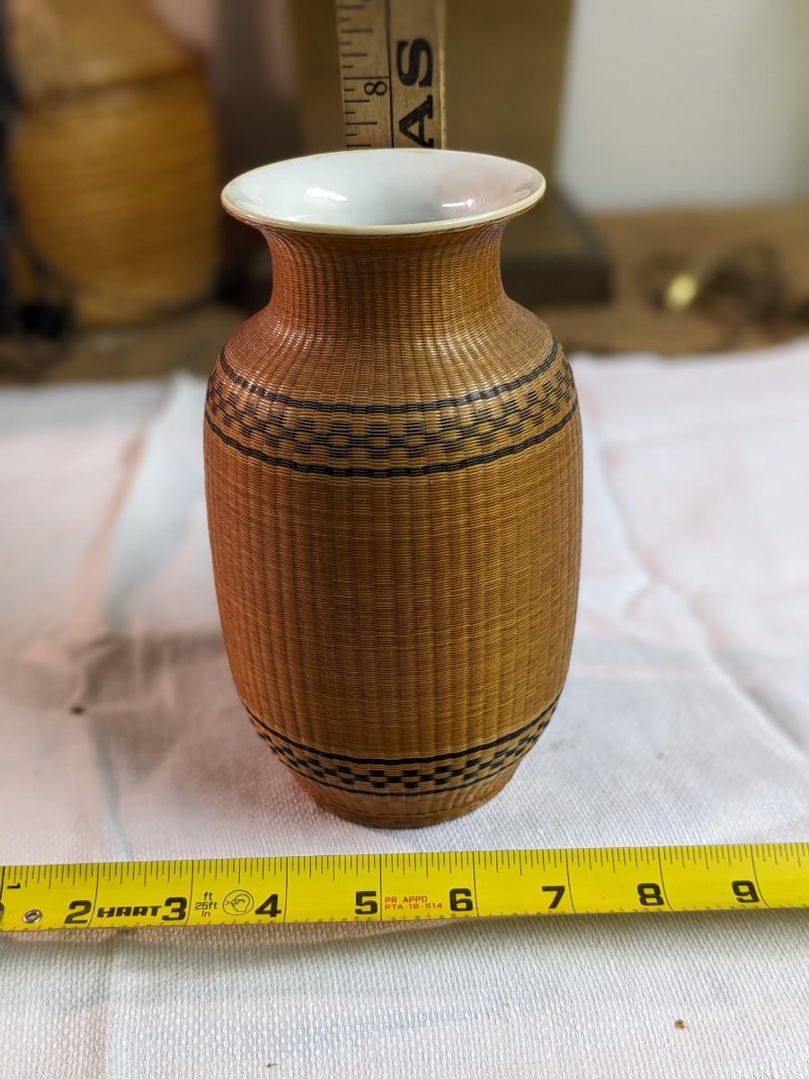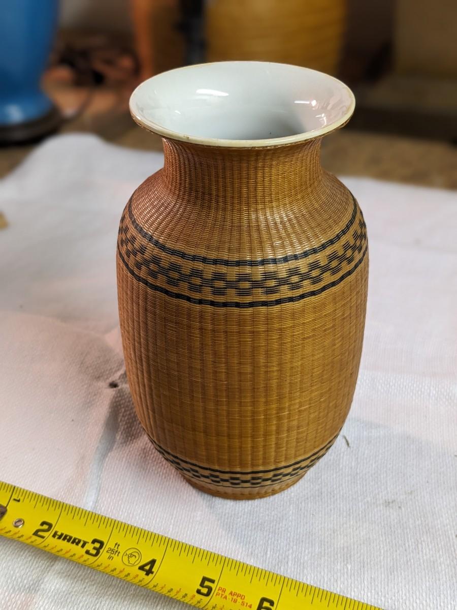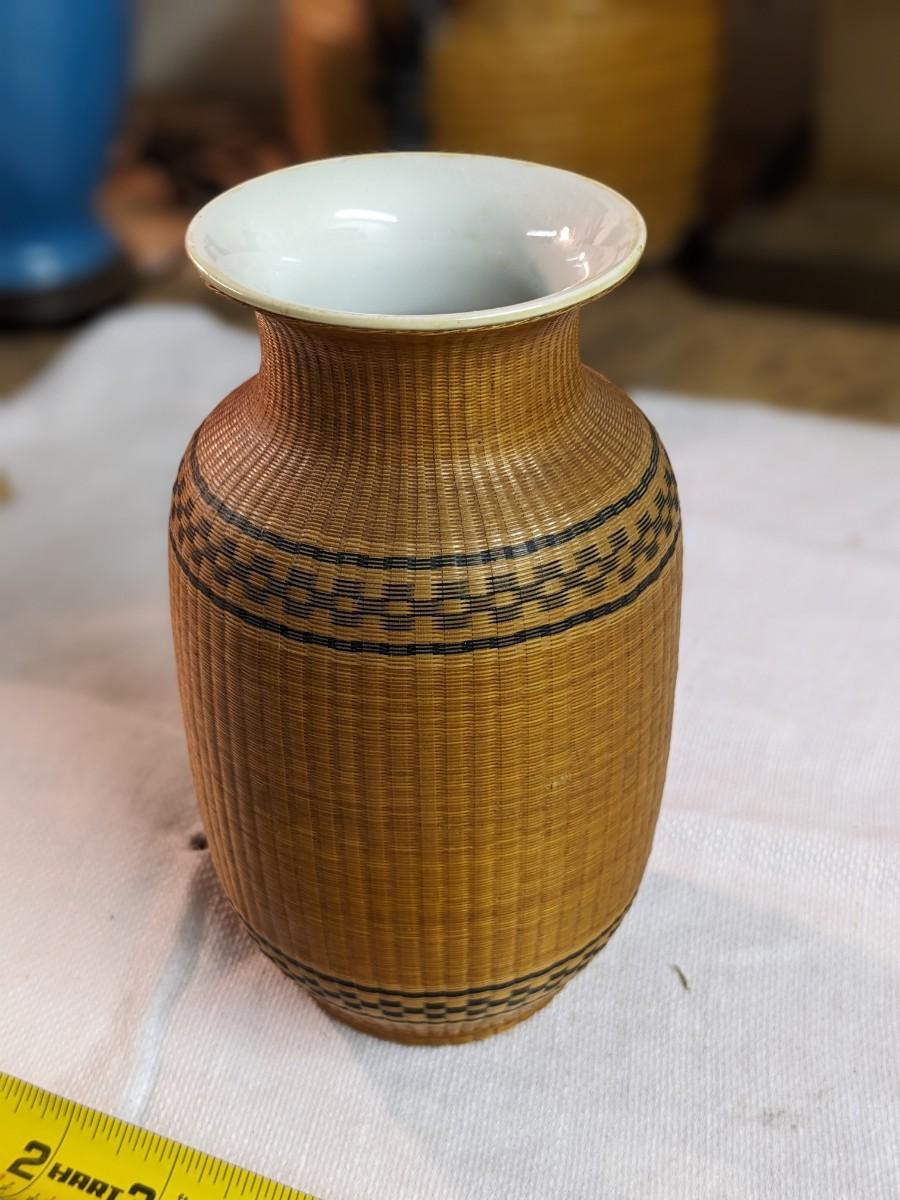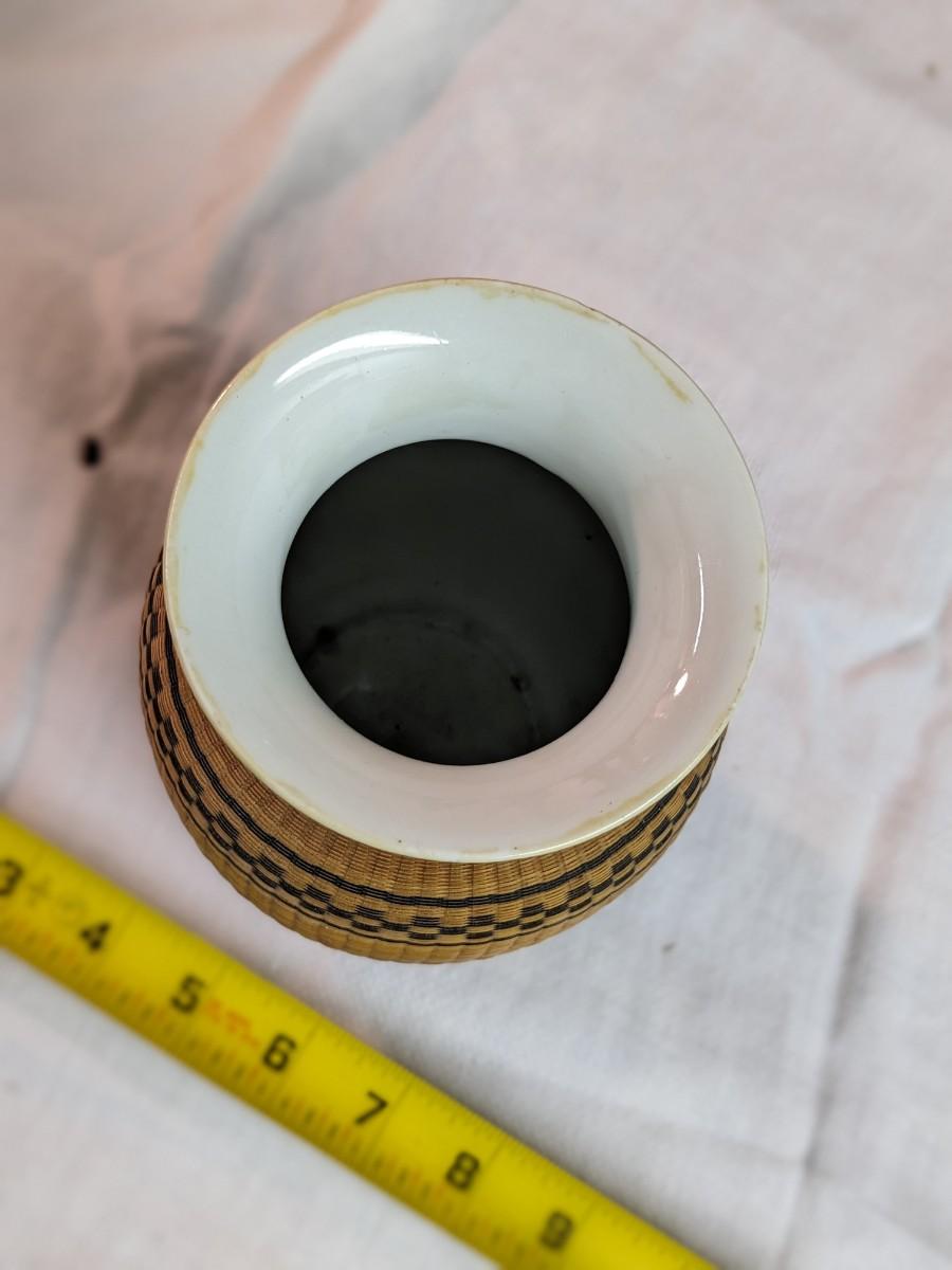 Vintage Chinese Porcelain Vase Covered in Woven Bamboo